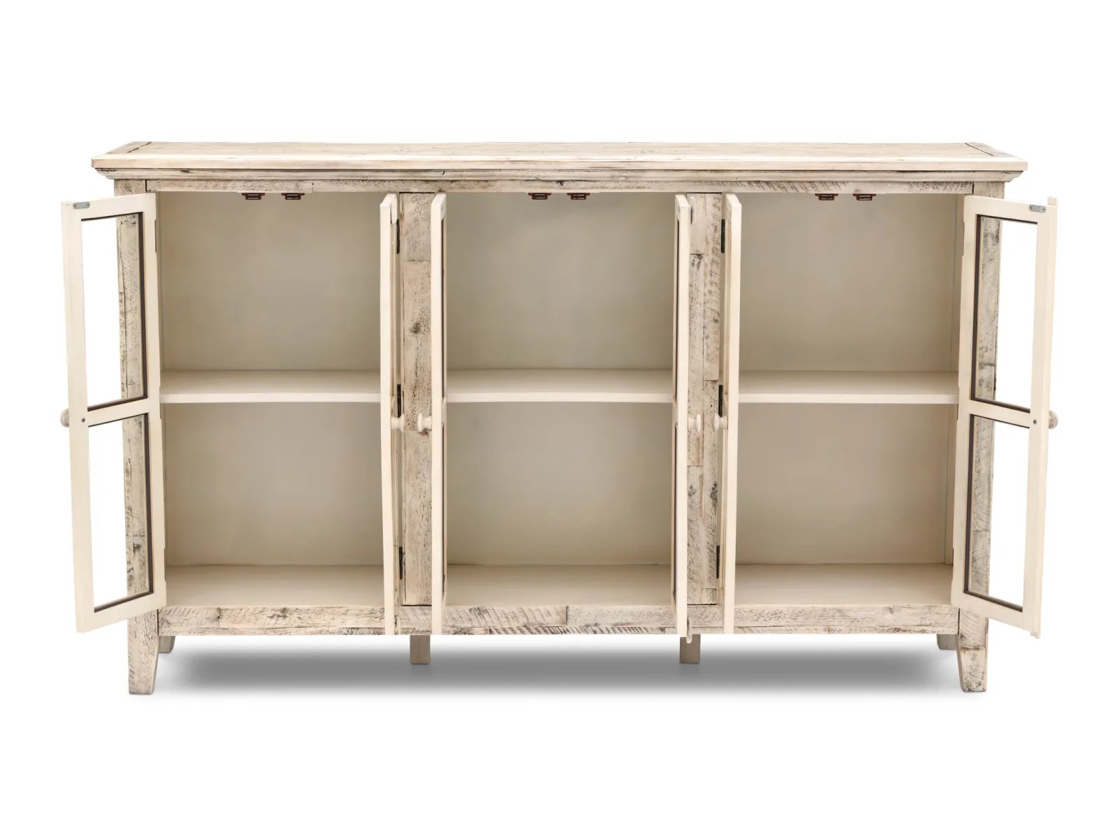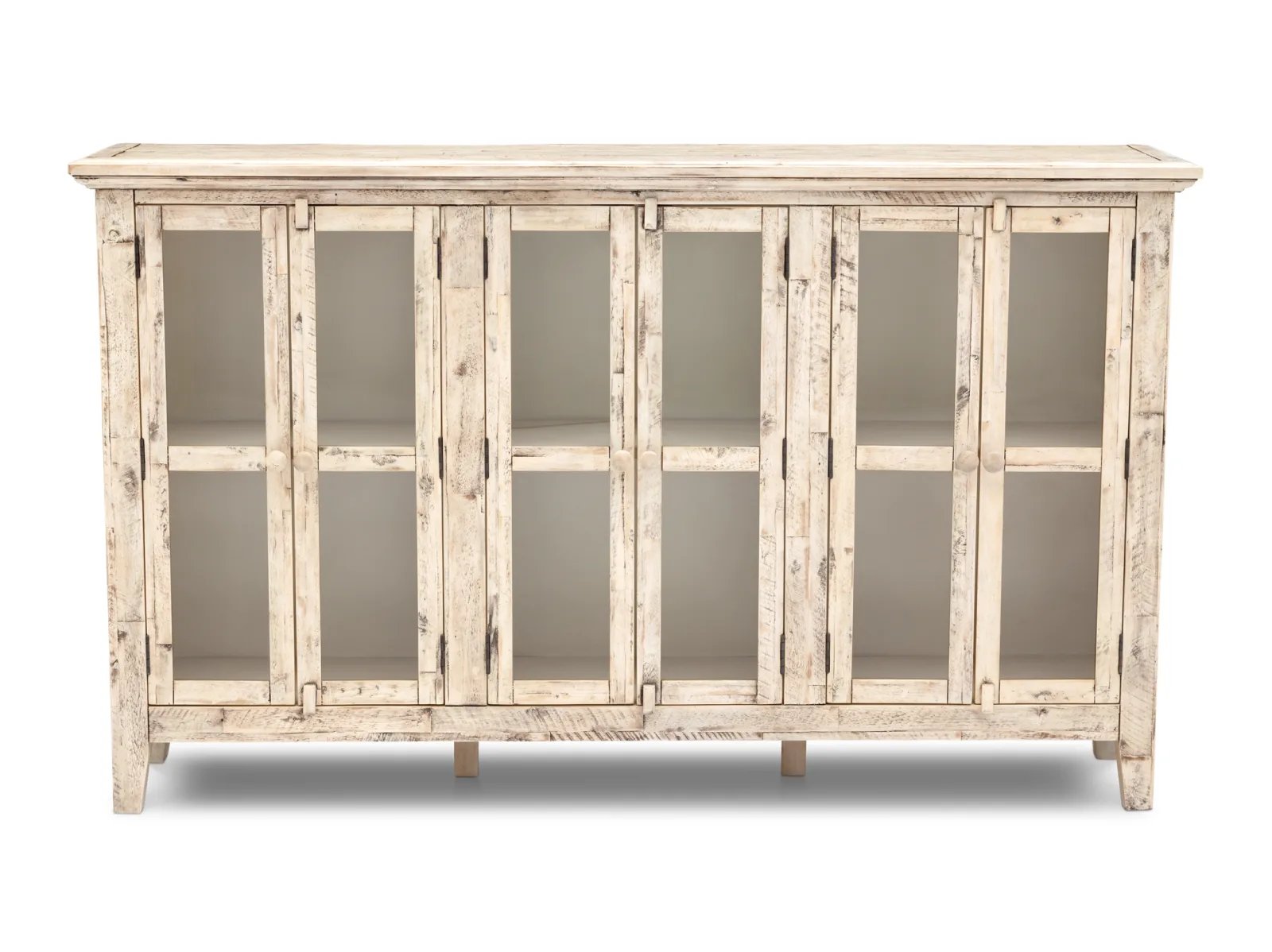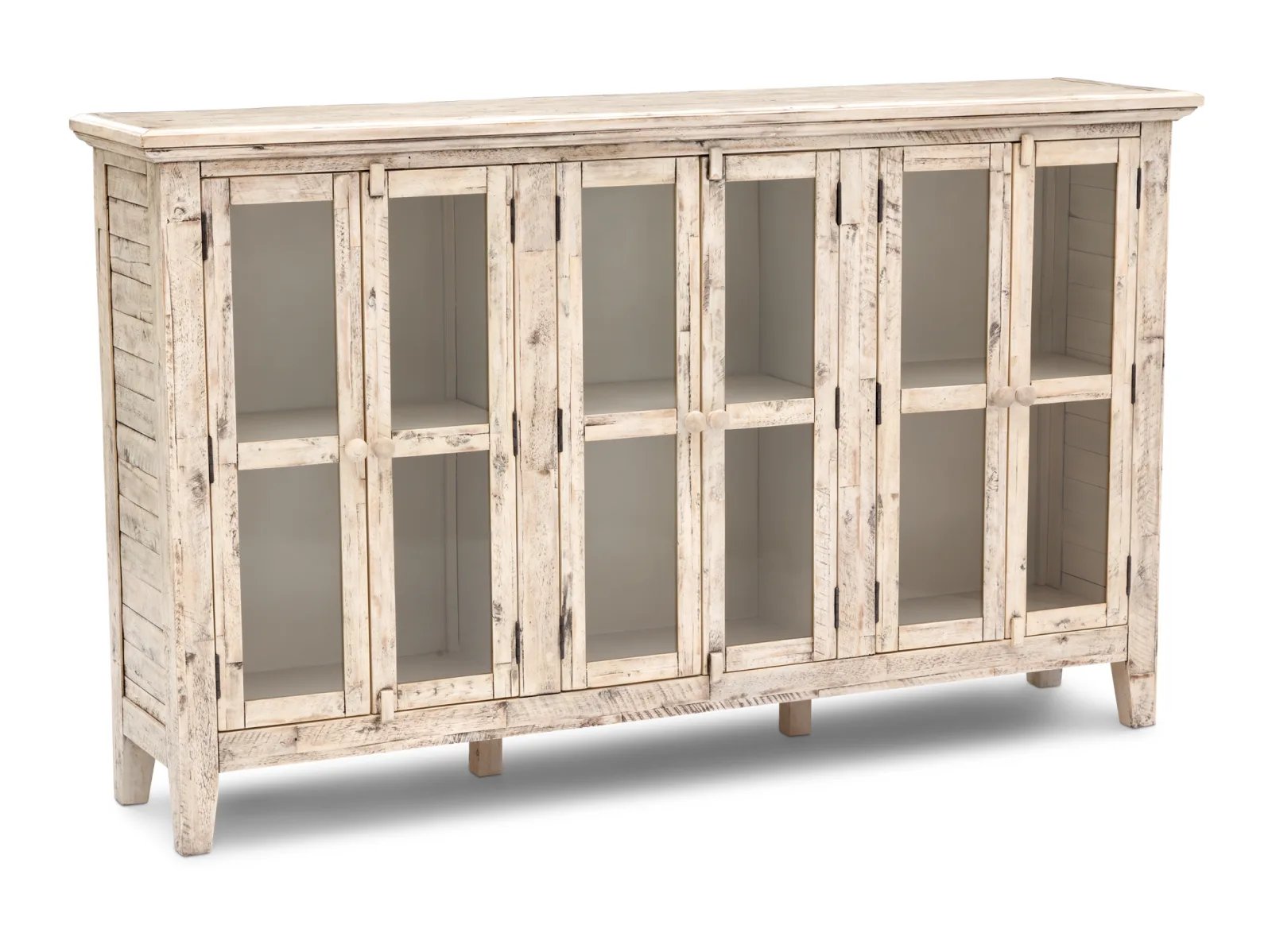 With a naturally worn look and tempered glass paneled doors, this versatile piece can easily store linens and dishes as well as feature photos, books, and other treasures you cherish. Made of solid acacia in a weathered white lacquer finish, this sideboard features a coastal and rustic appearance and a narrow footprint for tight spaces like hallways and entryways. Adjustable interior shelves provide convenient storage inside, and tasteful distressing and a subtle finish add character. Bring home the Rustic Shores today for years of unrivaled beauty.