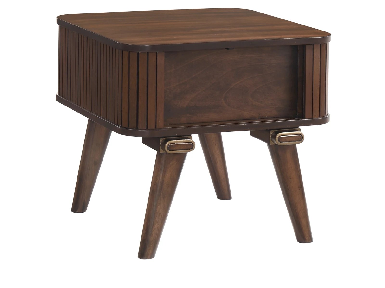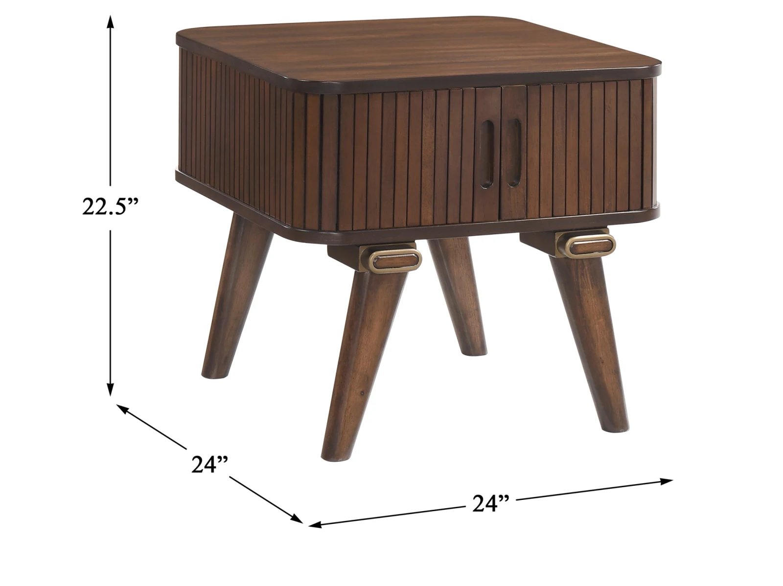 & Free ShippingComplete your seating area with the Rutledge End Table, a square accent piece that captures the essence of mid-century modern design. Its walnut veneer and finish provide a classic, versatile hue, while the modified A-frame base and refined detailing add character. The unique tambour doors wrap around to reveal a hidden storage compartment, offering a convenient spot for remotes, books, or other essentials. This end table is the perfect blend of vintage-inspired style and everyday practicality.