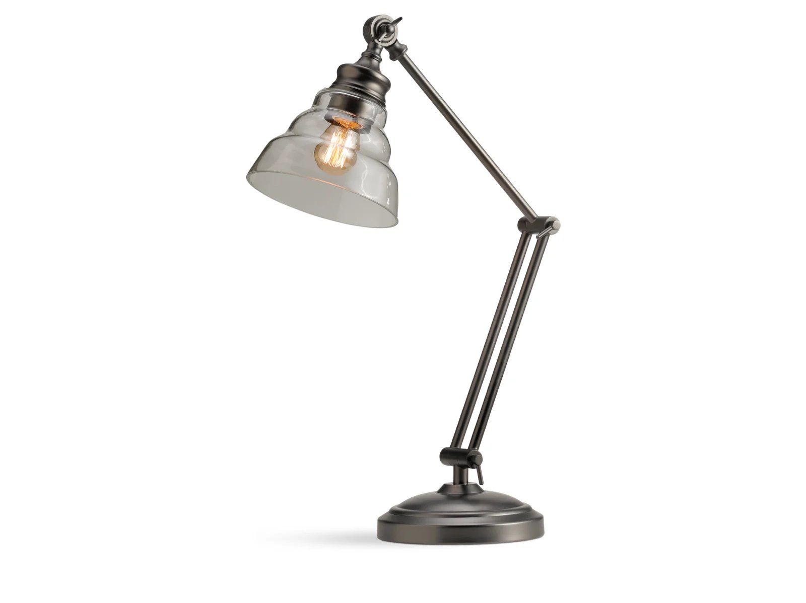 & Free ShippingPerfect for workspaces of all shapes and sizes, the Ryan Bronze Metal Table Lamp is the lighting solution you need. With a hinged bronze metal stem and round base, the Ryan lets you effortlessly move the clear glass shade around to better focus on the task at hand. Functional and savvy, the Ryan is ready to get the job done.