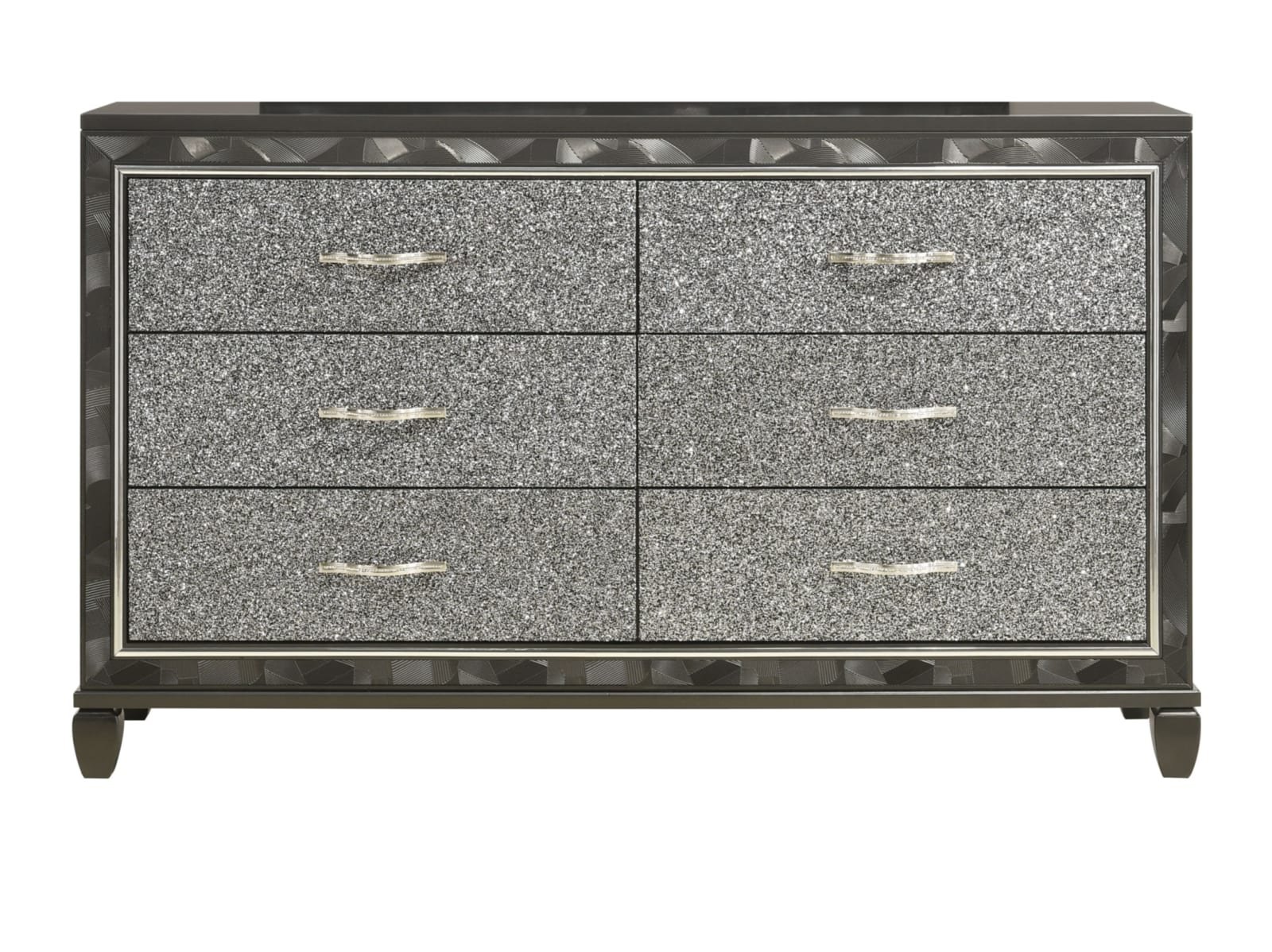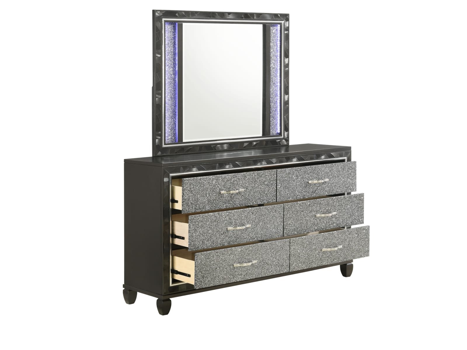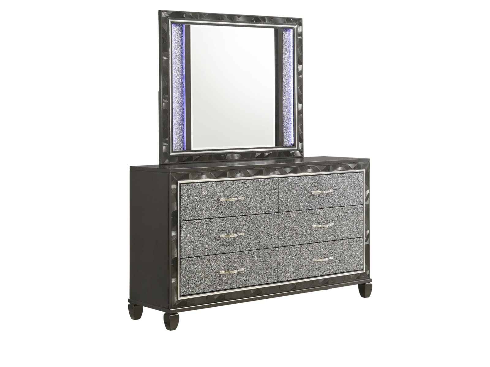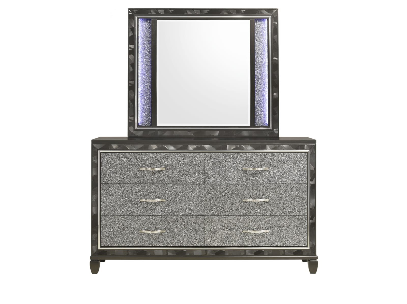 The Rydell Bedroom Collection is a mesmerizing blend of modern elegance and glamorous charm. Crafted with solid wood and MDF, this collection ensures durability and stability. The striking silver finish adds a touch of sophistication to each piece. The headboard, made of 80% faux leather and 10% cotton, creates a luxurious focal point in the room. The brushed steel face framing and glittered drawer fronts add a dazzling allure. The chrome pulls with rhinestone inlays exude opulence and style. The felt-lined top drawers provide a soft surface for delicate items, while the finished drawer interiors showcase meticulous attention to detail. The English dovetail construction and full extension ball-bearing glides ensure smooth and reliable operation. The crystal tufted, lighted headboard and mirror add a radiant ambiance to your space. With the Rydell Bedroom Collection, elevate your bedroom to new heights of elegance and glamour.