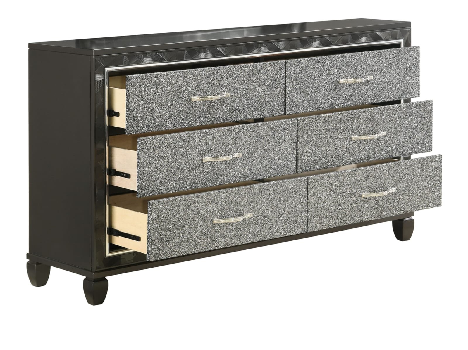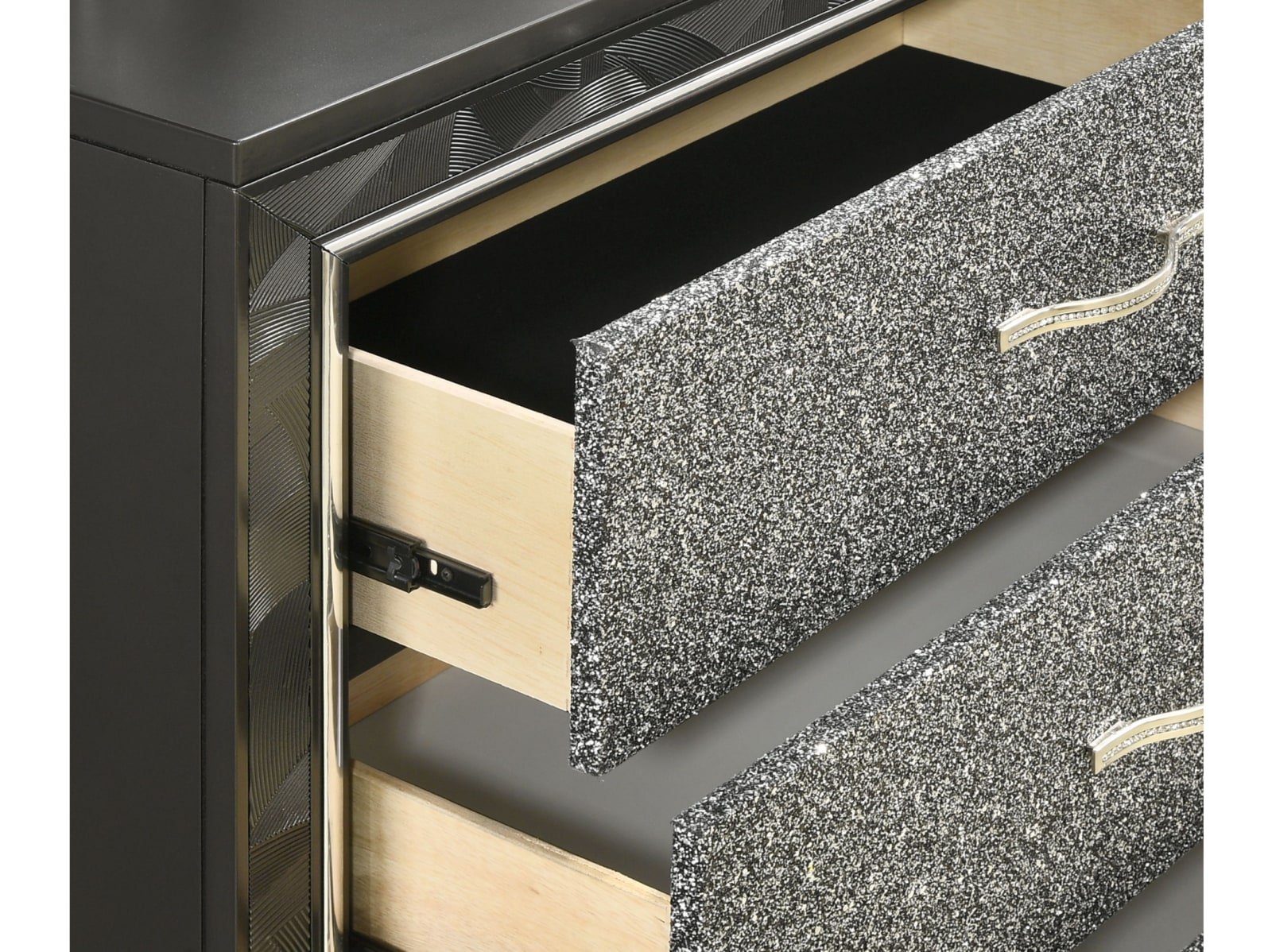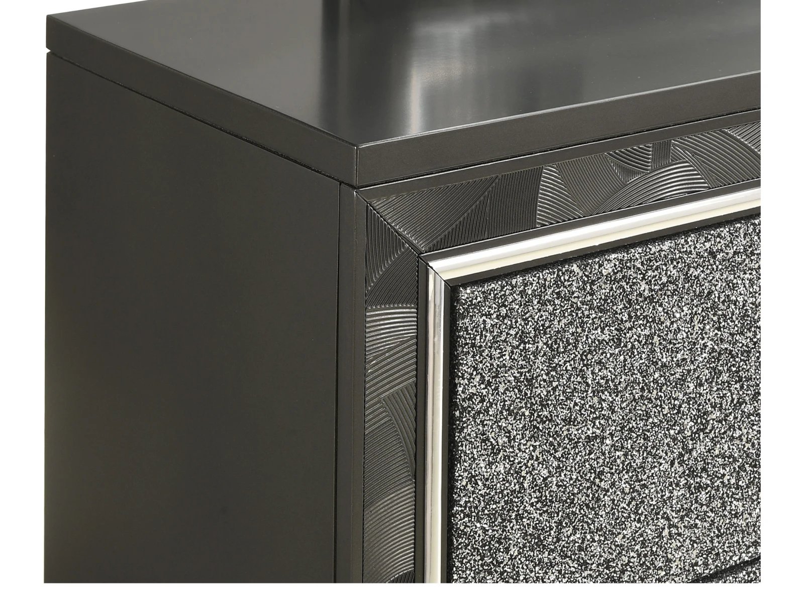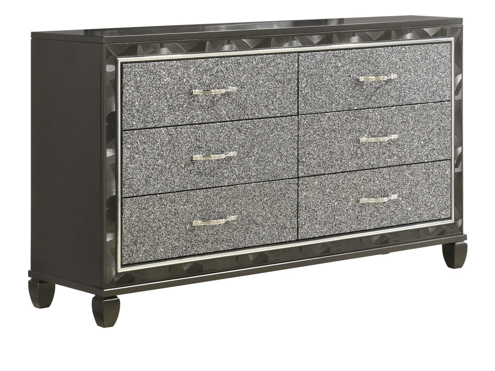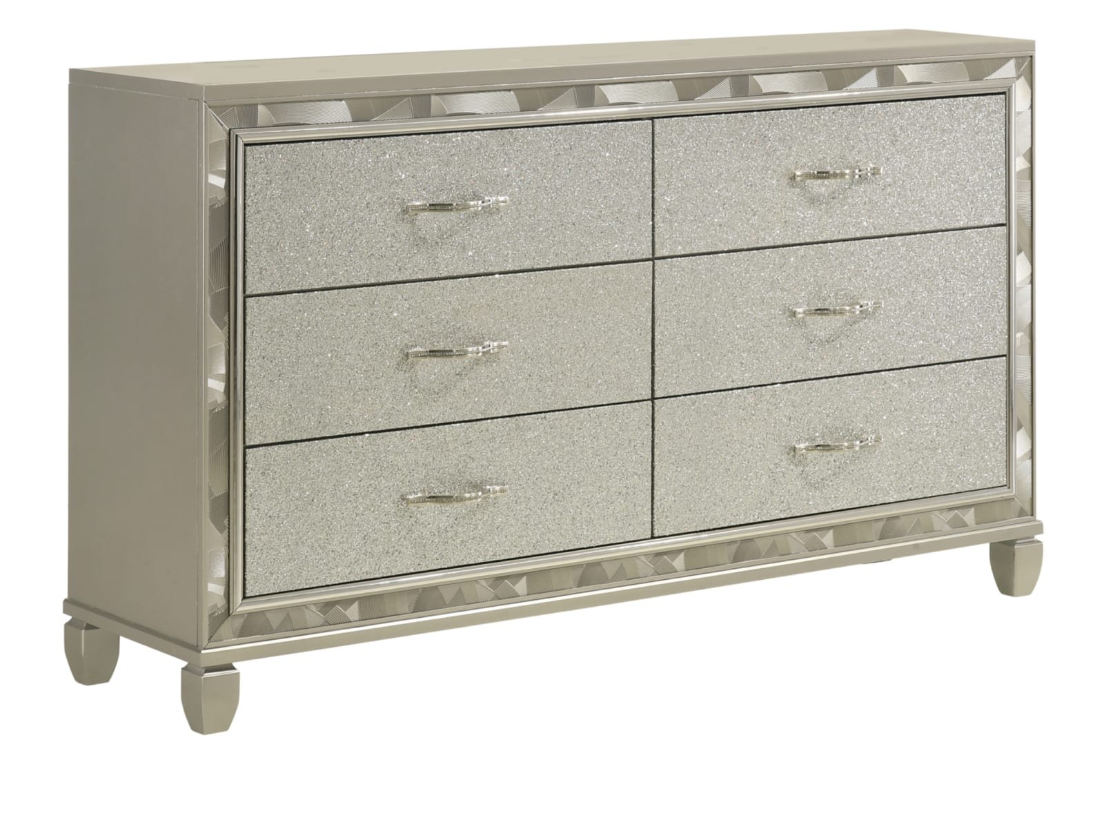 The Rydell Bedroom Collection is a mesmerizing blend of modern elegance and glamorous charm. Crafted with solid wood and MDF, this collection ensures durability and stability. The striking silver finish adds a touch of sophistication to each piece. The headboard, made of 80% faux leather and 10% cotton, creates a luxurious focal point in the room. The brushed steel face framing and glittered drawer fronts add a dazzling allure. The chrome pulls with rhinestone inlays exude opulence and style. The felt-lined top drawers provide a soft surface for delicate items, while the finished drawer interiors showcase meticulous attention to detail. The English dovetail construction and full extension ball-bearing glides ensure smooth and reliable operation. The crystal tufted, lighted headboard and mirror add a radiant ambiance to your space. With the Rydell Bedroom Collection, elevate your bedroom to new heights of elegance and glamour.