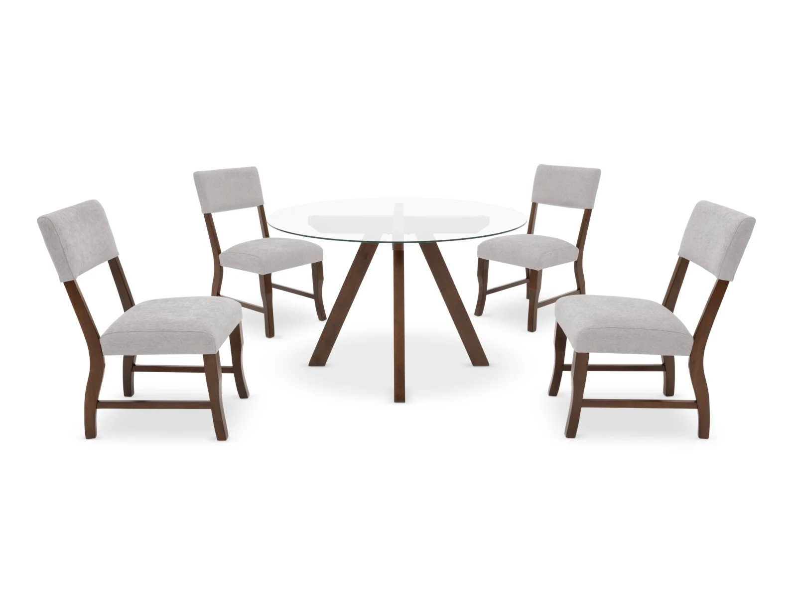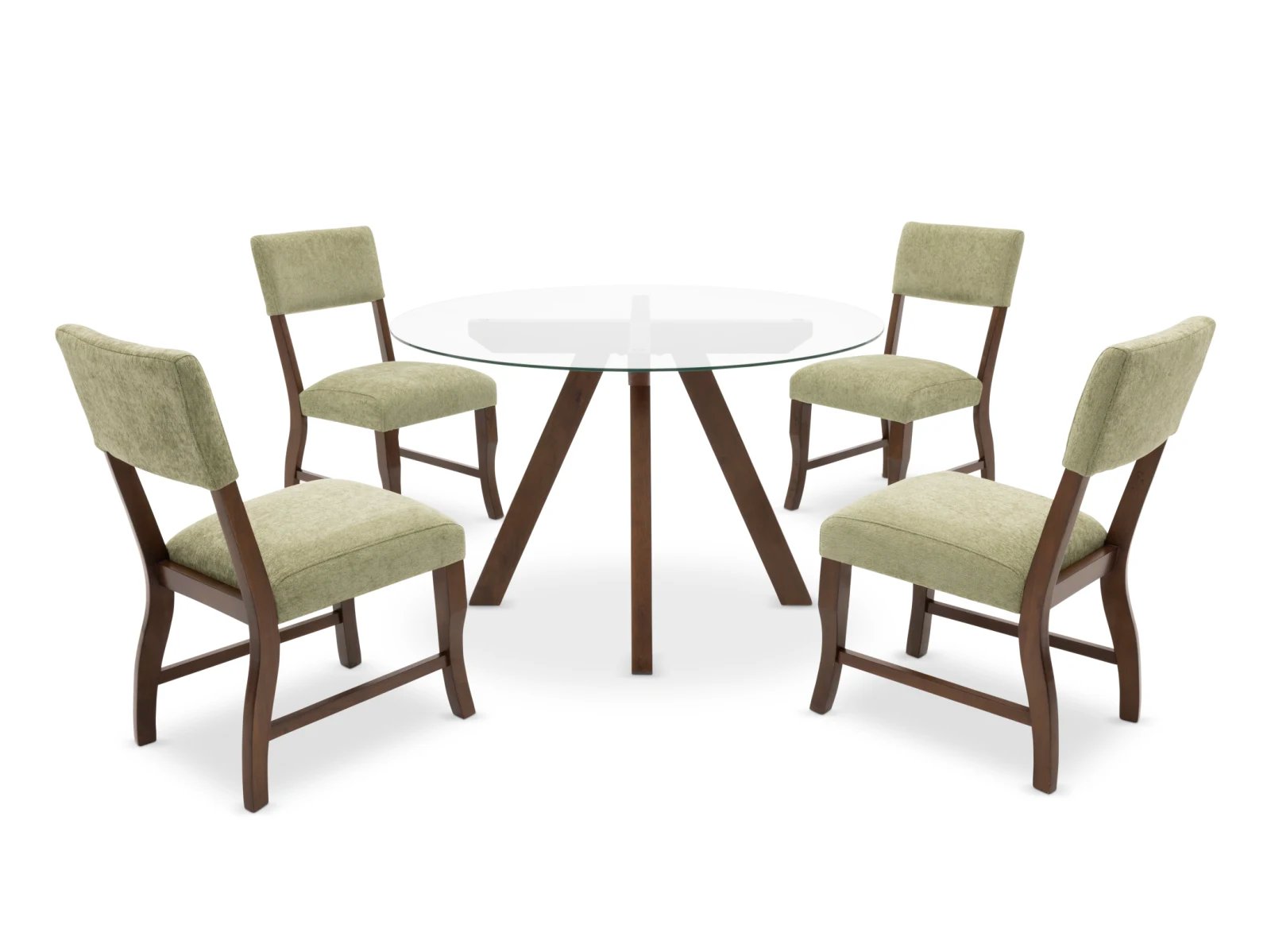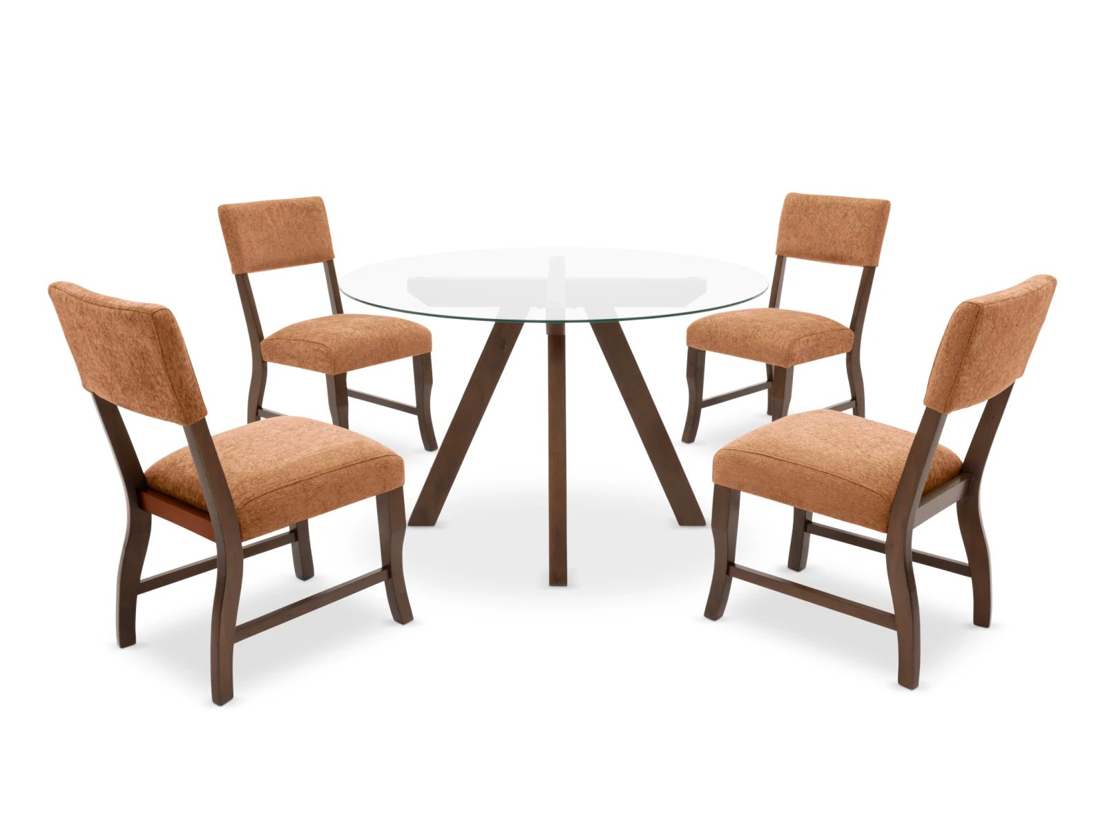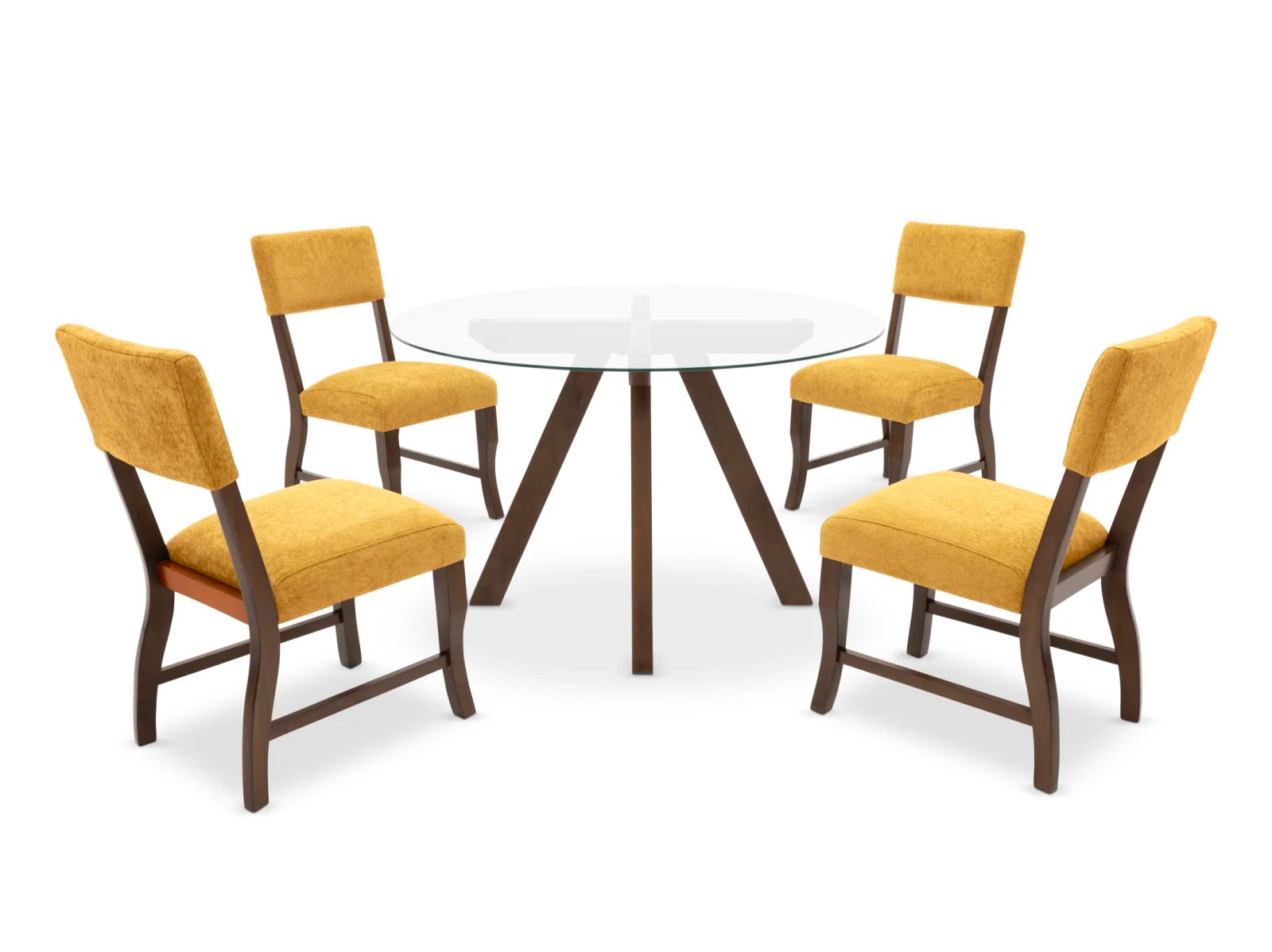 The Sadie 5-Piece Dining Set delivers modern sophistication perfect for compact living spaces and contemporary homes. This stylish dining set features a round glass top dining table with a sleek pedestal base crafted from solid rubberwood in a warm cherry finish, creating an eye-catching focal point for any dining area. Four upholstered dining chairs with cushioned backs and seats offer exceptional comfort, available in four trendy color options: Gray, Mustard, Olive, or Rust. With its mid-century modern aesthetic and space-saving design, the Sadie 5 Pc. Dining Set seamlessly blends form and function for your everyday lifestyle.