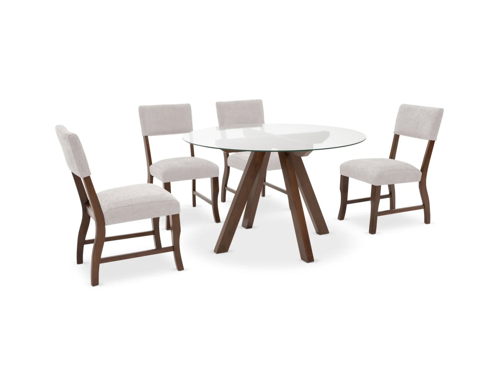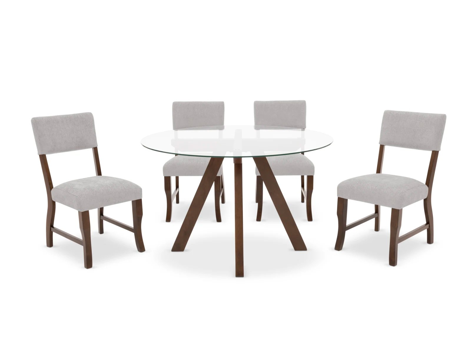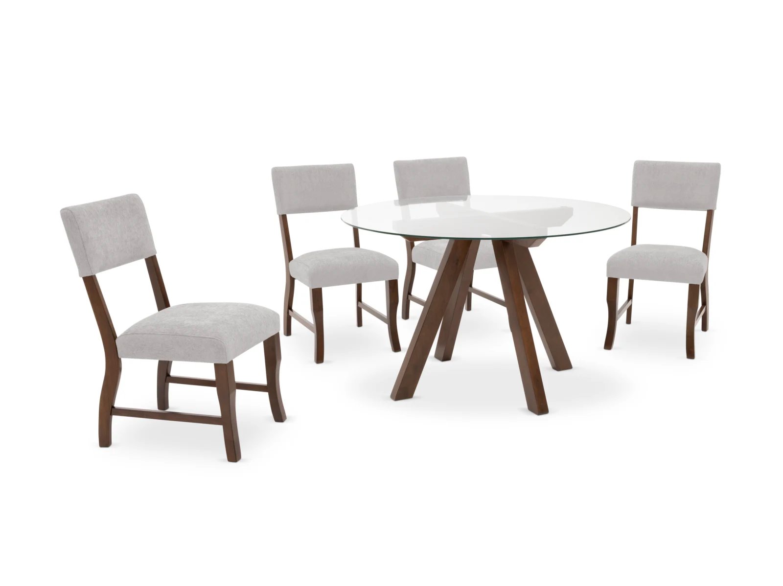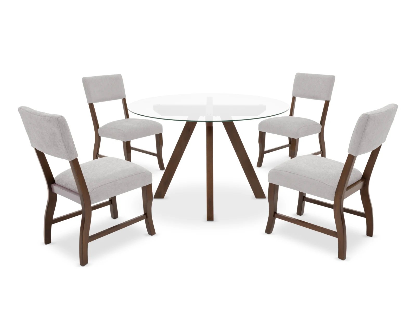 The Sadie 5-Piece Dining Set delivers modern sophistication perfect for compact living spaces and contemporary homes. This stylish dining set features a round glass top dining table with a sleek pedestal base crafted from solid rubberwood in a warm cherry finish, creating an eye-catching focal point for any dining area. Four upholstered dining chairs with cushioned backs and seats offer exceptional comfort, available in four trendy color options: Gray, Mustard, Olive, or Rust. With its mid-century modern aesthetic and space-saving design, the Sadie 5 Pc. Dining Set seamlessly blends form and function for your everyday lifestyle.