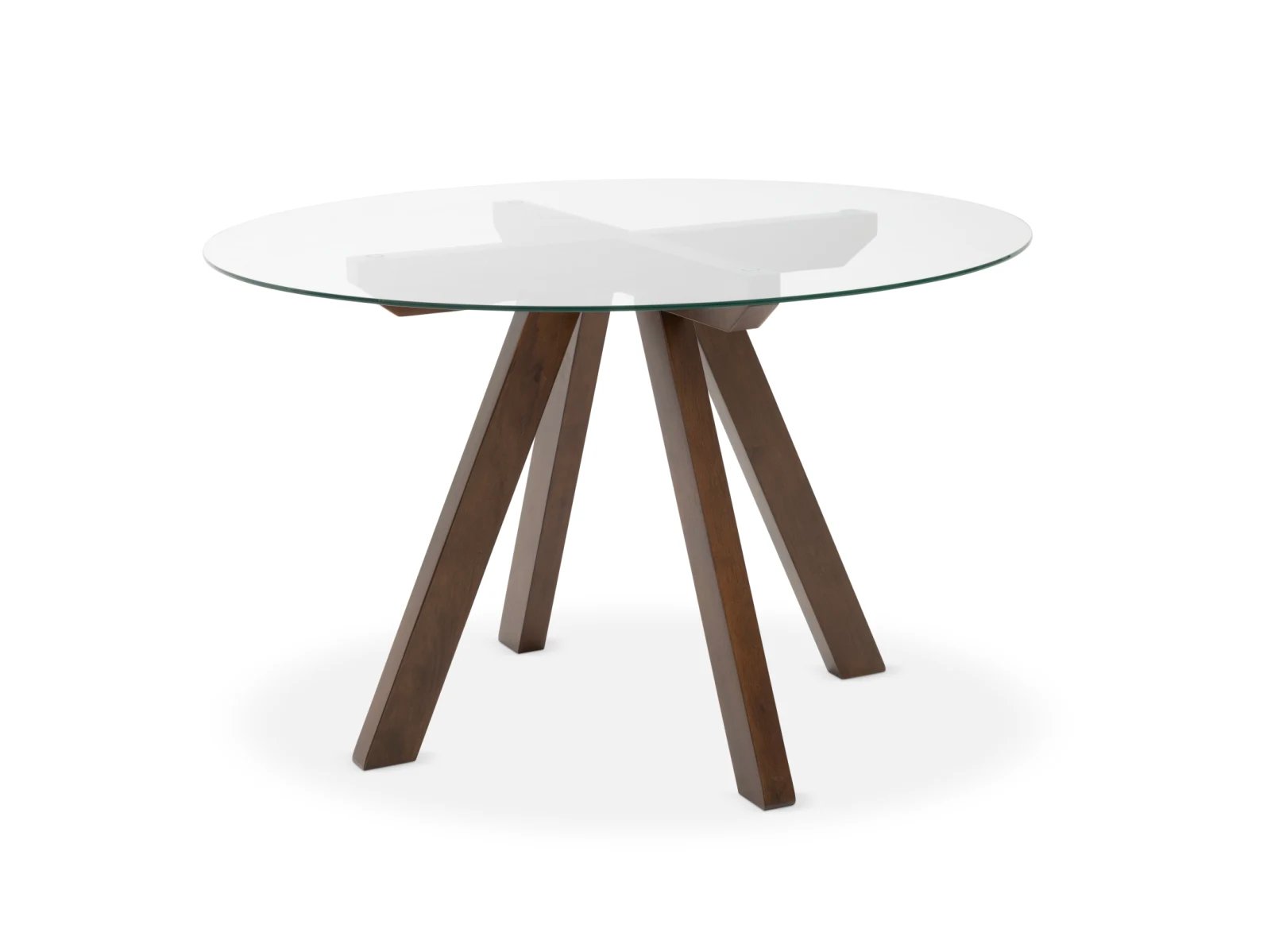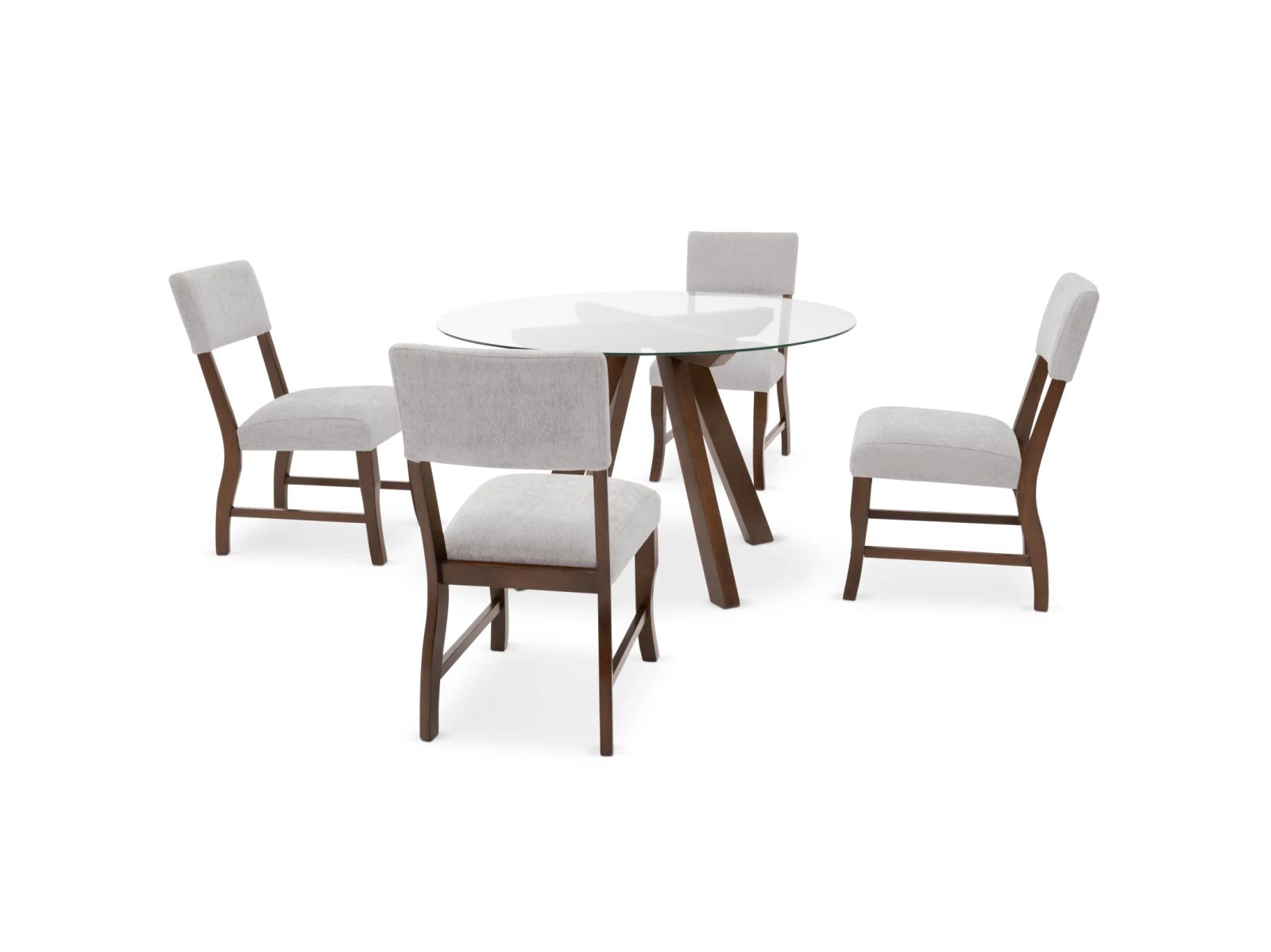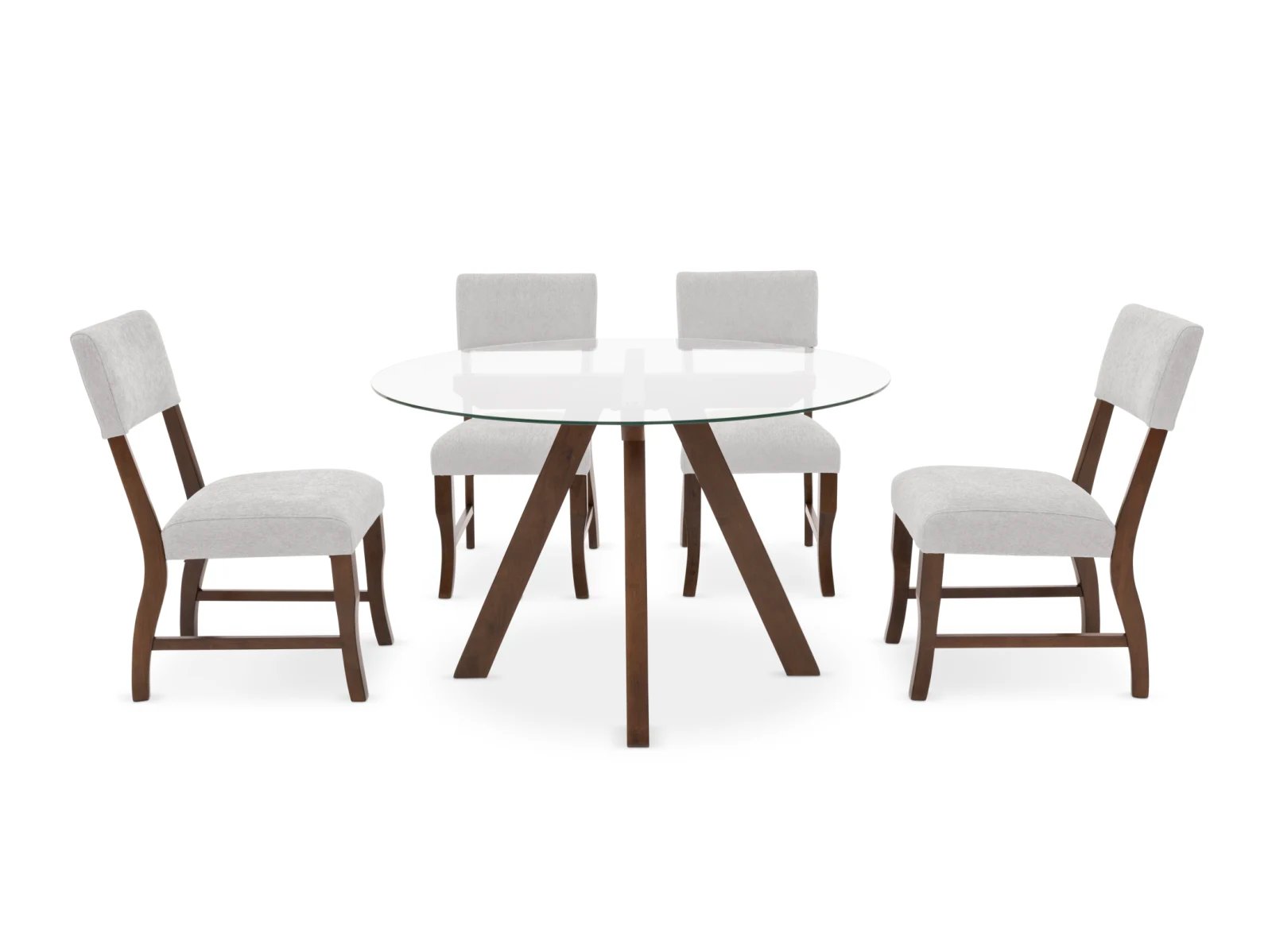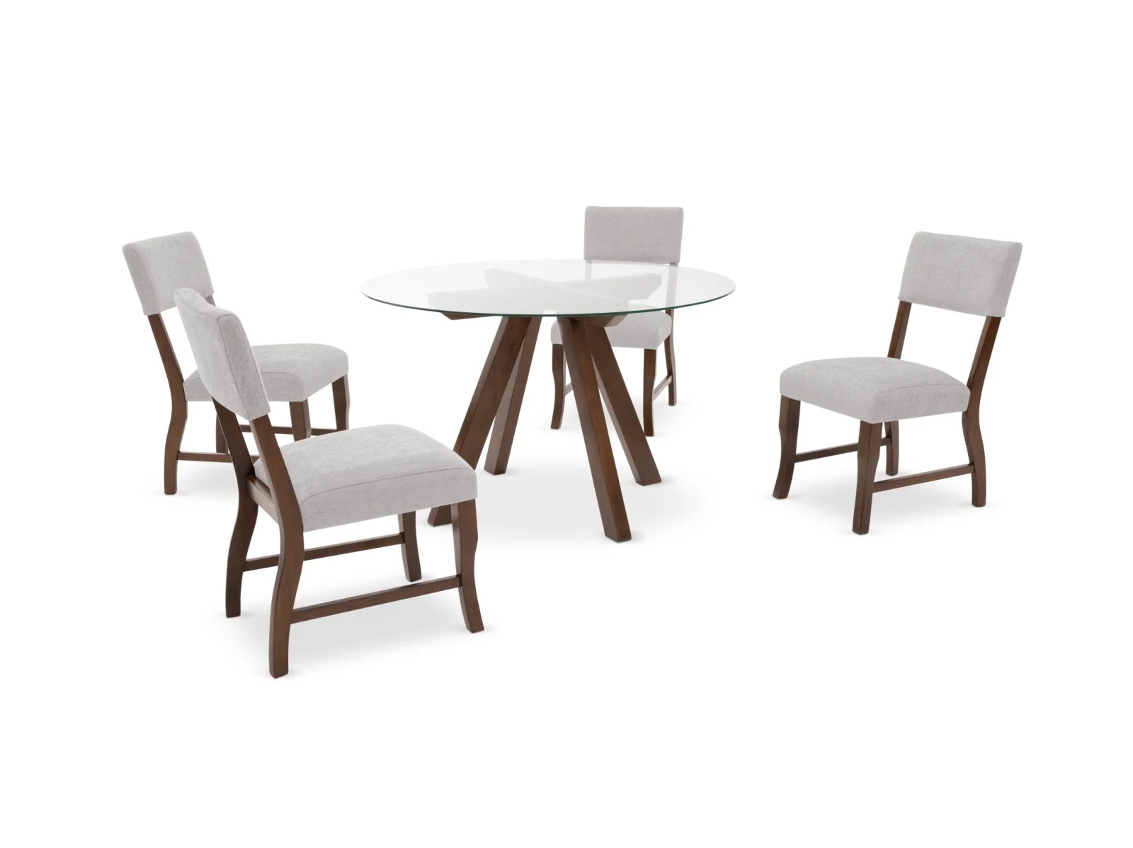 The Sadie 5-Piece Dining Set delivers modern sophistication perfect for compact living spaces and contemporary homes. This stylish dining set features a round glass top dining table with a sleek pedestal base crafted from solid rubberwood in a warm cherry finish, creating an eye-catching focal point for any dining area. Four upholstered dining chairs with cushioned backs and seats offer exceptional comfort, available in four trendy color options: Gray, Mustard, Olive, or Rust. With its mid-century modern aesthetic and space-saving design, the Sadie 5 Pc. Dining Set seamlessly blends form and function for your everyday lifestyle.