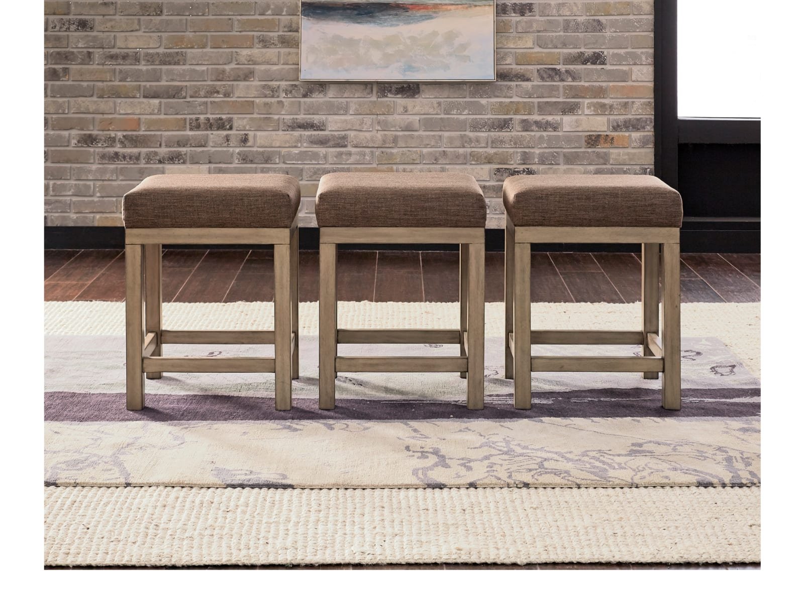 Striking yet simply cozy. Sandstone bar stools are constructed of solid rubberwood block legs in a sandstone finish with a padded upholstered seat in a brown tweed fabric. Set includes three stools.