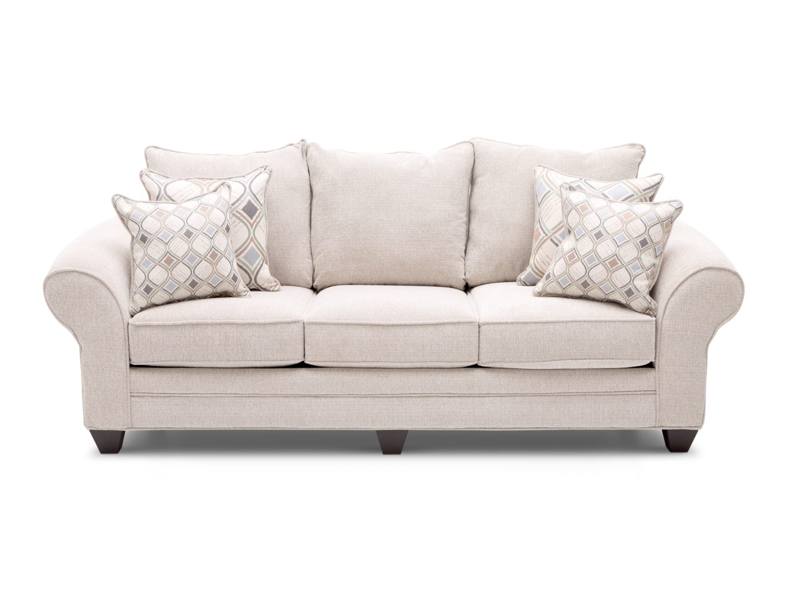 Soft and sweet with an updated take on the charming cottage look, the Skylar Sofa is ready to transform your home into a serene escape. This sumptuous sofa is upholstered in your choice of cream or light teal fabric with geometric throw pillows, and it features rolled arms and plush pillow back cushions to perfect its sophisticated silhouette. Add this sensational sofa to your living space today.