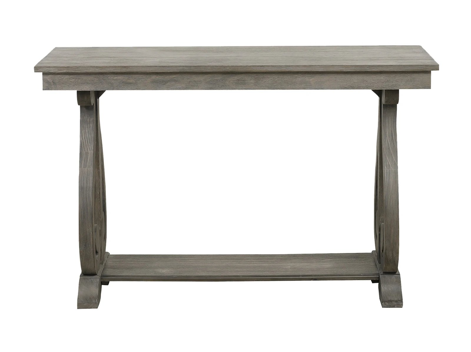 & Free ShippingBold curves provide elegant contrast to the unique look of the Sloane Sofa Table. The heavily scrolled base supports of the tables feature French provincial inspired routing while wire–brushed distressing provides texture to the acacia veneer of this elegant occasional collection.