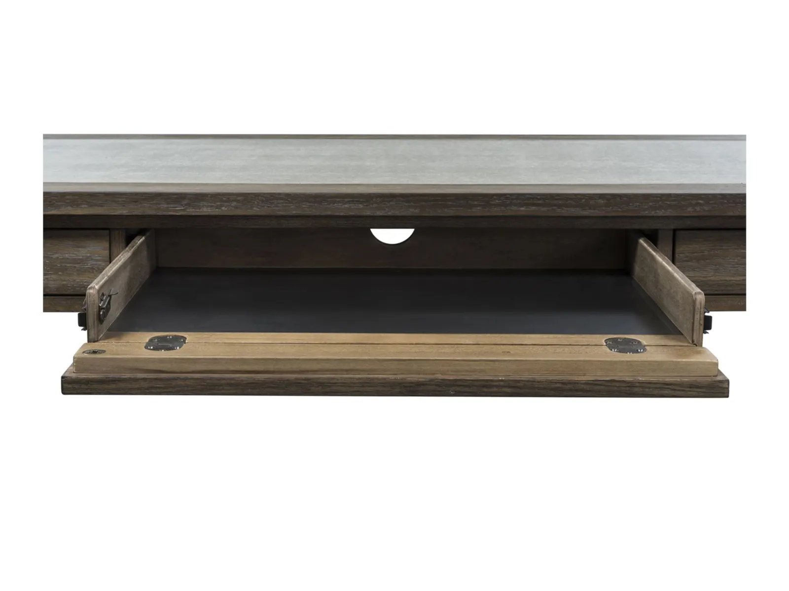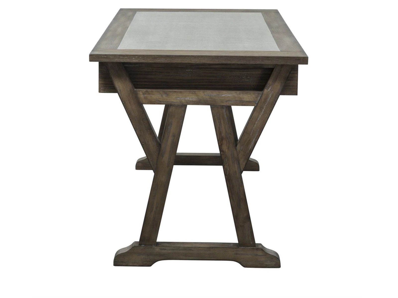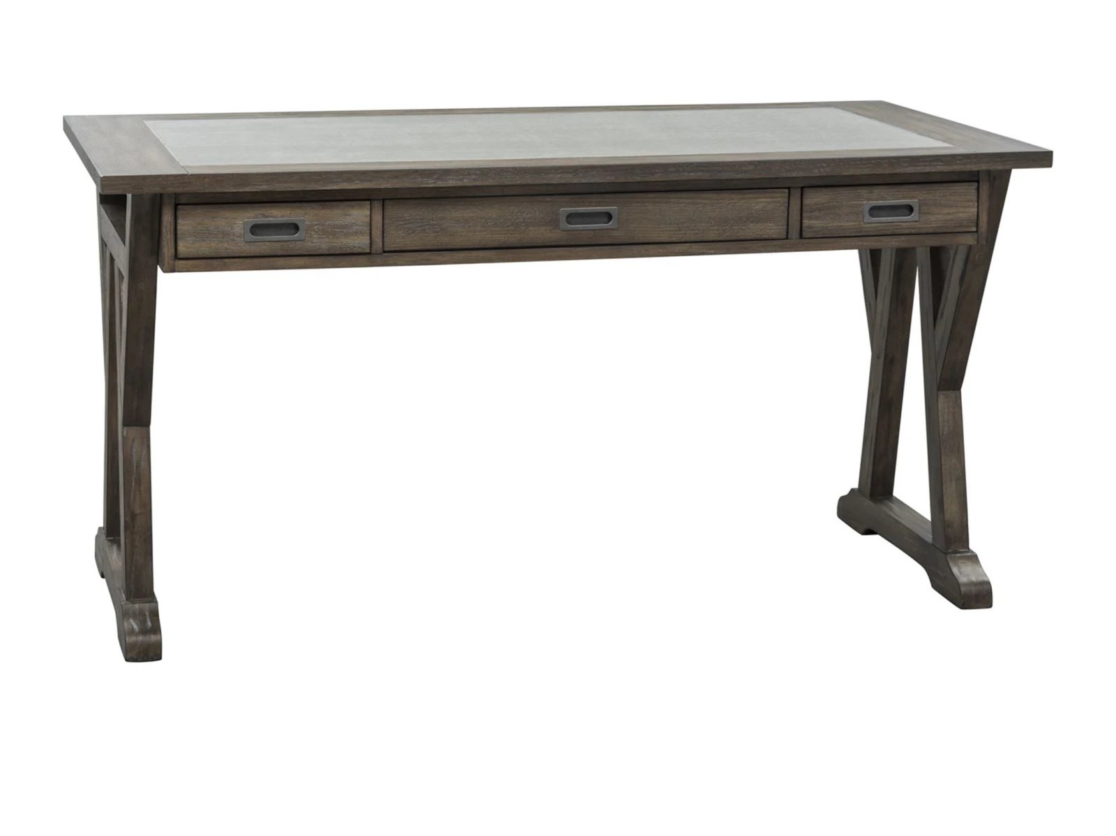 Create a look all your own with the Smithfield Writing Desk. Crafted of acacia and poplar solids with white oak veneers, this piece features a weathered gray finish. This desk has three full extension drawers that are accented with recessed pulls in an antique pewter finish. The center drawer includes a flip-down keyboard tray. Wow family and friends with the concrete composite inset top that flow into an angled leg design. Mixed materials of the concrete with the saddle finish give Smithfield a modern rustic feel.