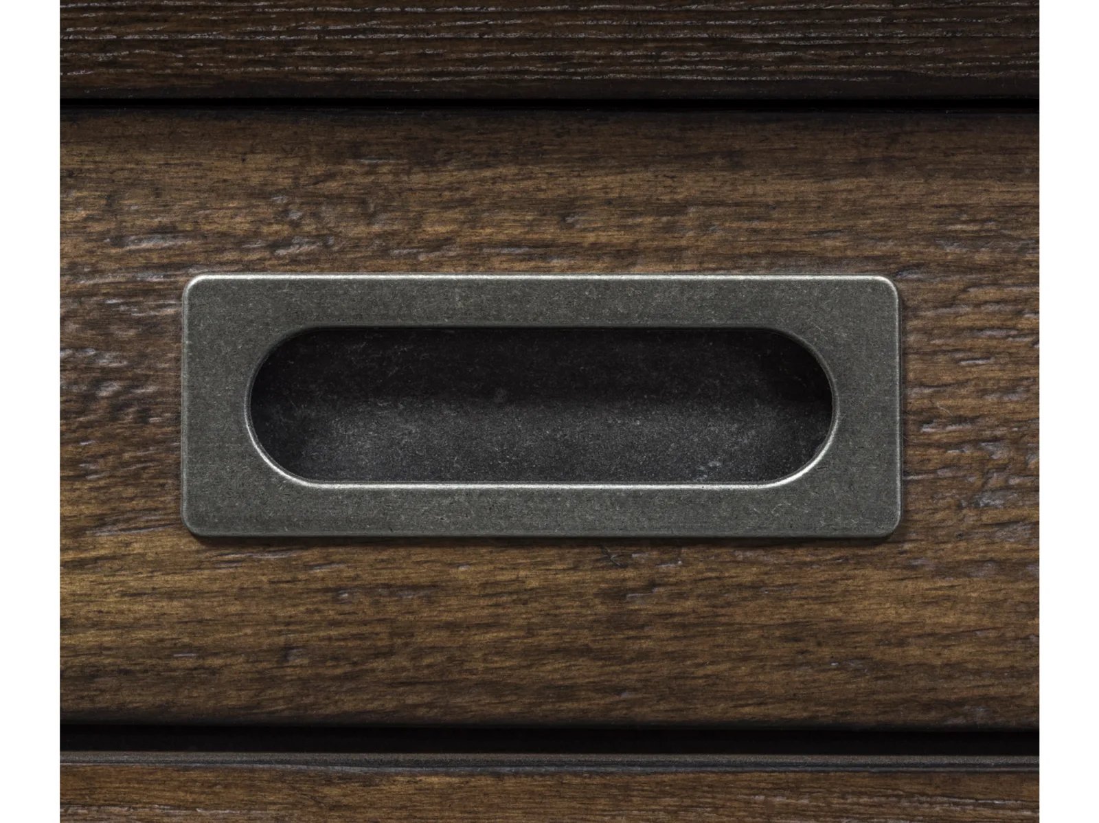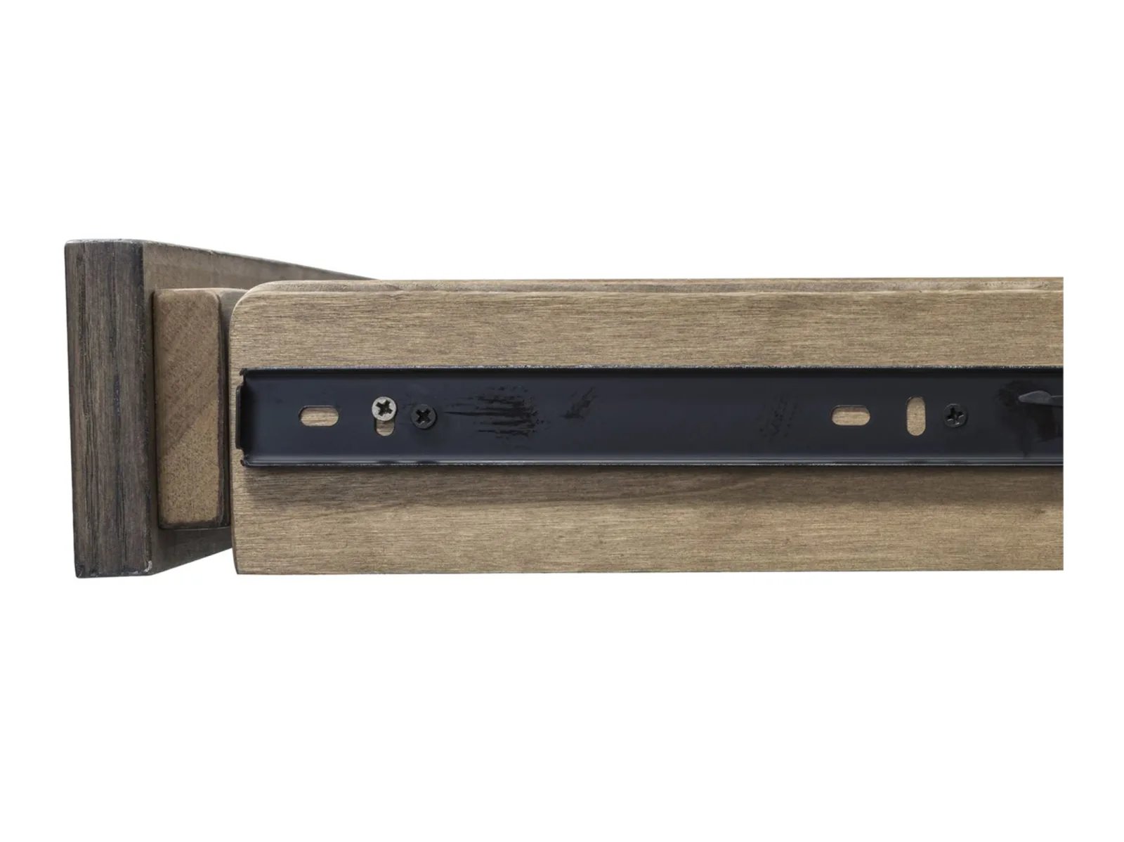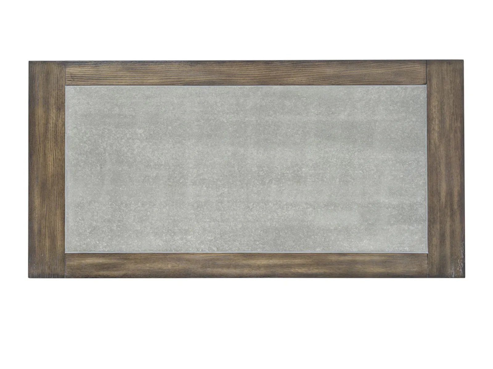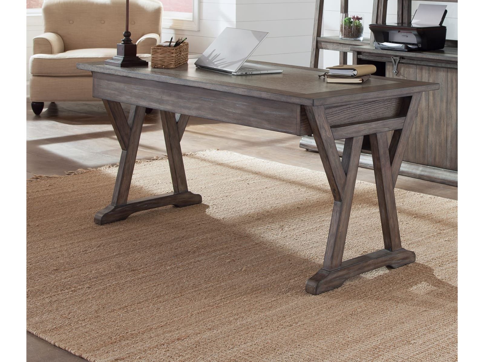 Create a look all your own with the Smithfield Writing Desk. Crafted of acacia and poplar solids with white oak veneers, this piece features a weathered gray finish. This desk has three full extension drawers that are accented with recessed pulls in an antique pewter finish. The center drawer includes a flip-down keyboard tray. Wow family and friends with the concrete composite inset top that flow into an angled leg design. Mixed materials of the concrete with the saddle finish give Smithfield a modern rustic feel.