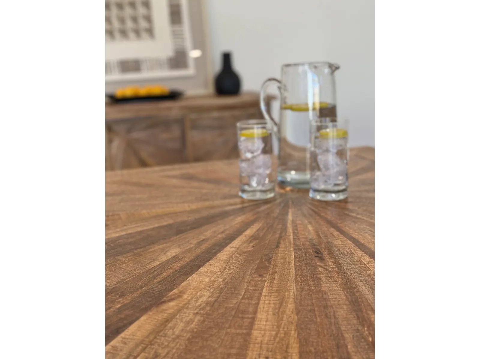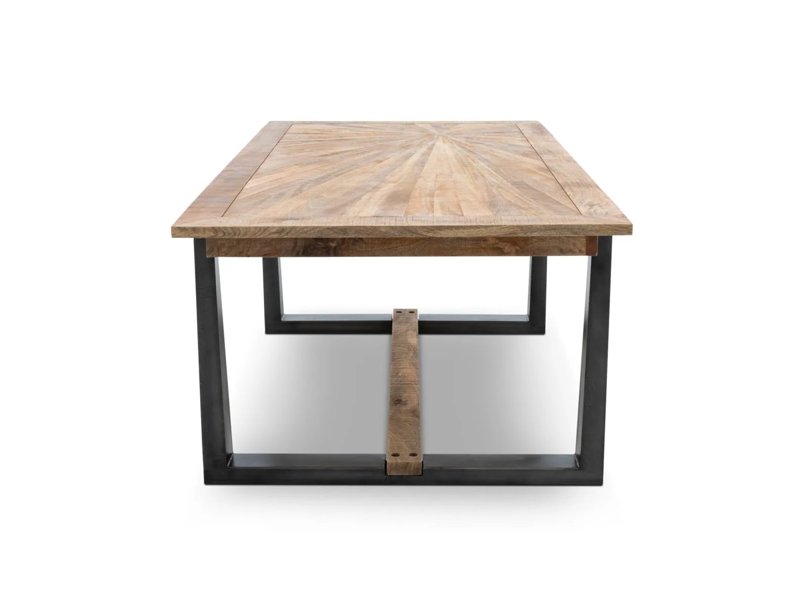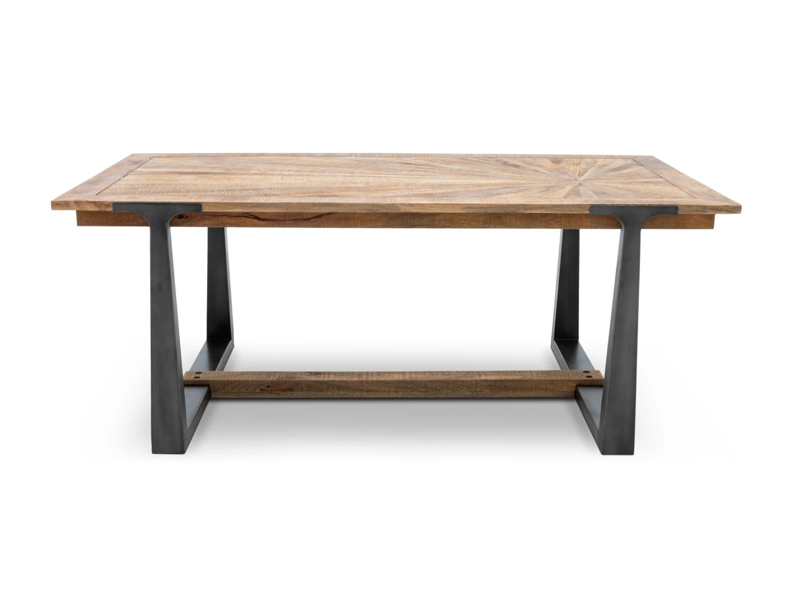 Gather around the stunning Sol Dining Table, a perfect blend of rustic charm and industrial chic. Crafted from mango wood, this stylish dining table showcases veneered sunburst inlays along its top for a richly textured look, and its sturdy metal base features an A-frame design with connecting crossbar for a touch of modern edge. The Sol Dining Table effortlessly complements various decor styles, from farmhouse to contemporary, making it an ideal choice for family meals, casual gatherings, or elegant dinner parties.