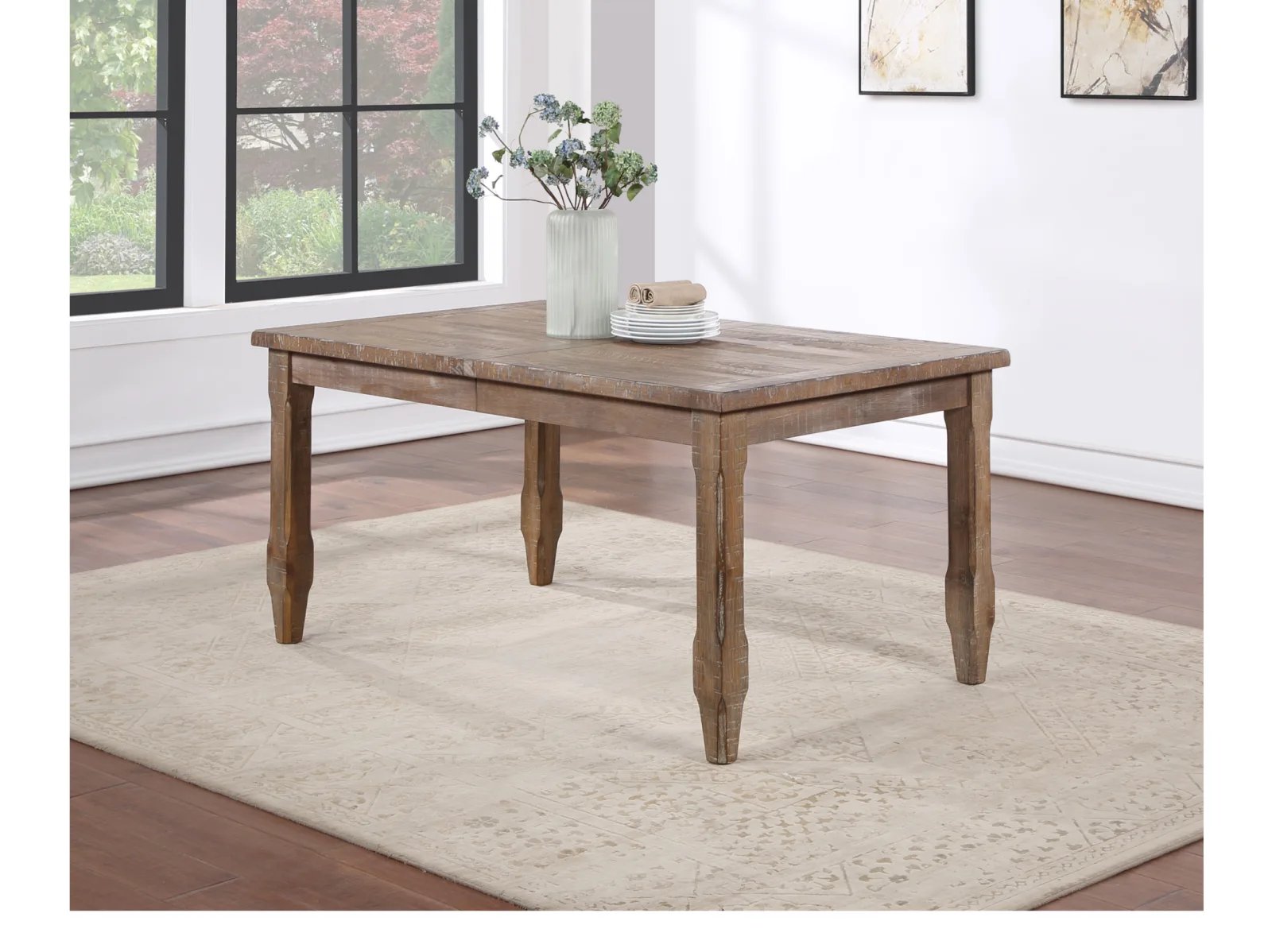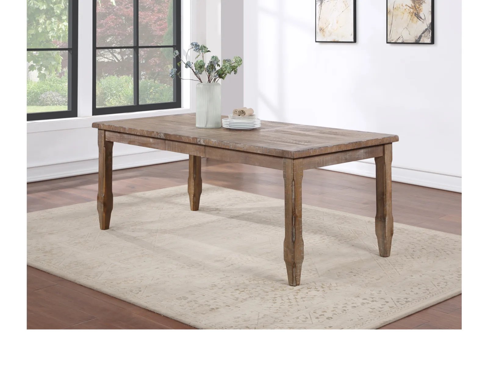 & Free ShippingA mix of modern elements and a natural, distressed finish create a casual, relaxed table perfect for today’s dining interiors. The 64-inch table expands to a full 80-inches with the insertion of the included 16 inch leaf to seat eight comfortably. The chamfered, taped legs add a contemporary look to the heirloom feel of the table in a Modern Ranch design comfortable in a rural, urban or suburban setting.