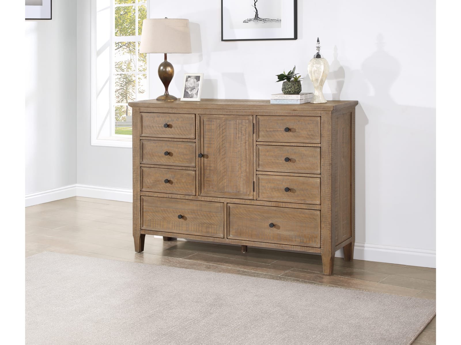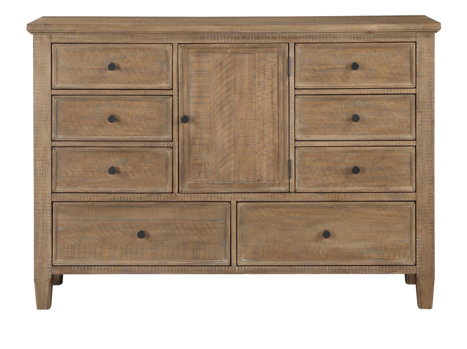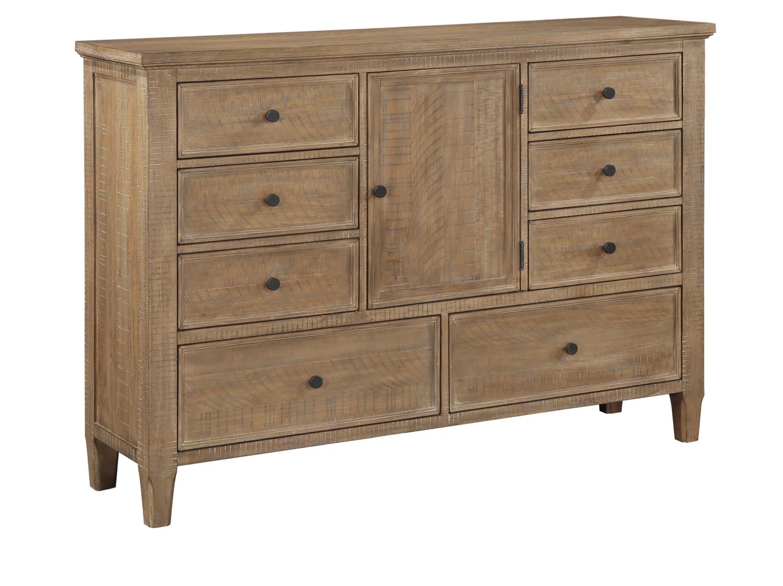 Transform your bedroom into a cozy and inviting space with the Spring Creek Dresser, a perfect blend of rustic sophistication and modern styling. Crafted from solid pine and Asian hardwood solids, this dresser features wood scoring and saw rasping to relax the appearance like a time-worn antique. With spacious drawers and a door, there’s plenty of storage for clothing and bulky items, and two felt-lined drawers ensure your delicates stay protected. The Spring Creek Dresser is the perfect addition to any bedroom that craves both character and functionality.