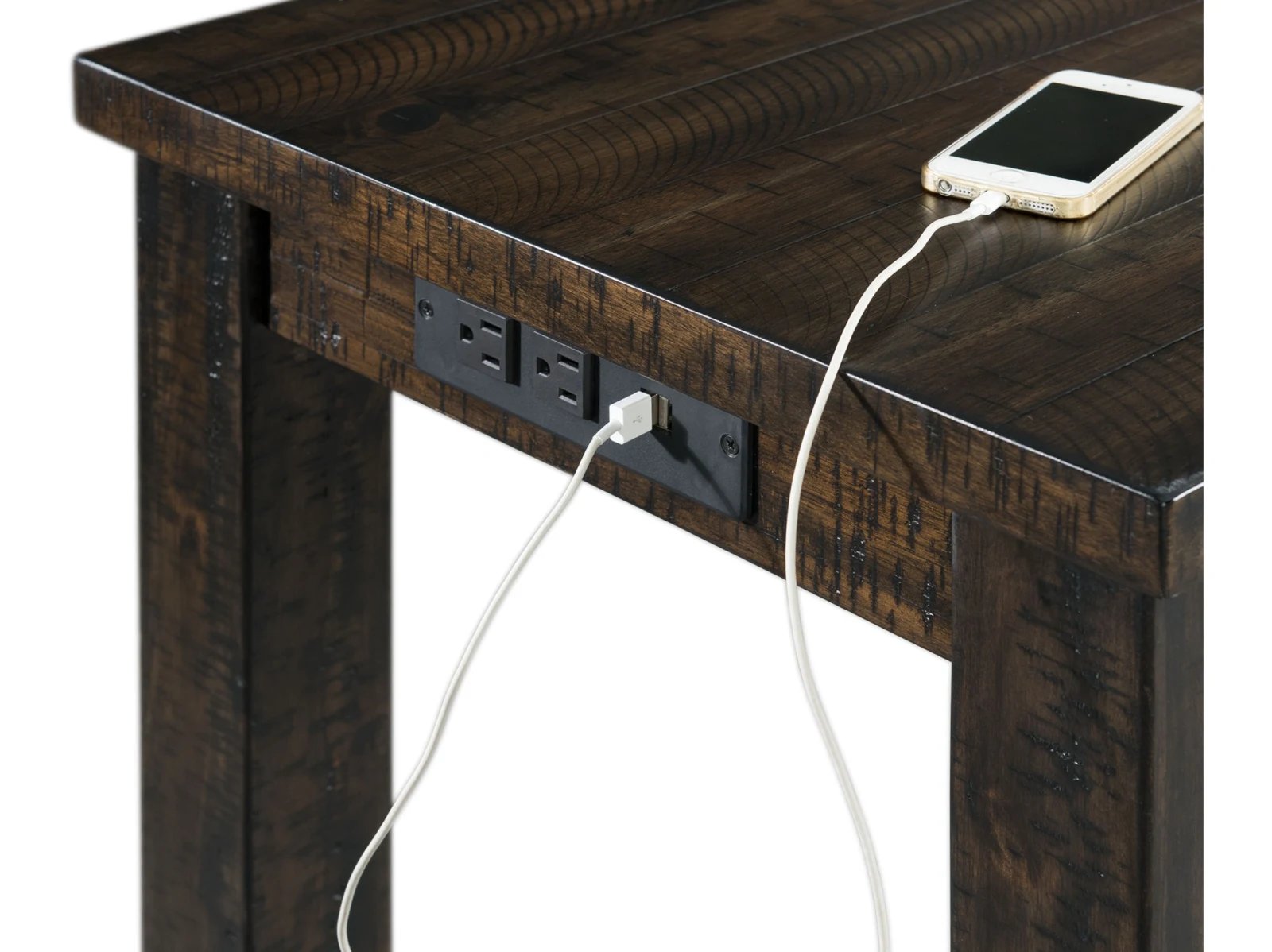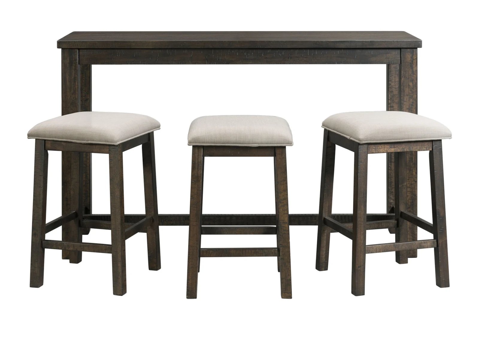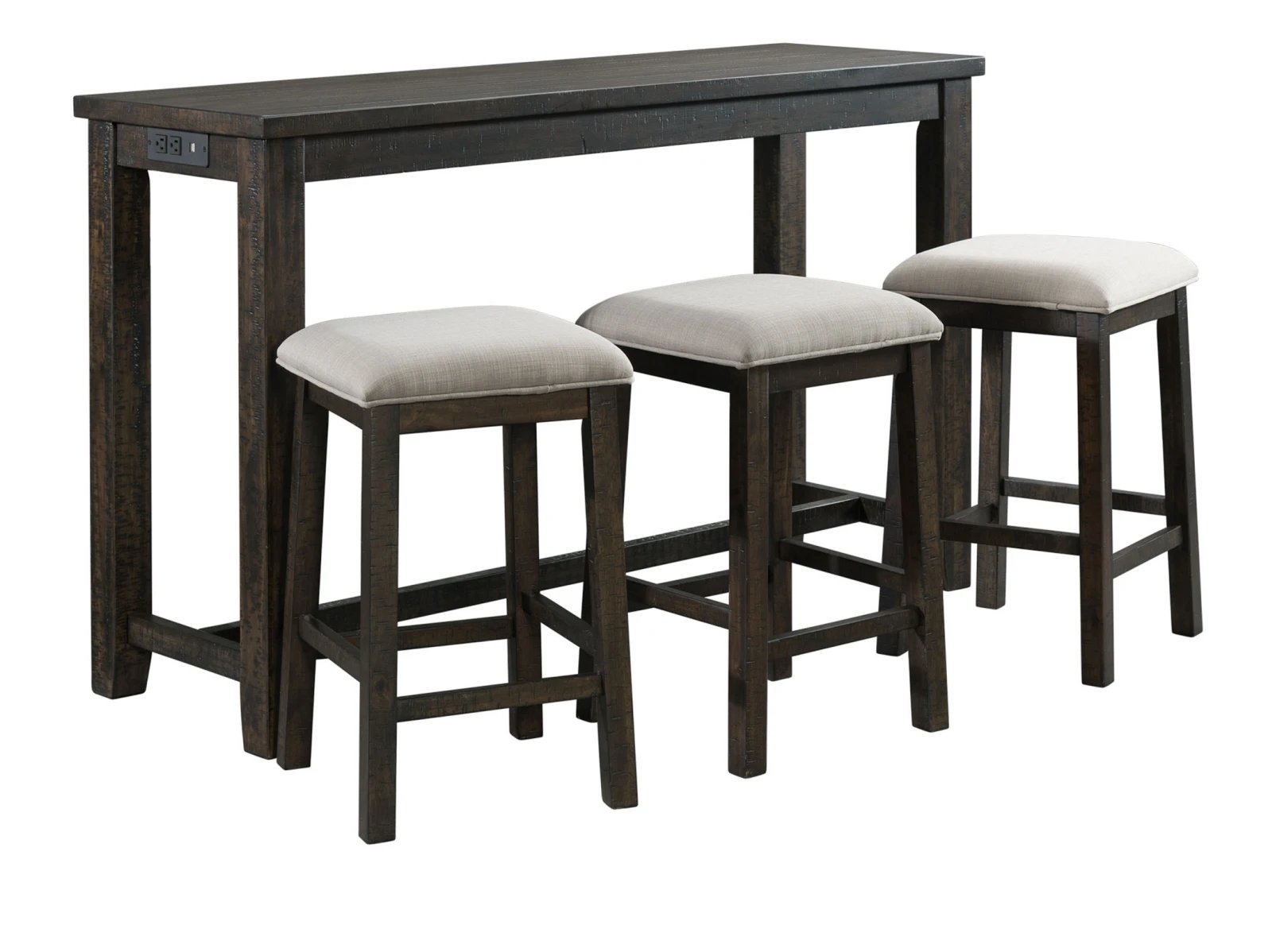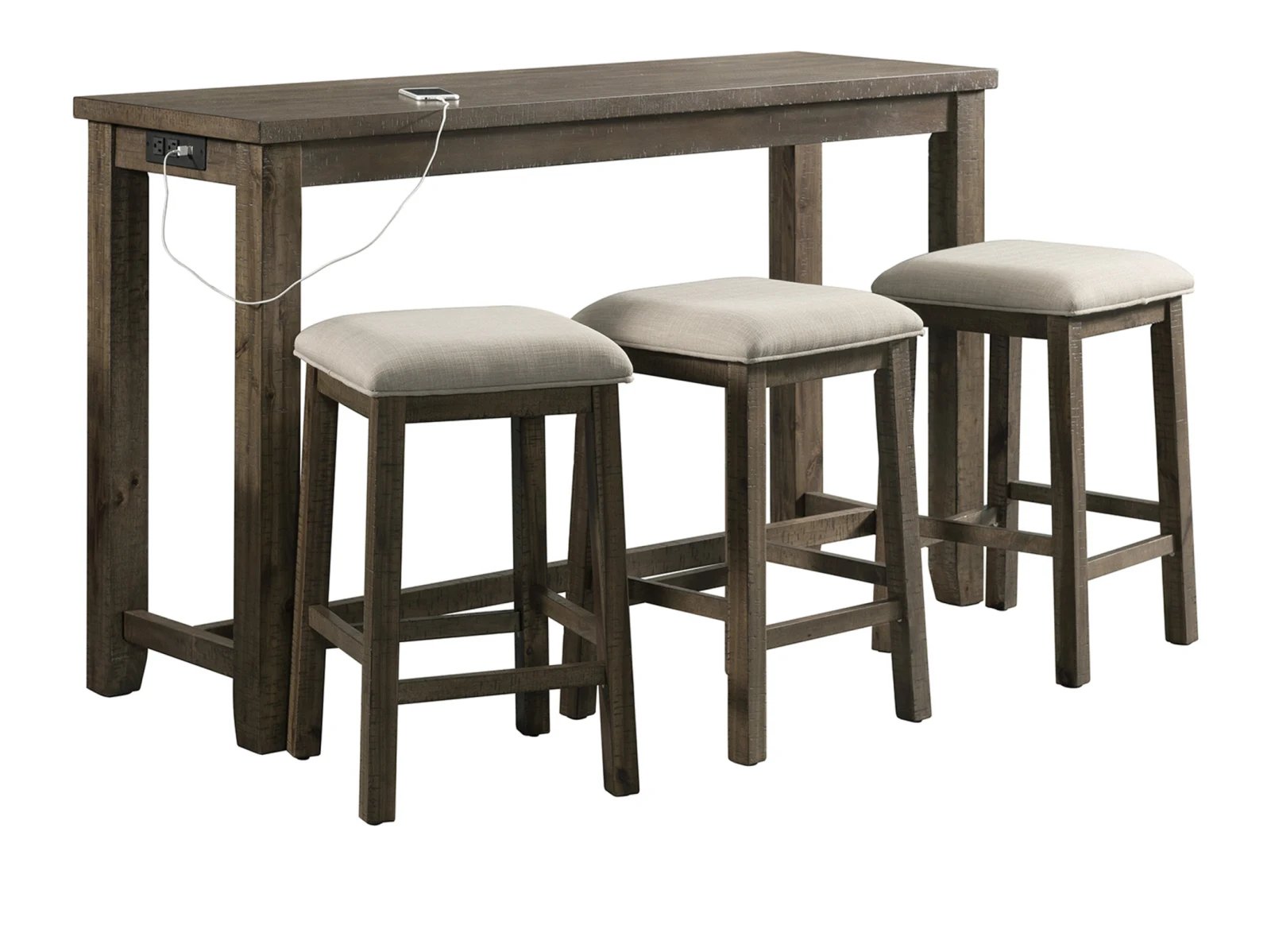 The Stanford Pub Table Set is the ultimate set for your home! This set can be placed anywhere in your home, from a kitchen nook to a spot behind the sofa in the living room. Keeping your devices charged while you work wont be a problem, thanks to the USB ports and power strip located on the side of the table. The barstools comes with an upholstered, foam cushion seat; making it easy to watch your favorite TV shows while you work without having to completely rearrange the couch to get you setup to finish up extra work. The smokey walnut finish, with gray undertones will pair perfectly with any existing decor you have. Say goodbye to having to haul your work to your local coffee shop and hello to the Stanford Multipurpose Bar Table Set!