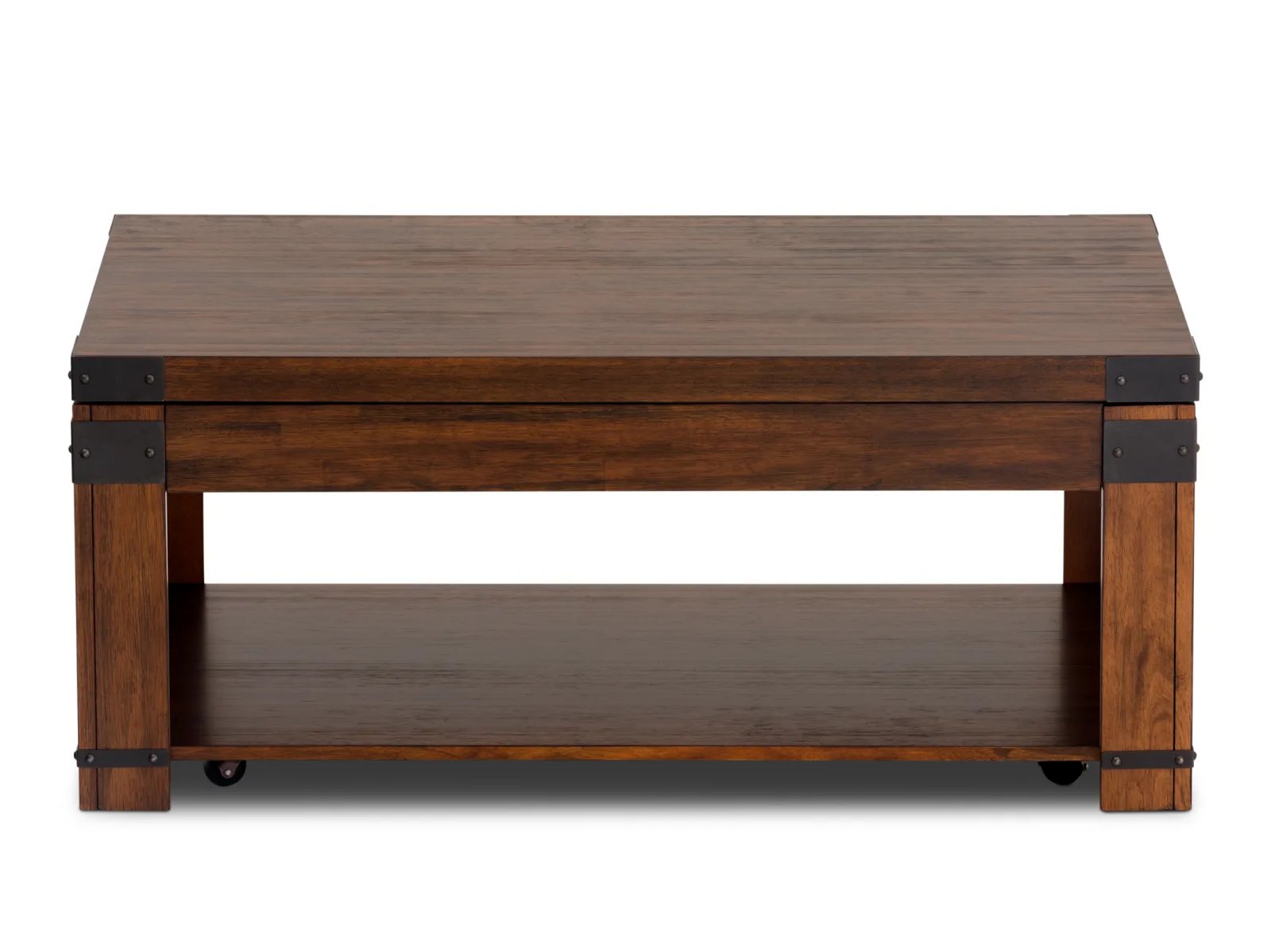 The Sullivan Lift-Top Coffee Table offers a simple appearance with an Old World styled frame and up-to-date accents of the restoration genre. The Sullivan is crafted of rubberwood solids and mango veneers with a medium cherry finish. This useful cocktail table has a lift-top function that will turn your coffee tabletop into a work or dining surface in seconds. Hidden storage underneath the lifting top is the perfect place to keep remote controls and more. The Sullivan also has metal corner brackets accented by nailheads and a vertical routered edge, a bottom shelf for added storage space and leg support, and casters for easy mobility. Take home this trusty table today.