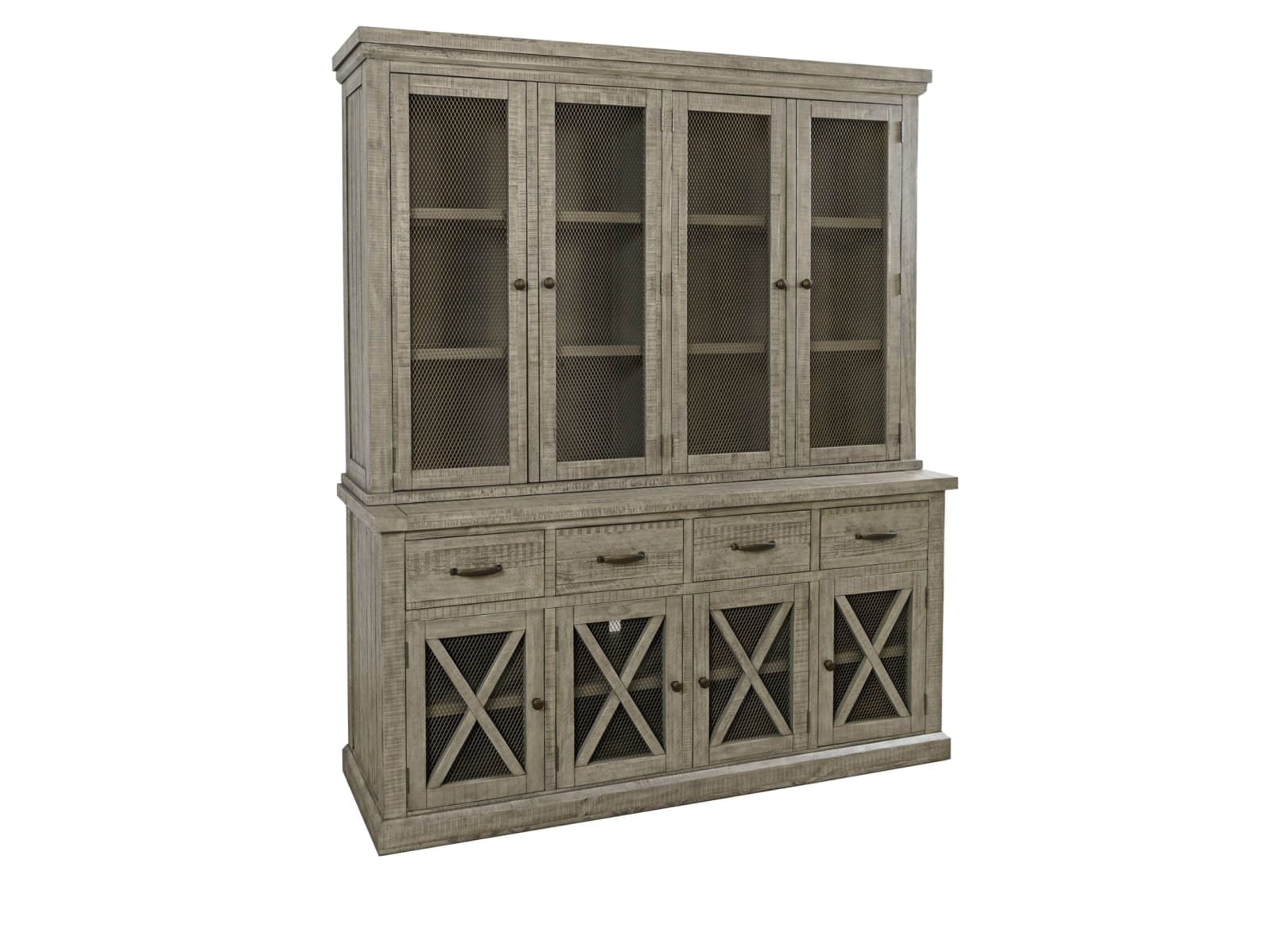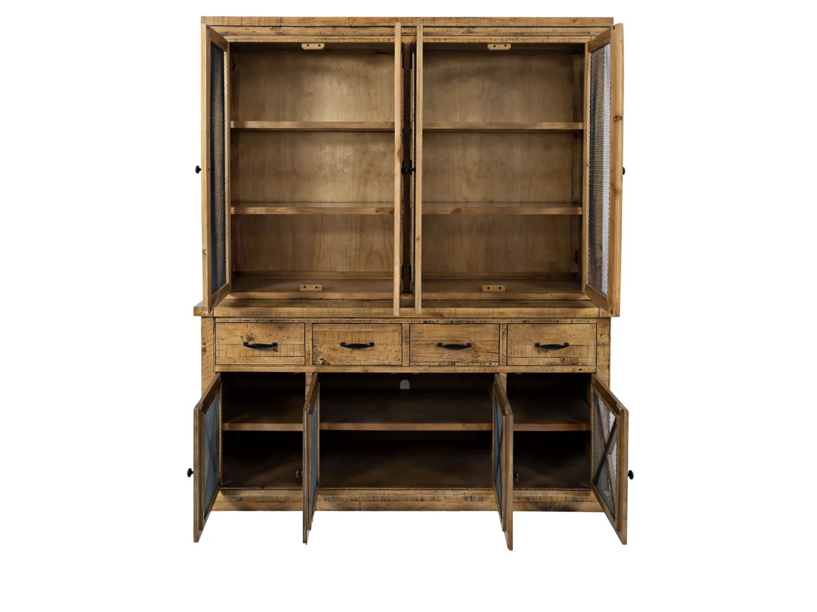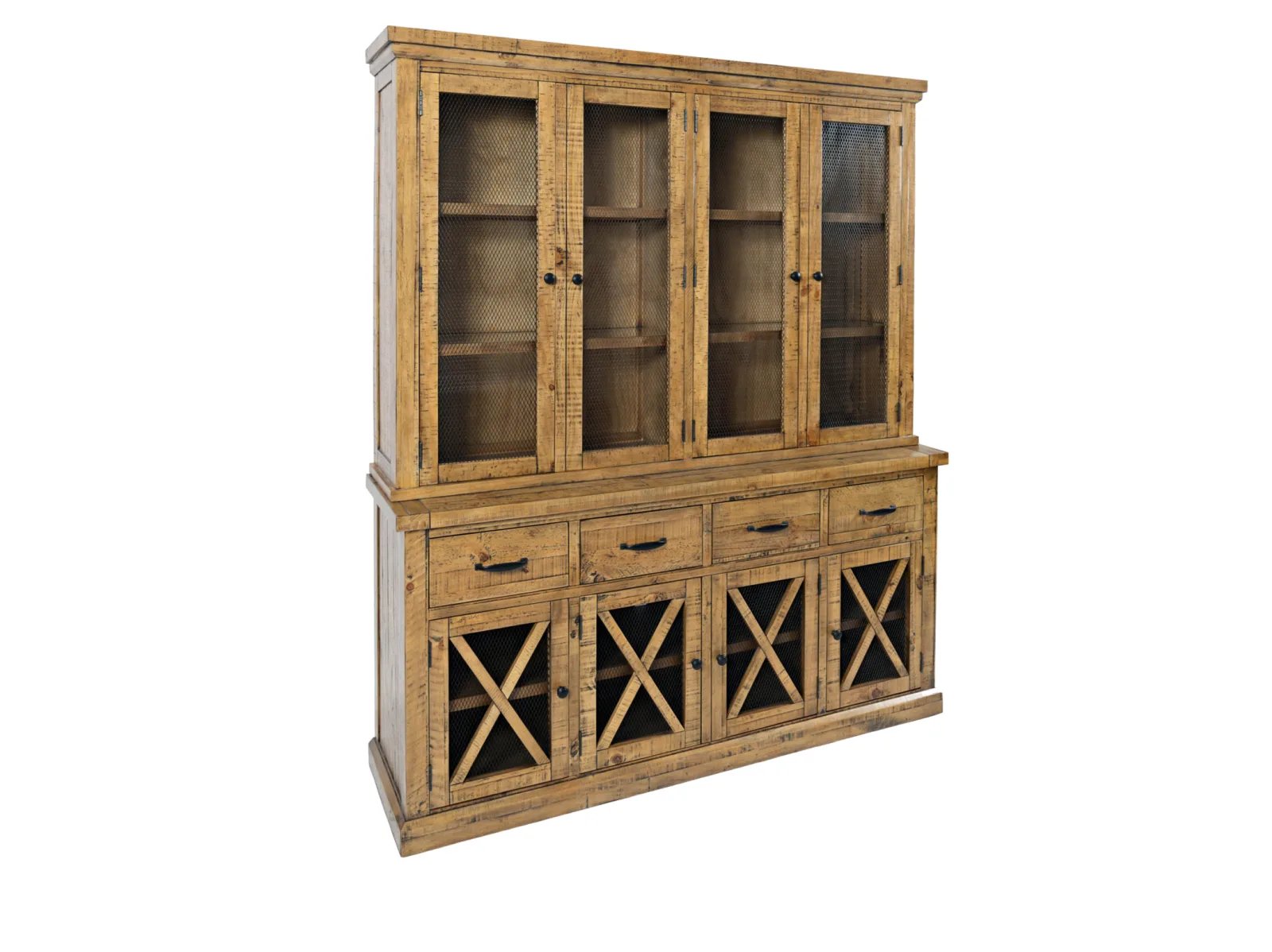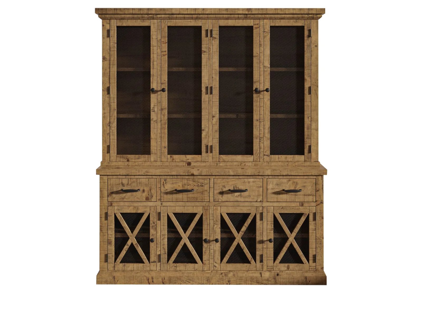 & Free ShippingThe Tafton Collection is the epitome of rustic style with its mixed media durable construction. The natural pine, with its subtle distressing, make this a bold statement piece on its own or a perfect added accent to your interior. This is the entire sideboard with hutch. The sideboard features four drawers and four doors with black wire grill detail and fixed interior shelves; hutch features touch accent lighting, four doors with wire grill detail, and fixed interior shelves.