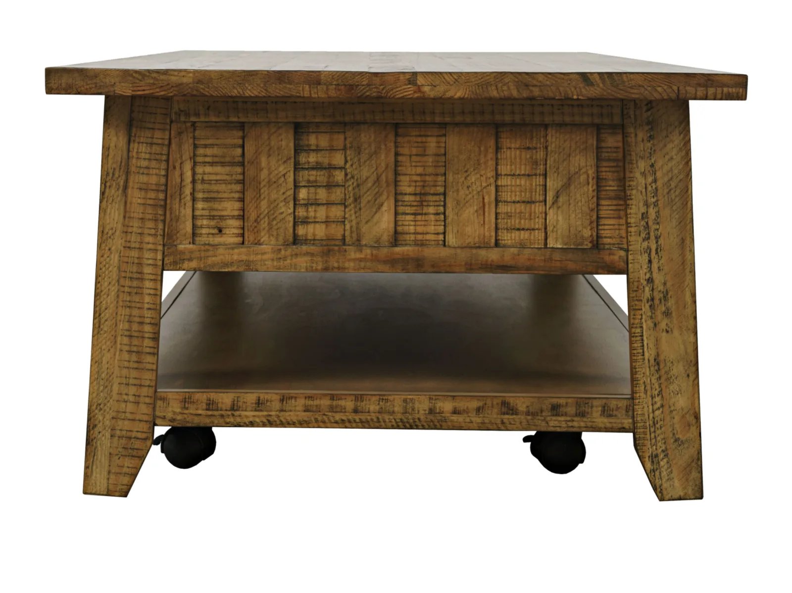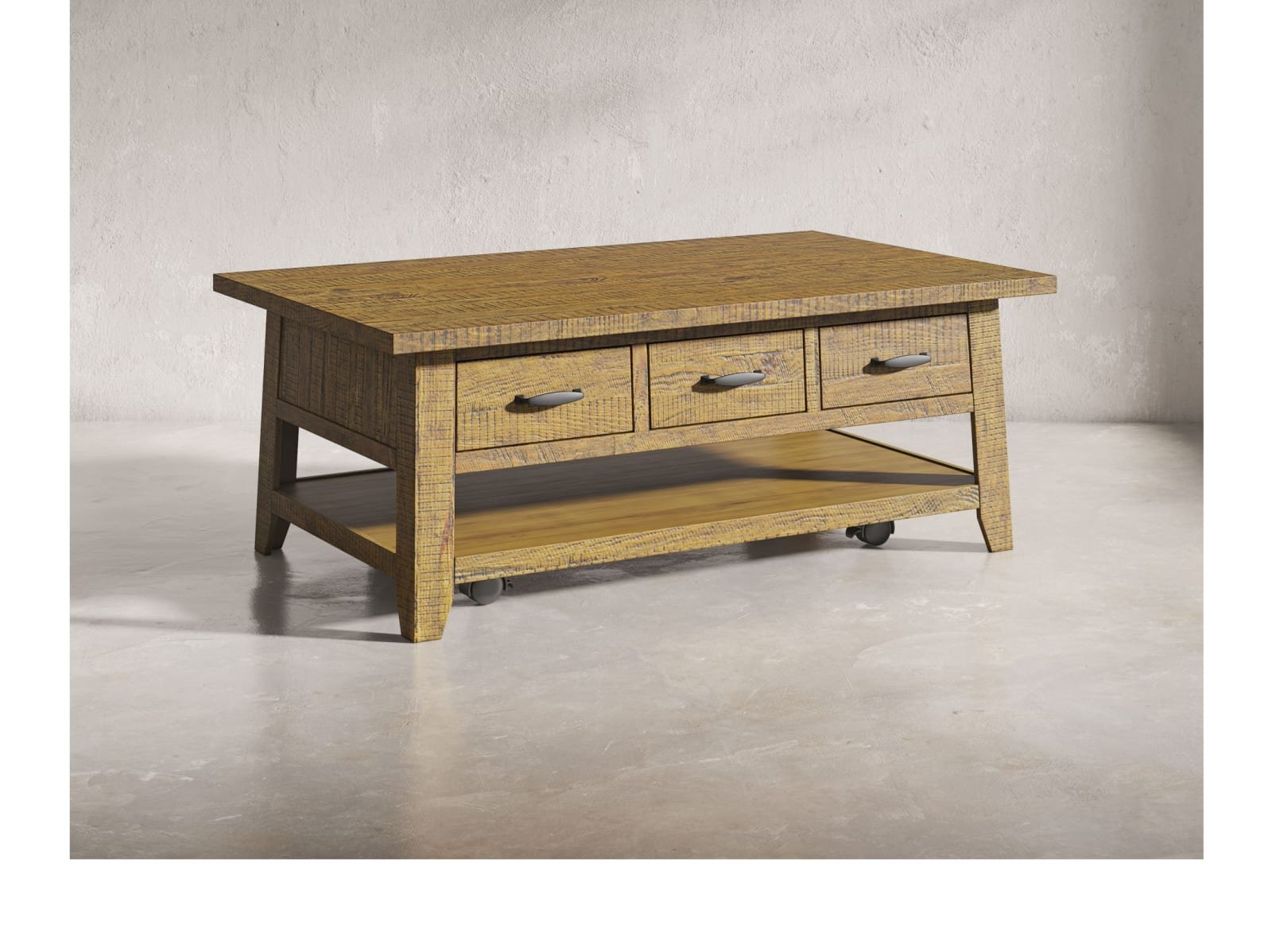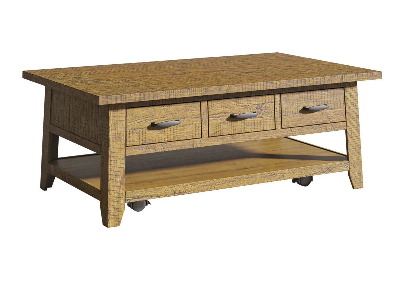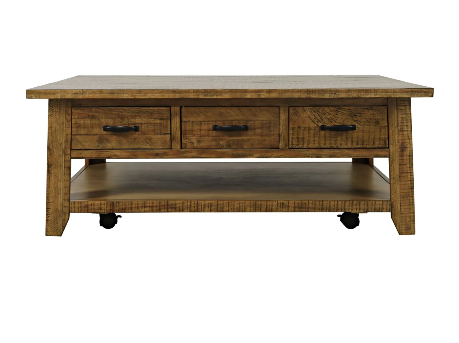 & Free ShippingThe Tafton Collection is the epitome of rustic style with its durable construction and natural pine. The subtle distressing make these bold statement pieces and the perfect added accent to your interior. This coffee table features three pull-through drawers, a shelf for open storage or display, and casters.