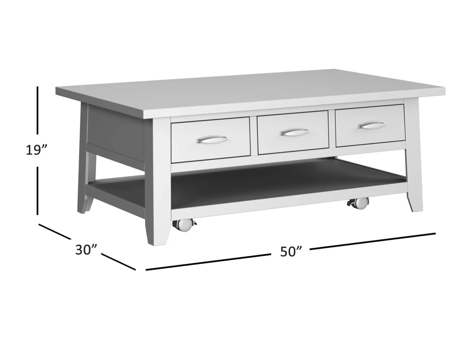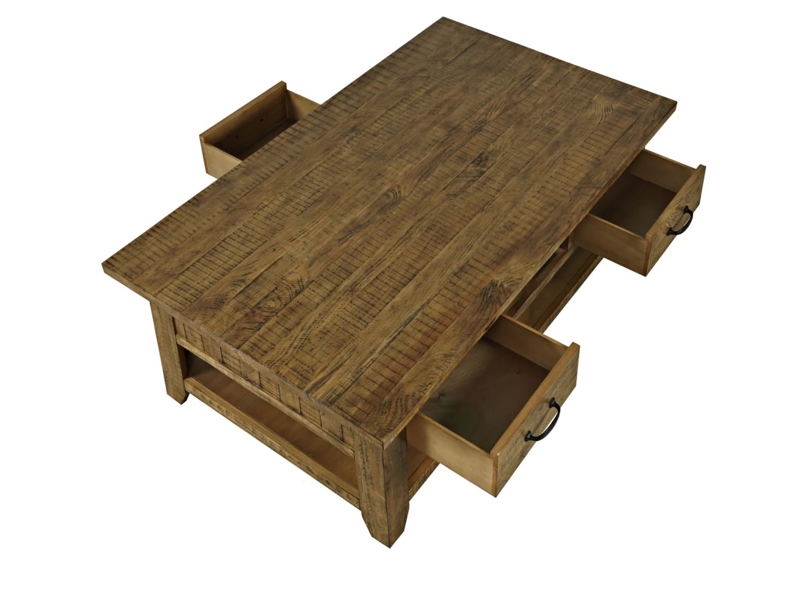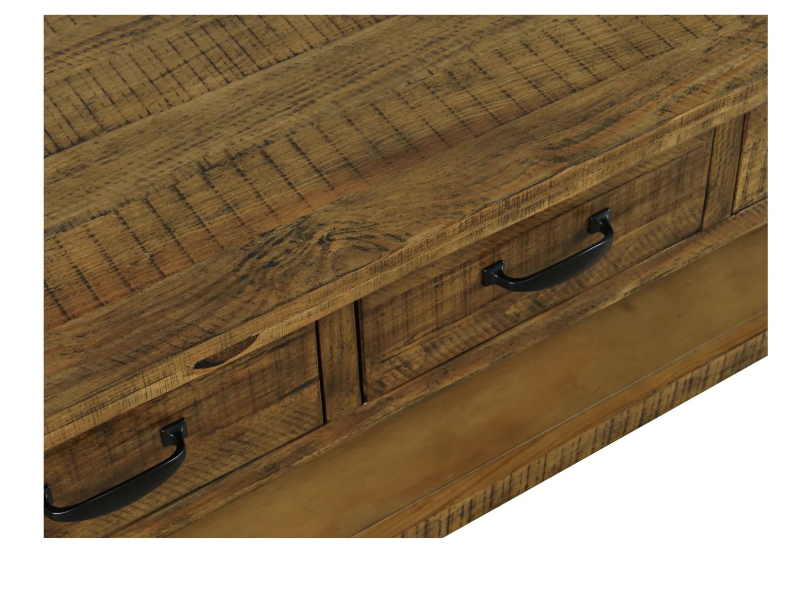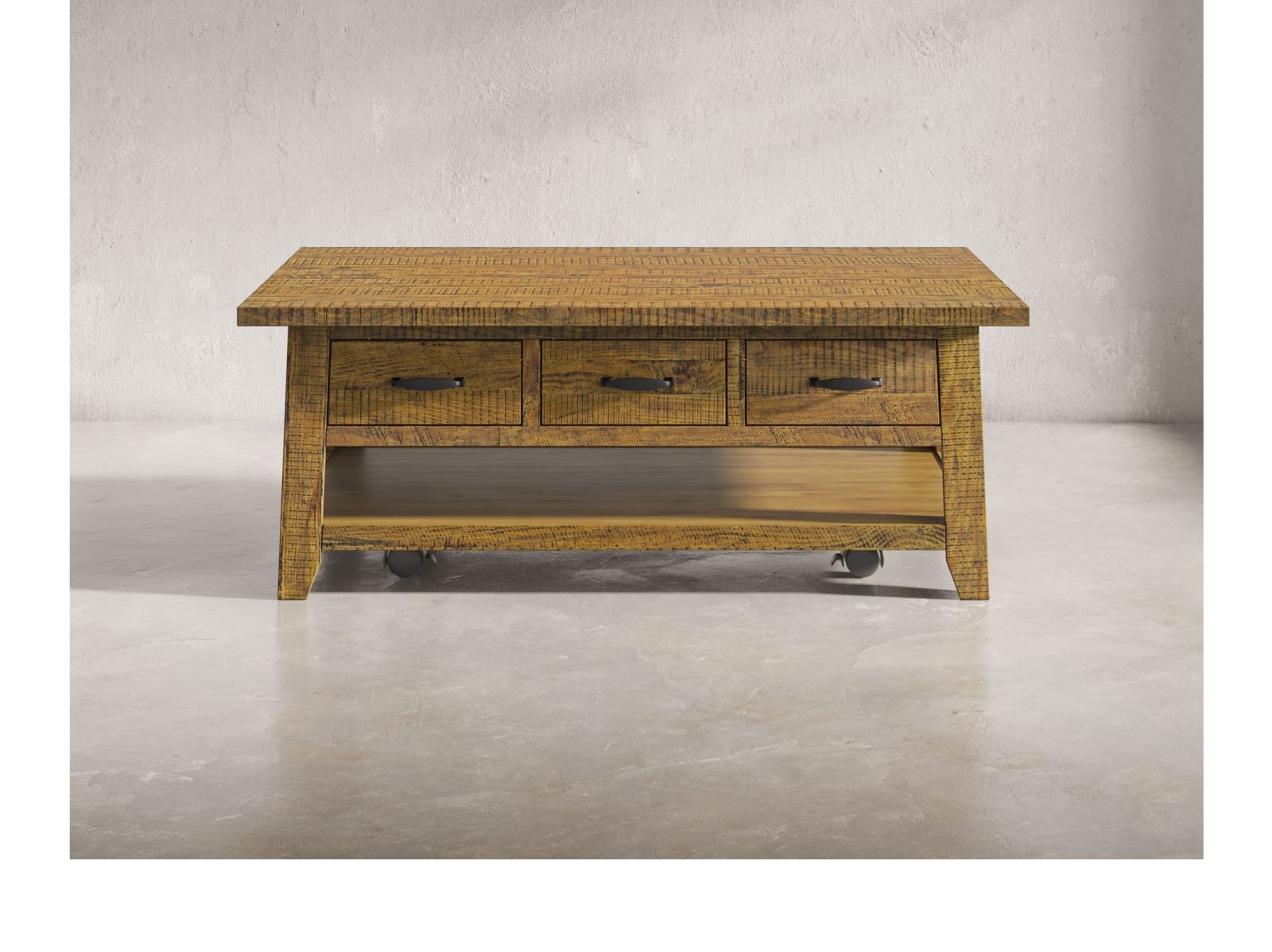 & Free ShippingThe Tafton Collection is the epitome of rustic style with its durable construction and natural pine. The subtle distressing make these bold statement pieces and the perfect added accent to your interior. This coffee table features three pull-through drawers, a shelf for open storage or display, and casters.