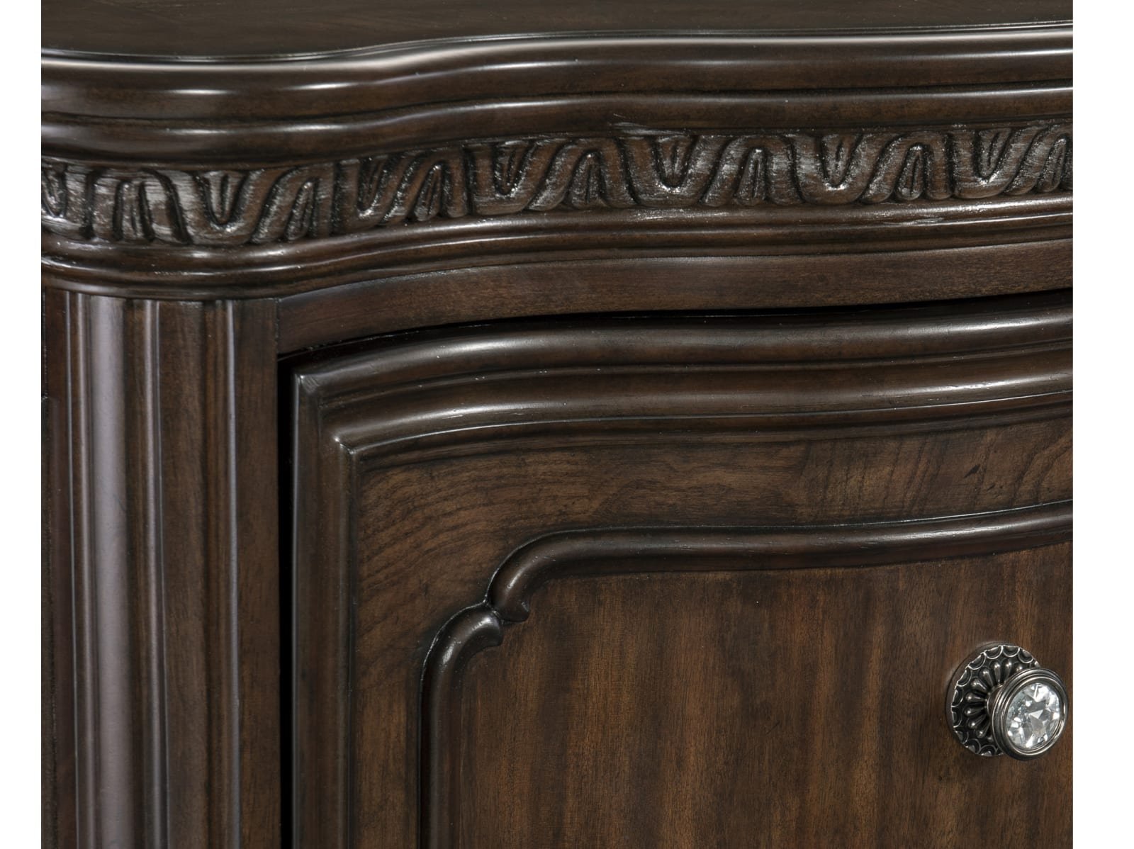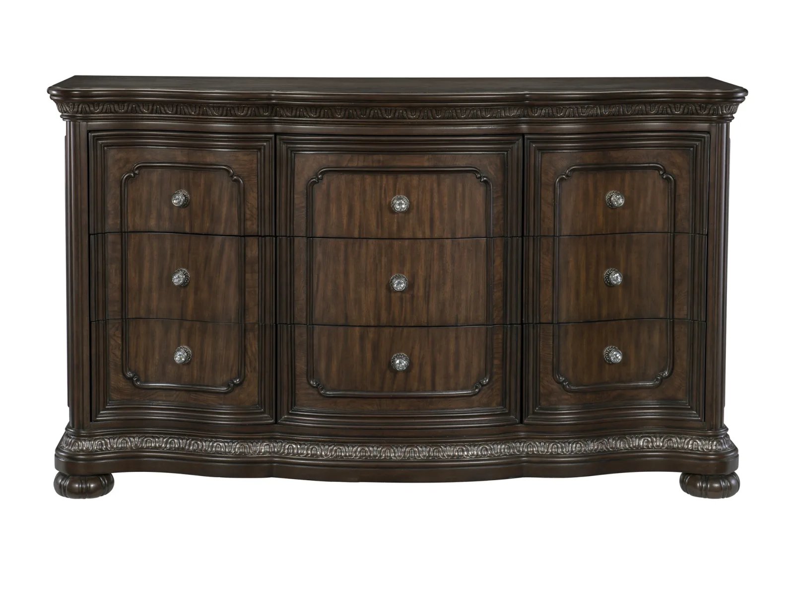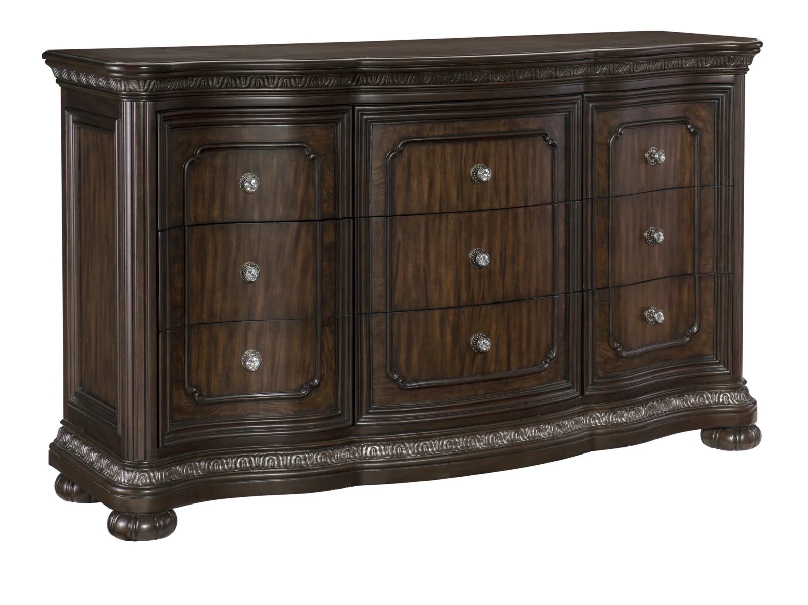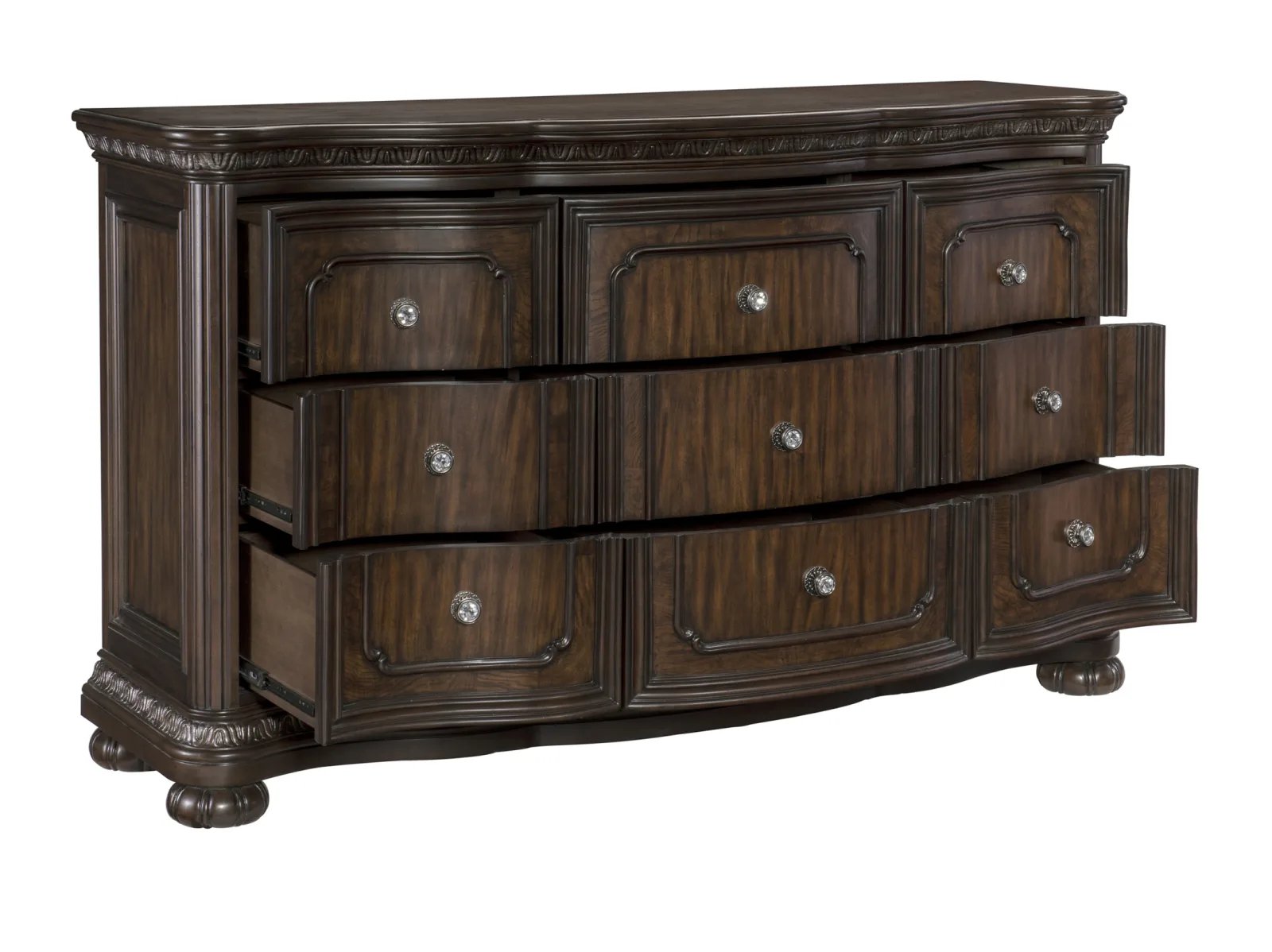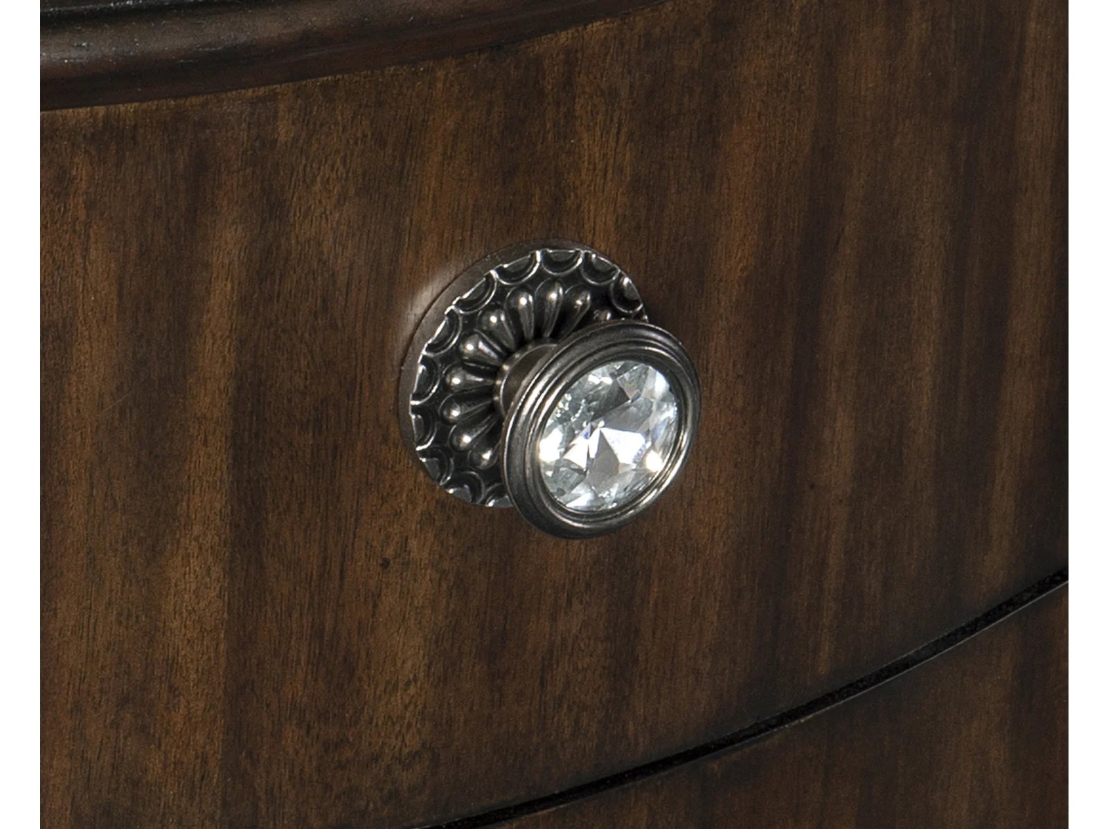 The traditional profile of the Tangiers Collection pairs classic accent with elegant highlight to create a timeless look for your bedroom. Stylized decorative molding defines the bow-fronted shape of the traditional dresser, as do the bun feet and picture frame molding that fronts the drawers. Primavera and ash burl veneer are finished in dark cherry for elegant enhancement of the wood’s grain. Each drawer front is centered by metal and faux crystal knob hardware, an unexpected combination that cements the grandeur of this collection.