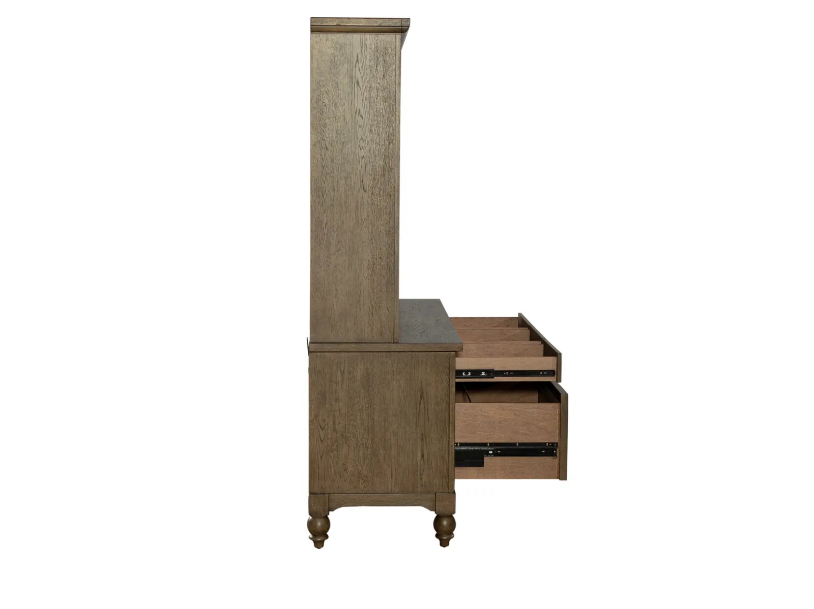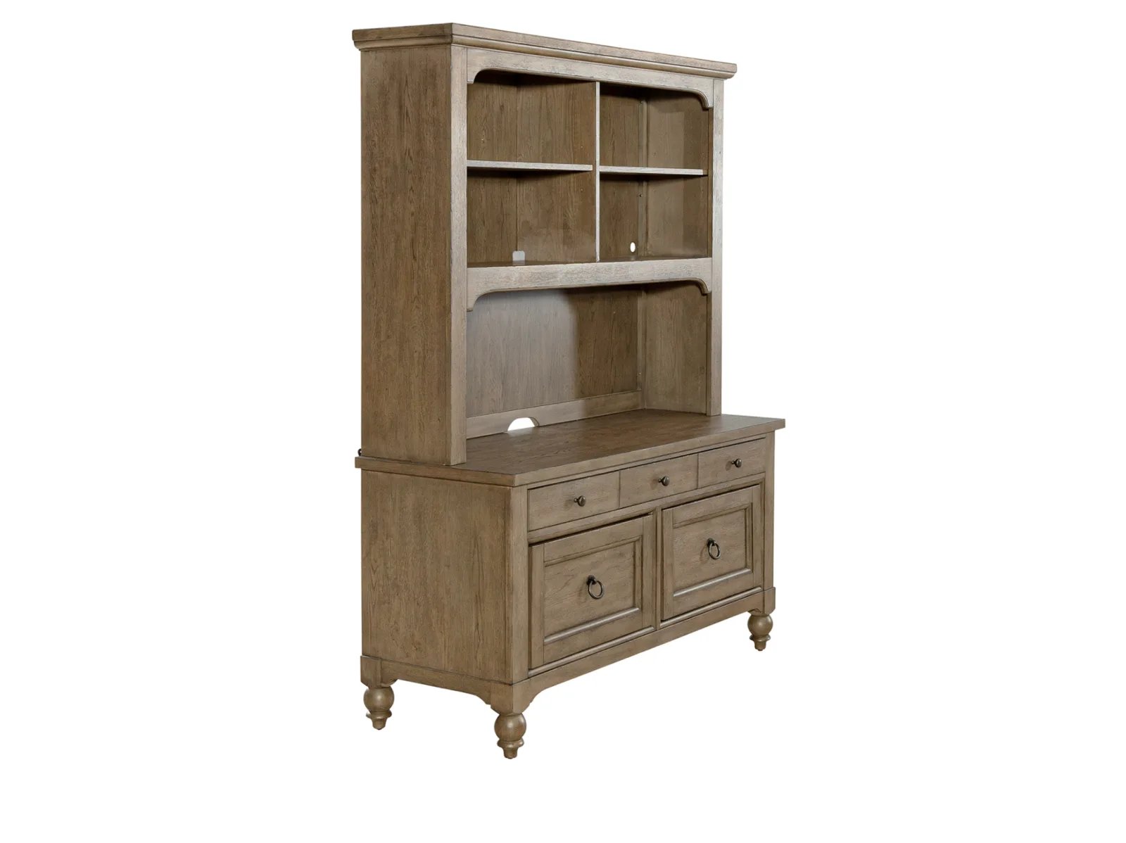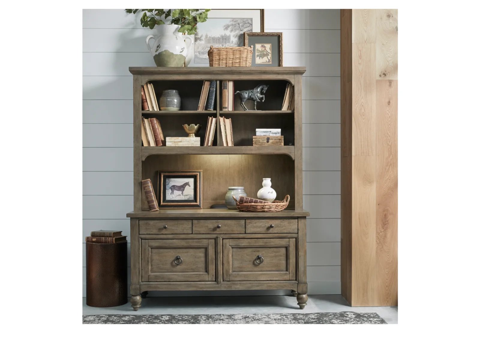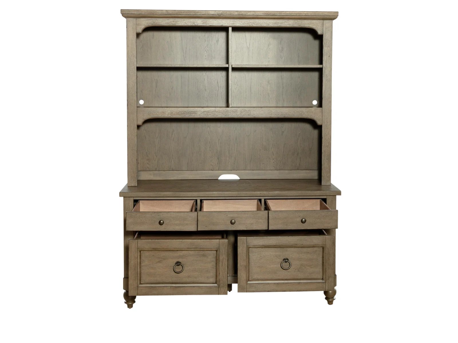 & Free ShippingBe distinctively different with the Taylorville Credenza and hutch set. Crafted of poplar solids with white oak veneers, this set features a wire brushed dusty taupe finish with worm hole distressing and is accented with antique brass drop ring and knob hardware. The credenza has a total of five full extension drawers including three top storage drawers and two wood framed file storage drawers. The hutch features wire management provisions and includes to fixed shelves and two adjustable shelves for display and storage. Taylorville evokes a style unconstrained and intended to be personal with an authentic craftsman’s flair and artistry.