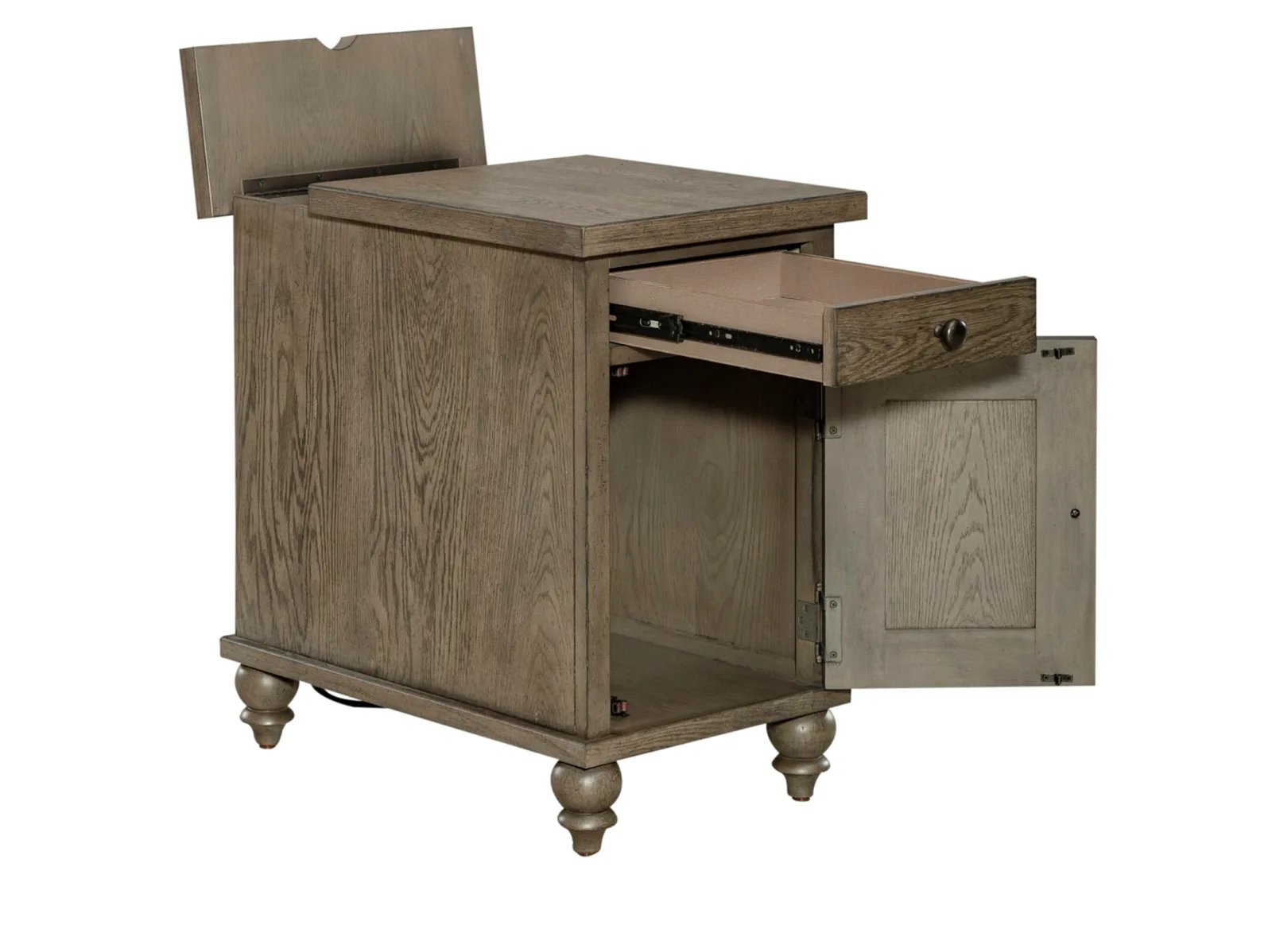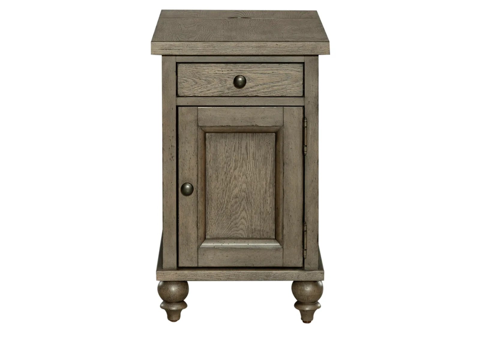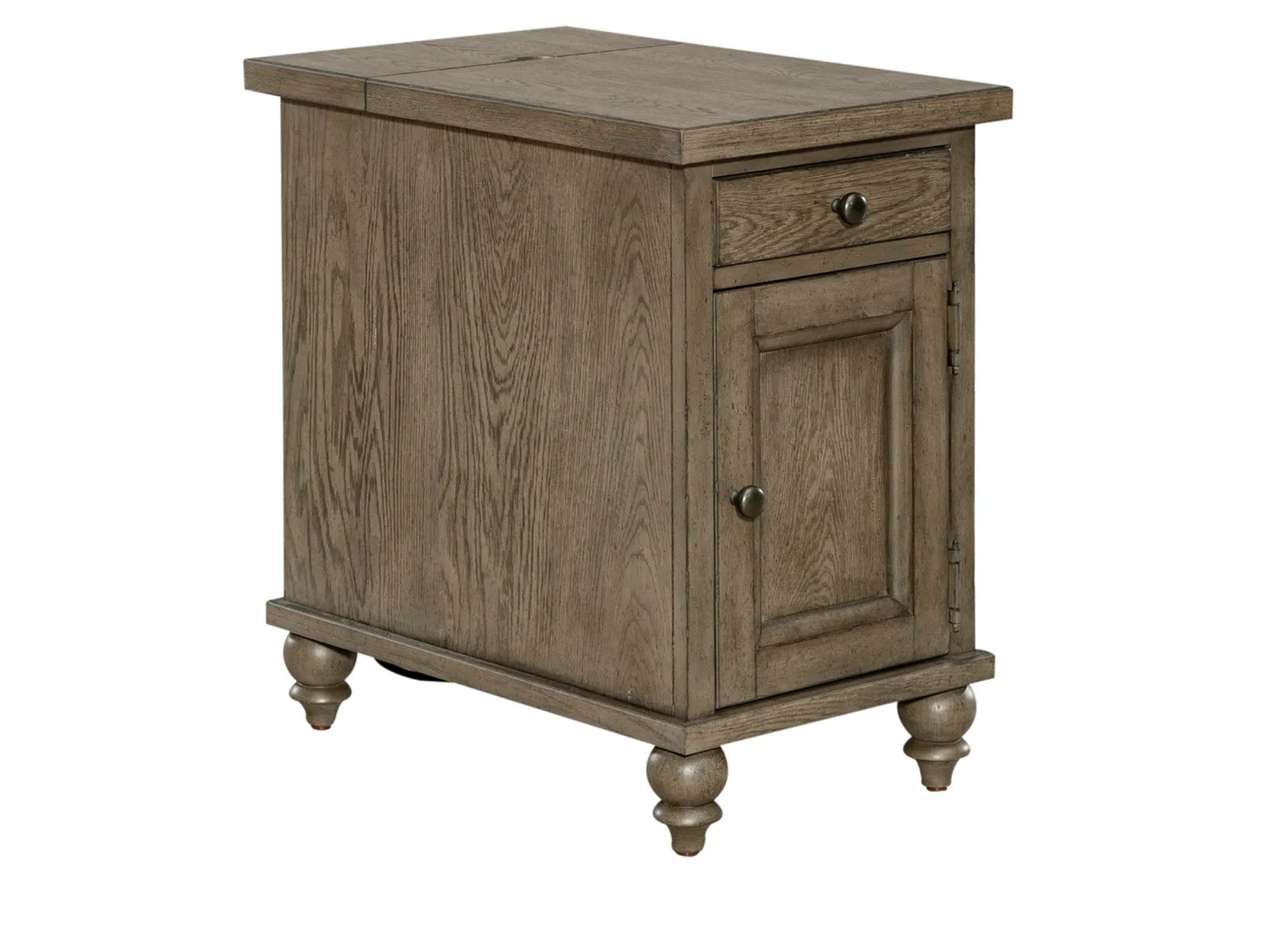 & Free ShippingScaled for just the right spot, Taylorville Chairside Table can be used between two recliners or a nightstand in the bedroom. Crafted of poplar solids and white oak veneers with a dusty taupe finish. Features one full extension drawer, a door for space to stash essentials and turned bun feet. This table is an excellent addition to any ensemble.