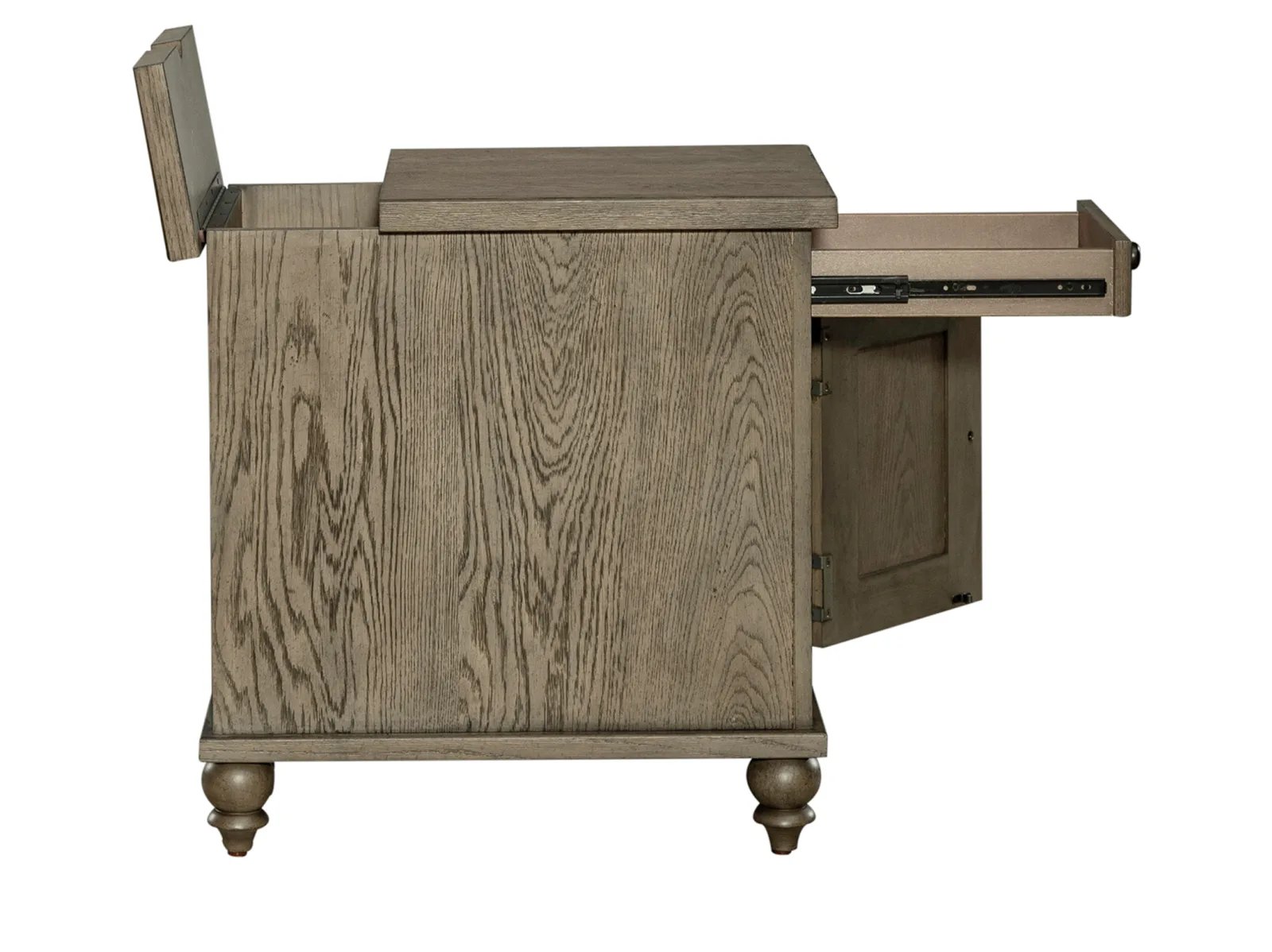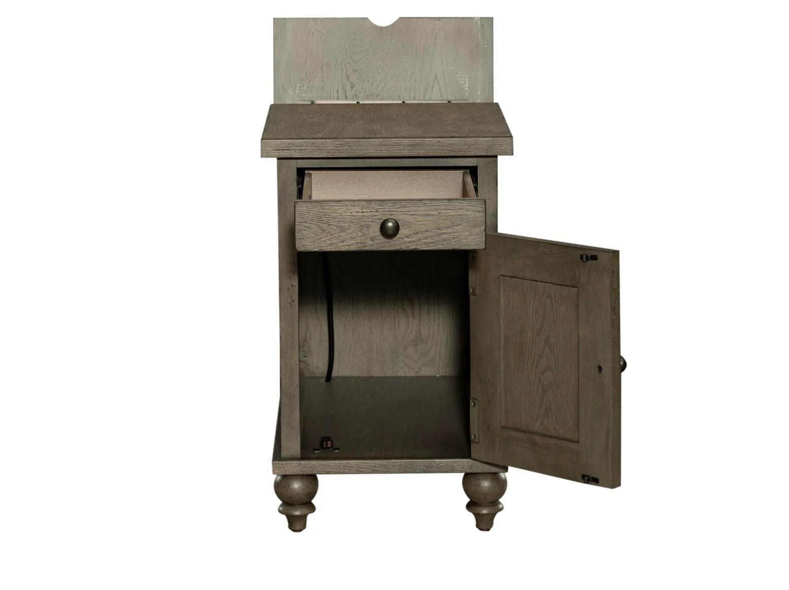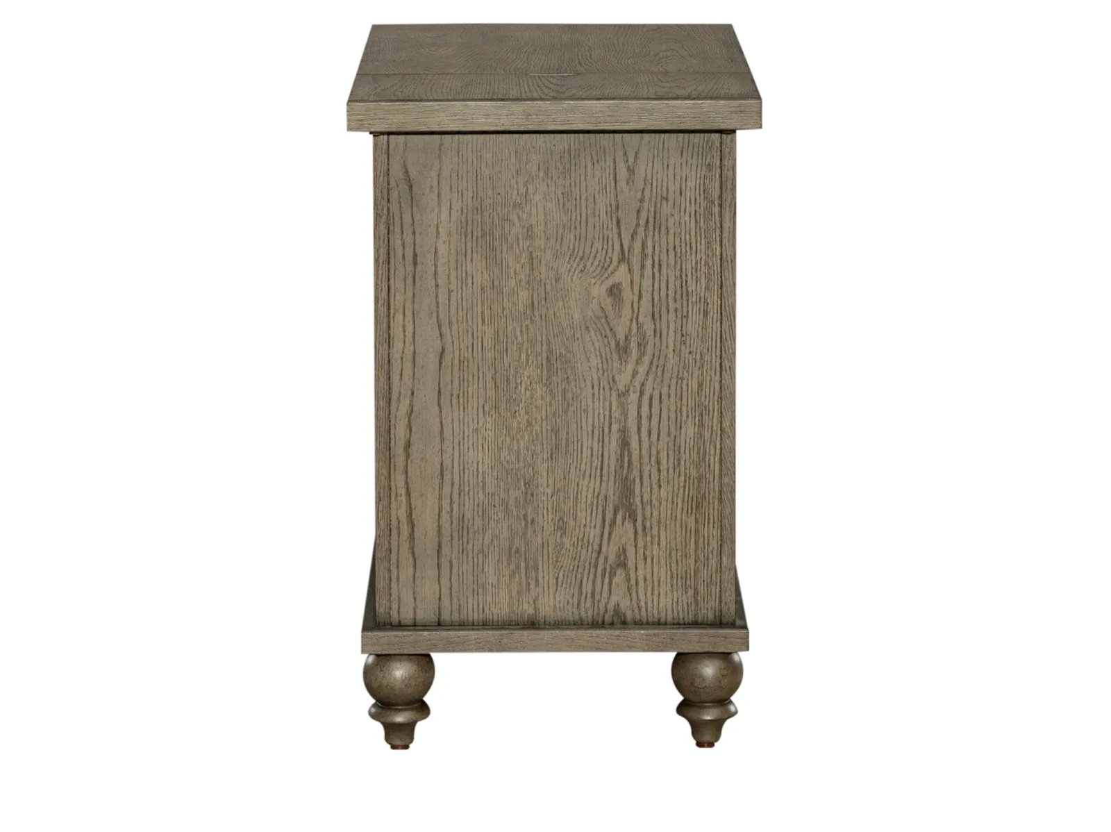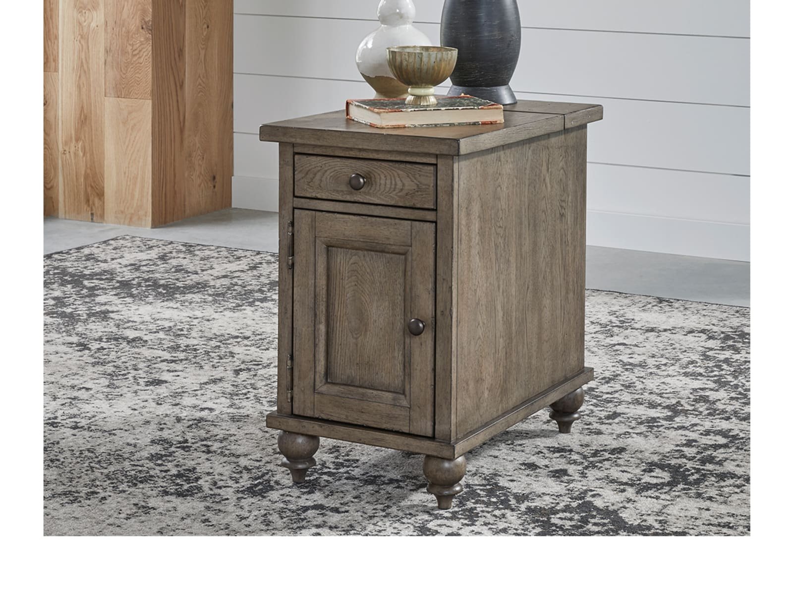 & Free ShippingScaled for just the right spot, Taylorville Chairside Table can be used between two recliners or a nightstand in the bedroom. Crafted of poplar solids and white oak veneers with a dusty taupe finish. Features one full extension drawer, a door for space to stash essentials and turned bun feet. This table is an excellent addition to any ensemble.