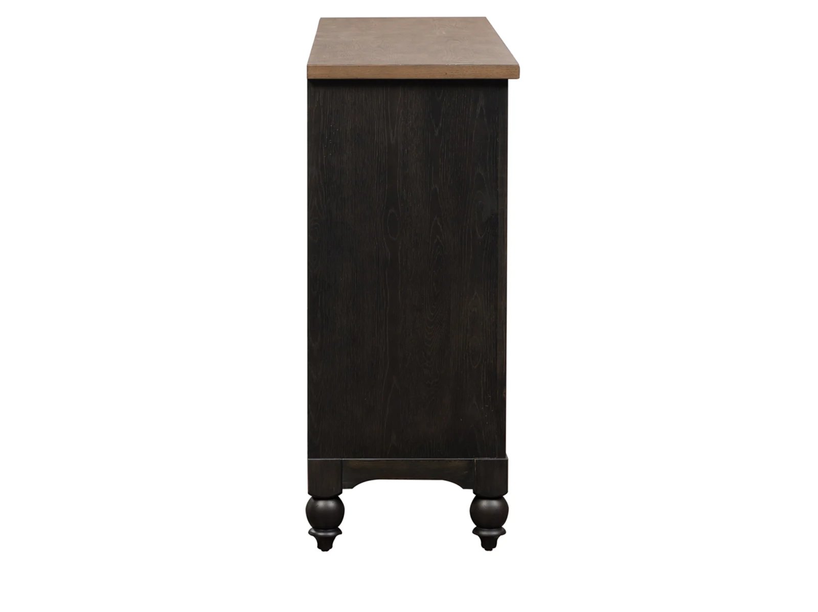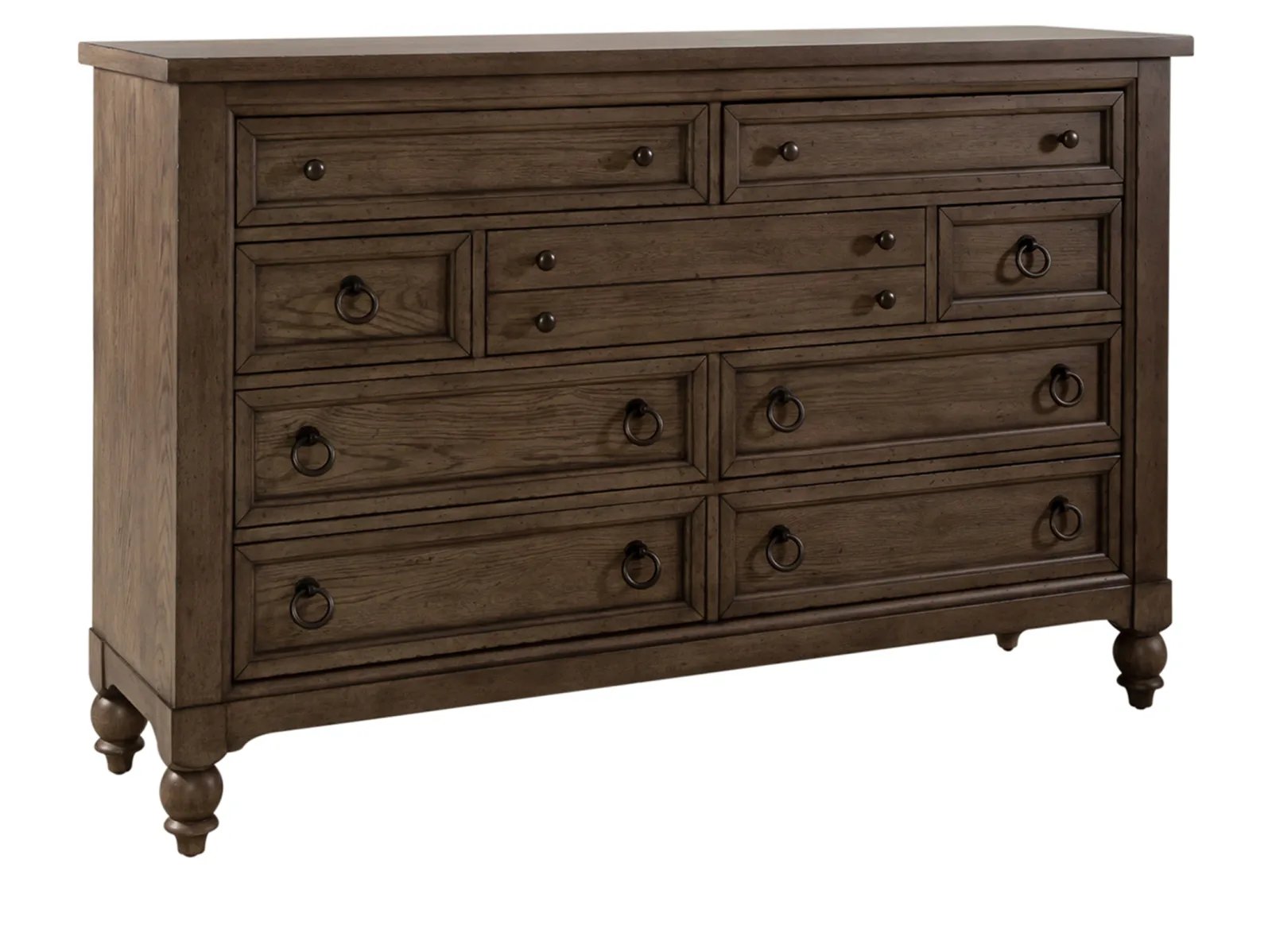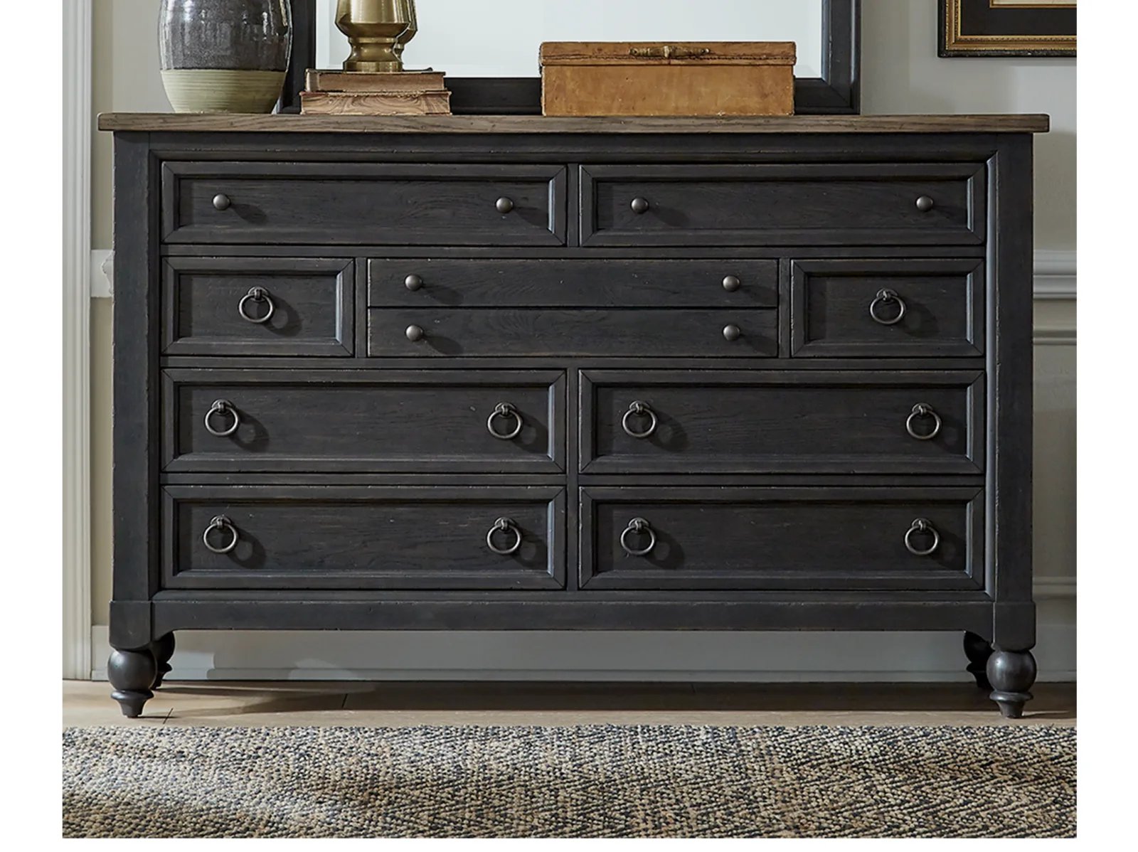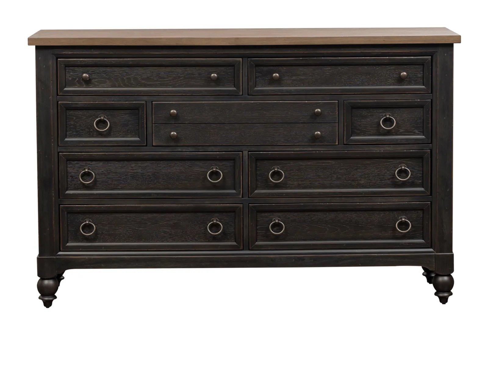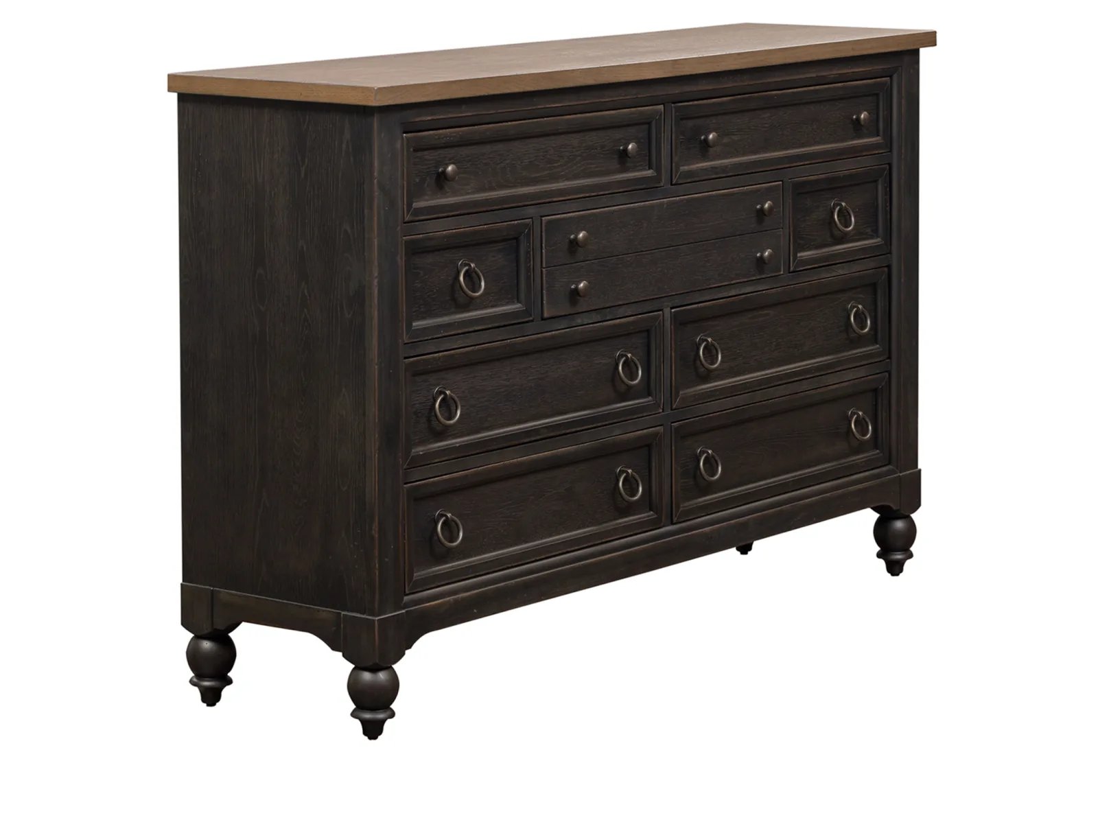 & Free ShippingThe Taylorville Dresser adds timeless allure to all bedrooms. Built from poplar solids with white oak veneers, this storage case features nine drawers with French/English dovetail construction and elegant carved details, all sitting atop metal center glides for effortless functionality. The dusty taupe finished top poses a sophisticated contrast to the moody black finished base, accented by antique brass hardware on the drawer fronts for a suave final touch. With the Taylorville Dresser in your bedroom space, you’ll never fall short on class or style.