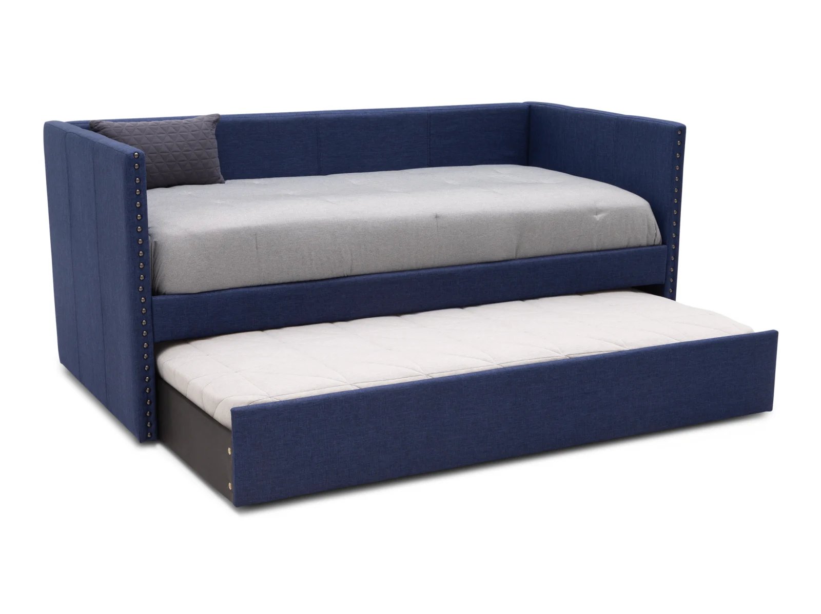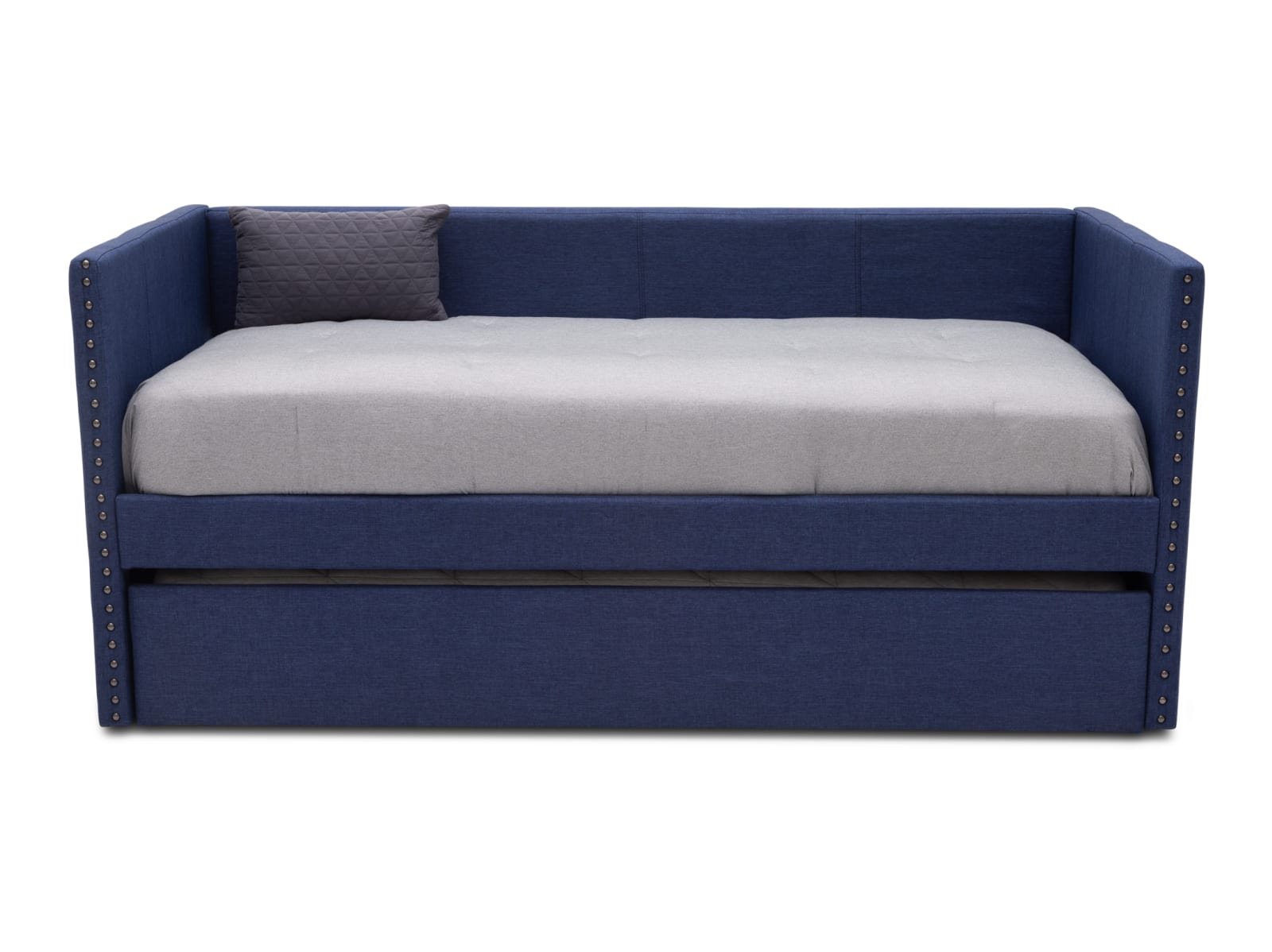 The beautiful deep blue fabric covering of the Therese Daybed blended with nailhead trim and clean lines creates a look that will complement your home decor. Whether used for sleeping or relaxing, this contemporary daybed design allows for placement in a number of room sizes and configurations, while the underbed trundle pulls out to accommodate your additional sleep space needs. Bring home the Therese today.