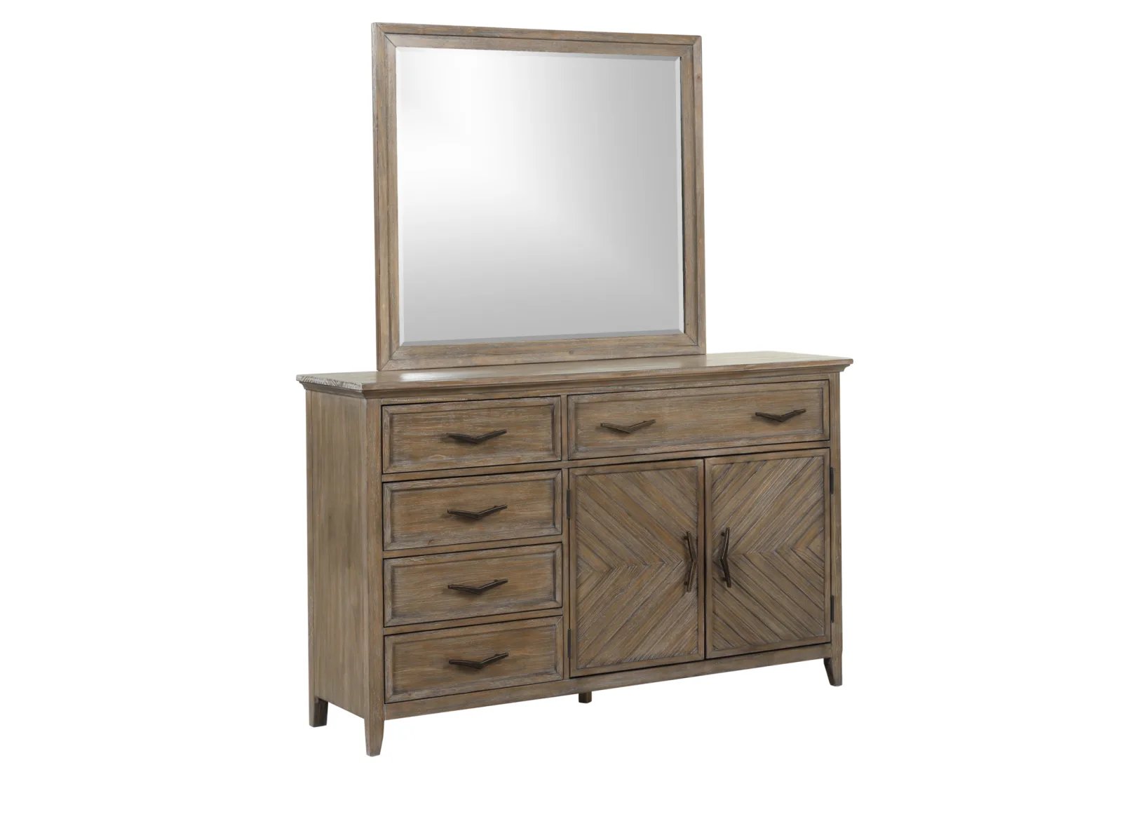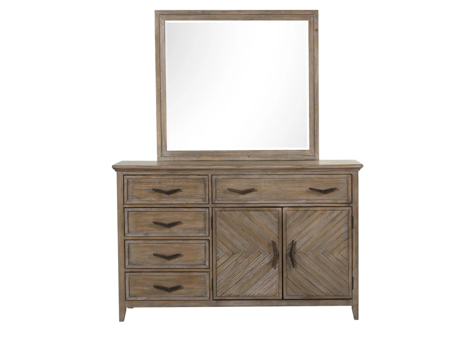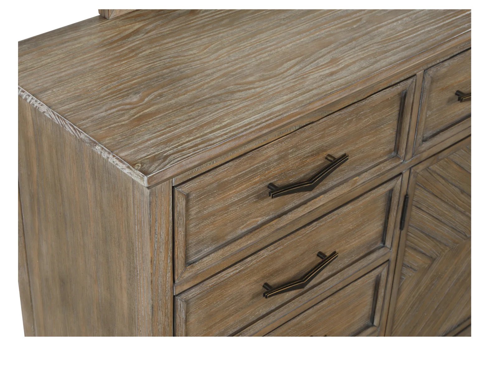 The Thibodeaux Bedroom Collection embodies rustic charm and timeless appeal. Crafted with premium pine solids and veneers, this collection showcases the natural beauty and durability of the wood. The French front and English back dovetailed drawers ensure reliable functionality and strength. With finished drawer interiors, every detail exudes refinement. The felt-lined top drawers provide a touch of luxury and protection for delicate items. Antique bronze drawer pulls add a vintage touch, while the reverse diamond pattern accents create a visually captivating focal point. The beveled mirrors add depth and elegance to the collection. The dresser features an adjustable shelf behind the door, offering versatile storage options, while the chest conceals two adjustable shelves. With its rustic sand finish, the Thibodeaux Bedroom Collection exudes warmth and character, creating a cozy and inviting atmosphere in any bedroom.