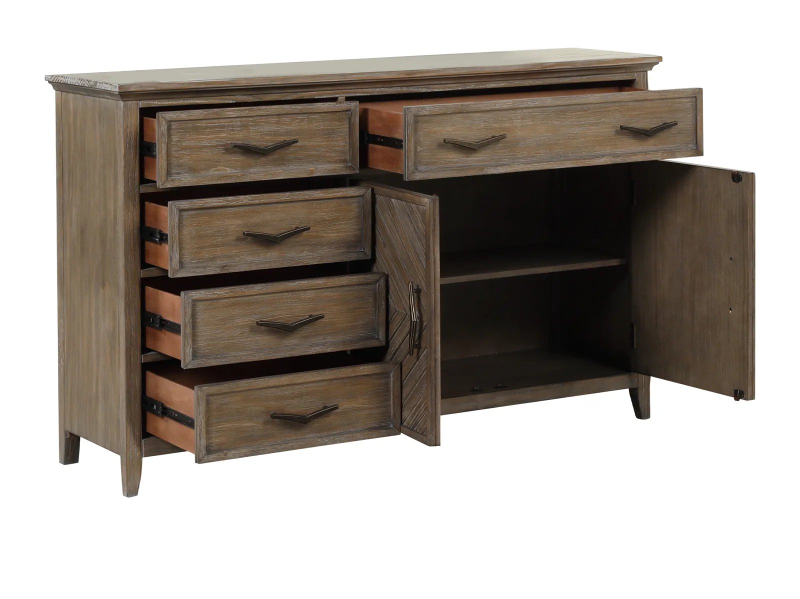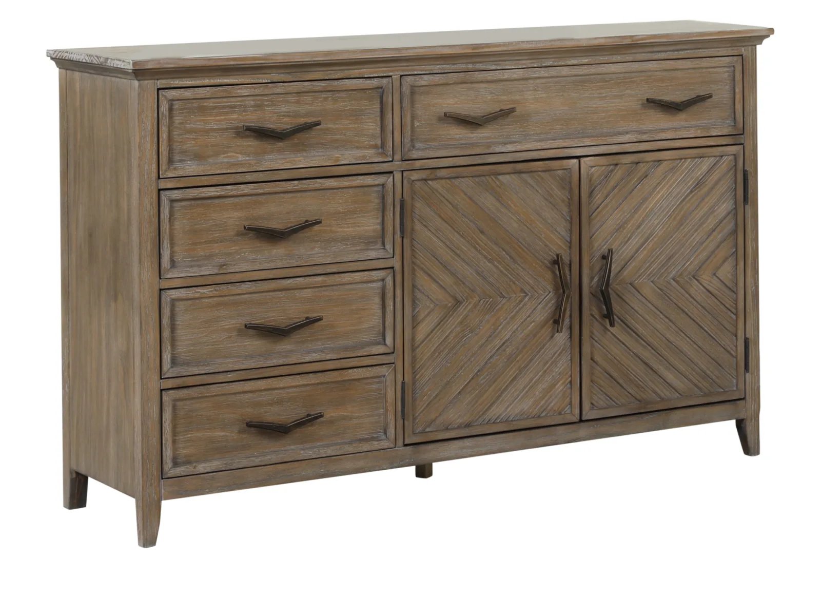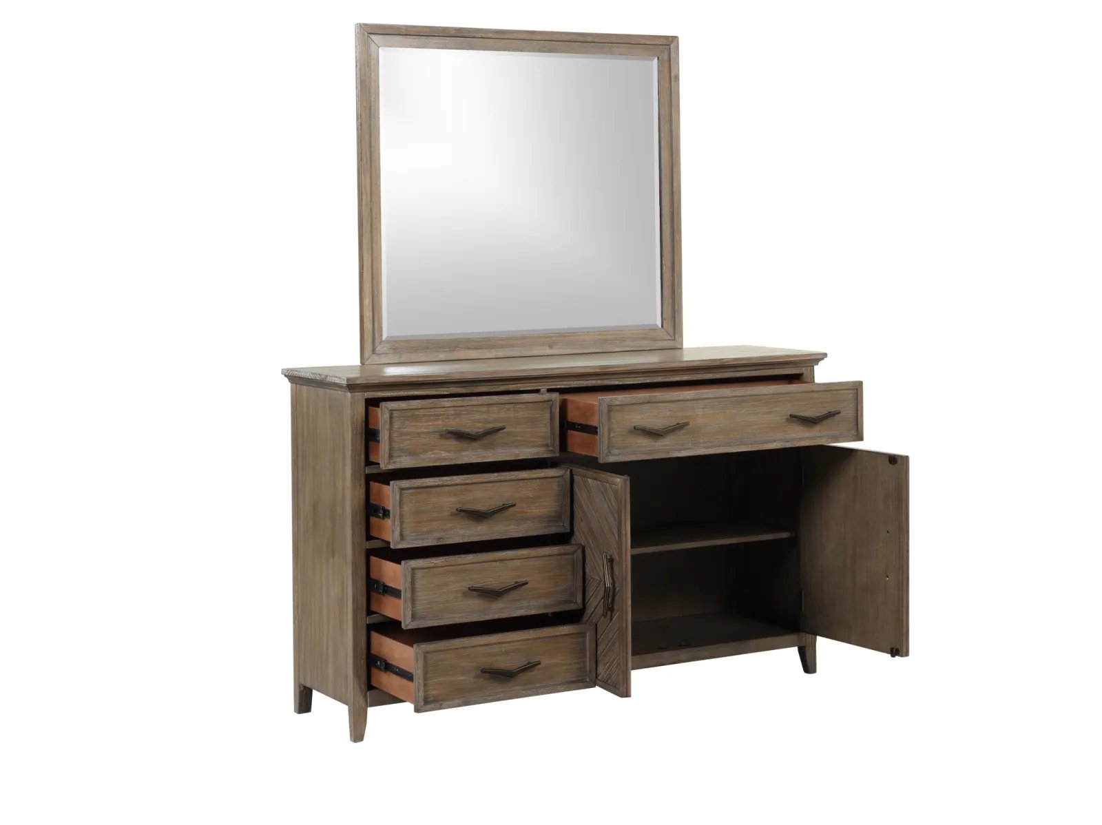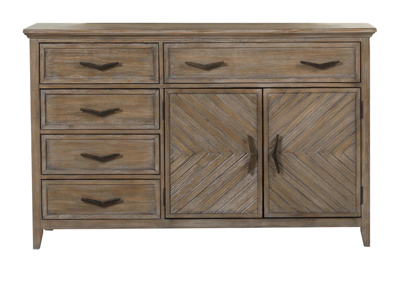 The Thibodeaux Bedroom Collection embodies rustic charm and timeless appeal. Crafted with premium pine solids and veneers, this collection showcases the natural beauty and durability of the wood. The French front and English back dovetailed drawers ensure reliable functionality and strength. With finished drawer interiors, every detail exudes refinement. The felt-lined top drawers provide a touch of luxury and protection for delicate items. Antique bronze drawer pulls add a vintage touch, while the reverse diamond pattern accents create a visually captivating focal point. The beveled mirrors add depth and elegance to the collection. The dresser features an adjustable shelf behind the door, offering versatile storage options, while the chest conceals two adjustable shelves. With its rustic sand finish, the Thibodeaux Bedroom Collection exudes warmth and character, creating a cozy and inviting atmosphere in any bedroom.