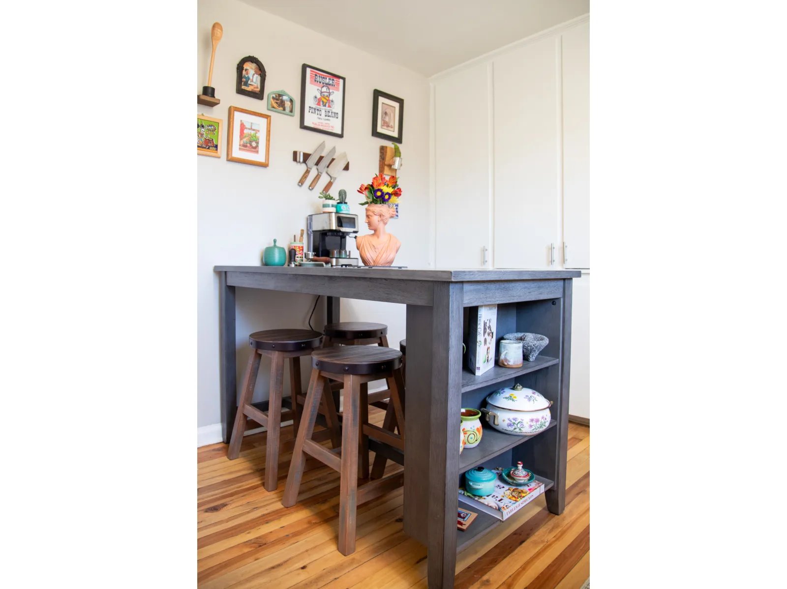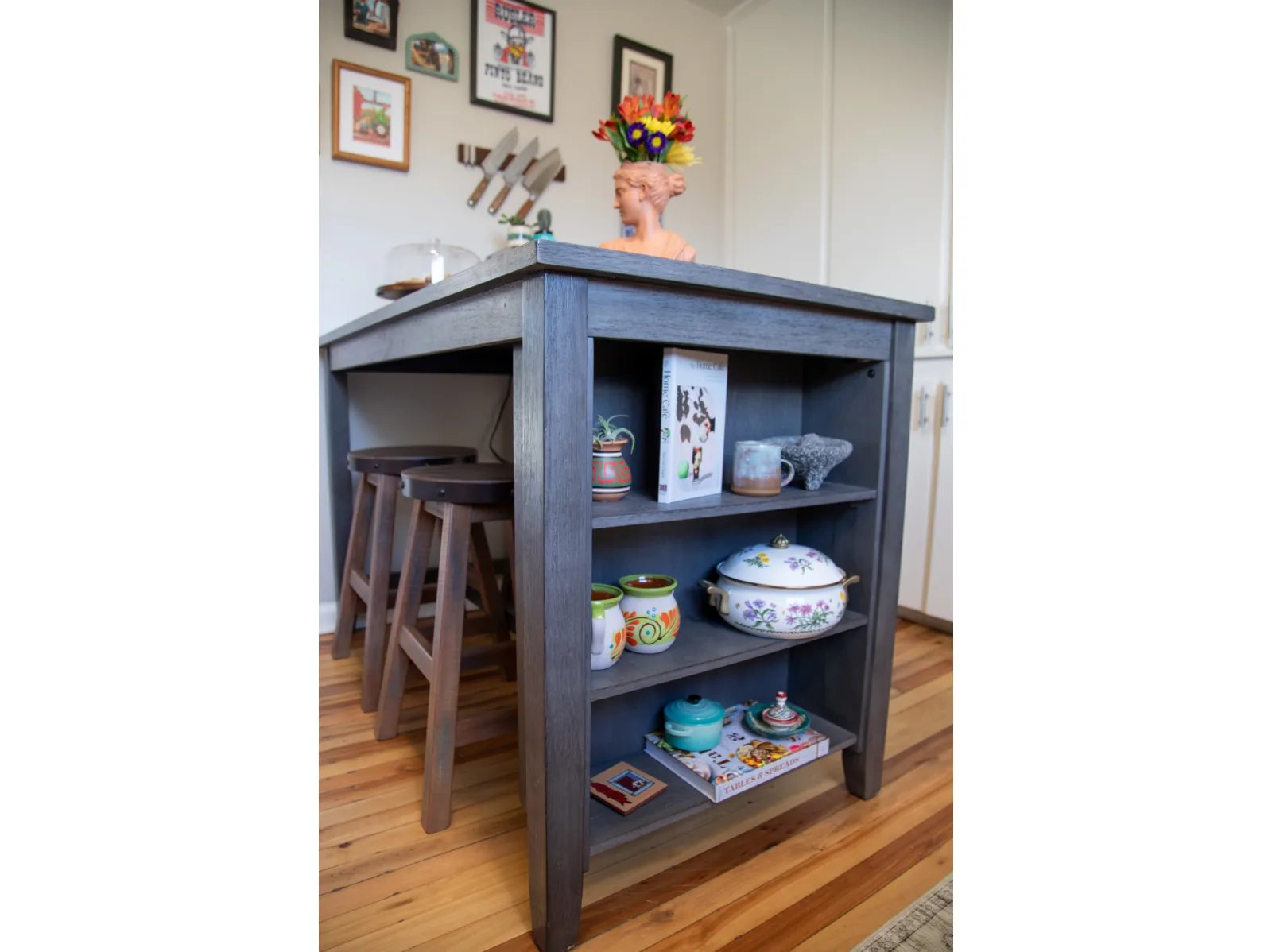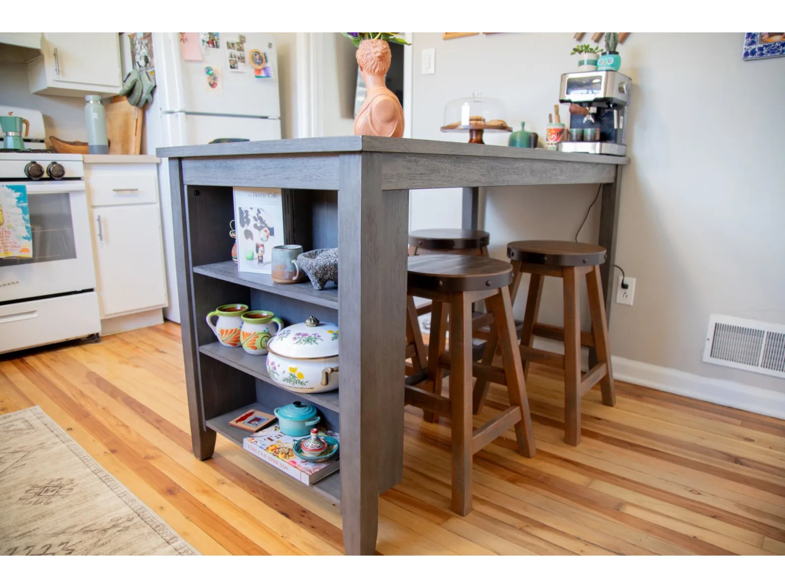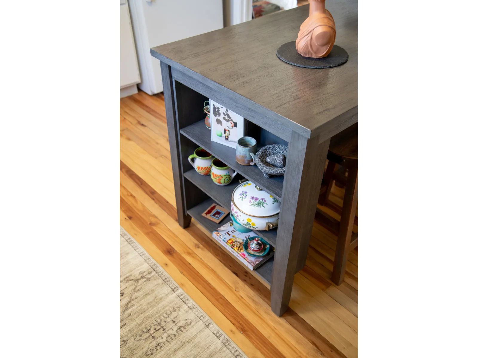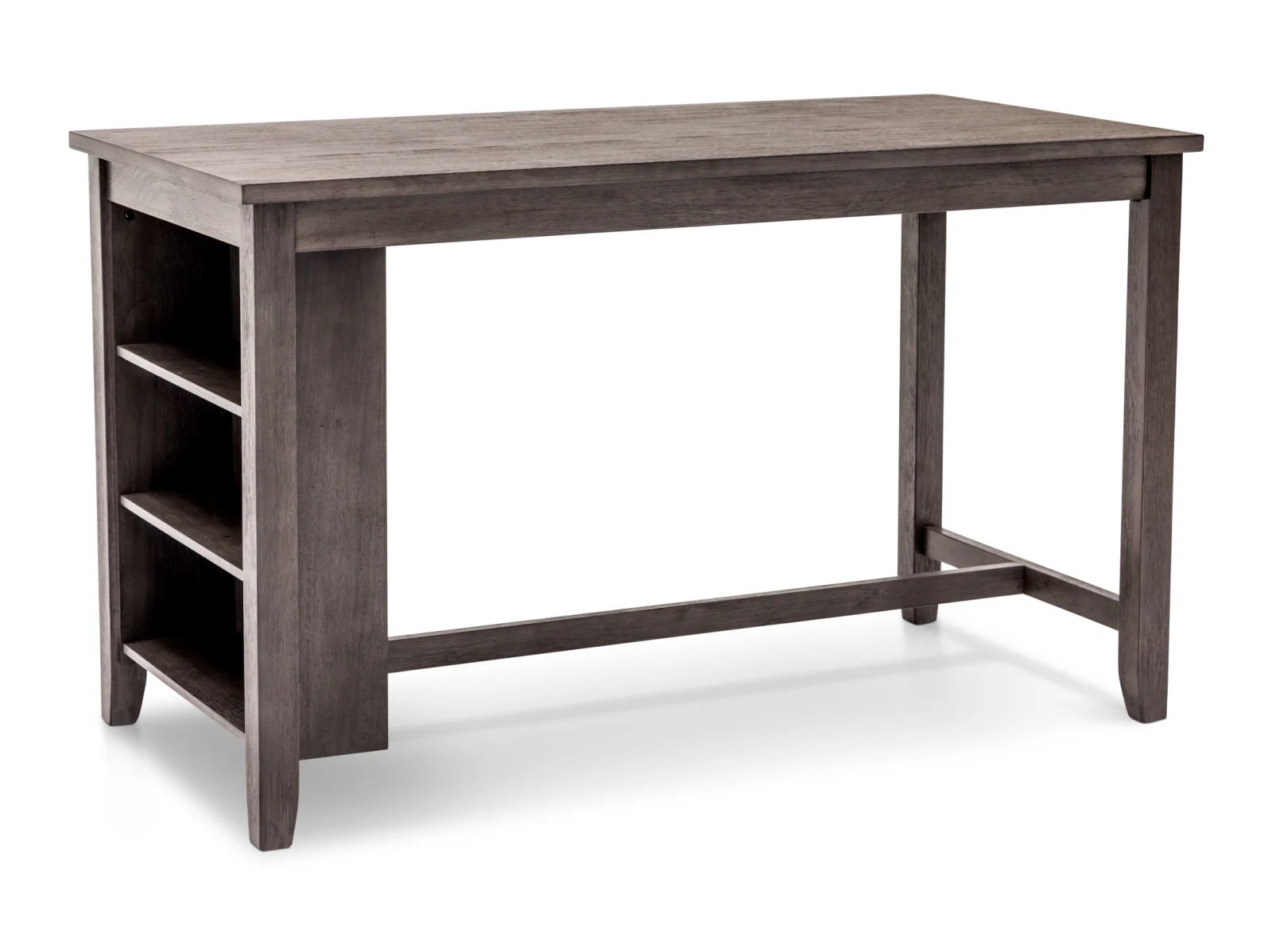 & Free ShippingThe multifunctional design of the Timber Counter Height Table will be the perfect addition to your dining nook. A built-in bookcase provides open display space to this stunning piece. A wire-brushed, gray finish highlights the acacia solids and veneers for a transitional appearance. Bring home this handsome table today.