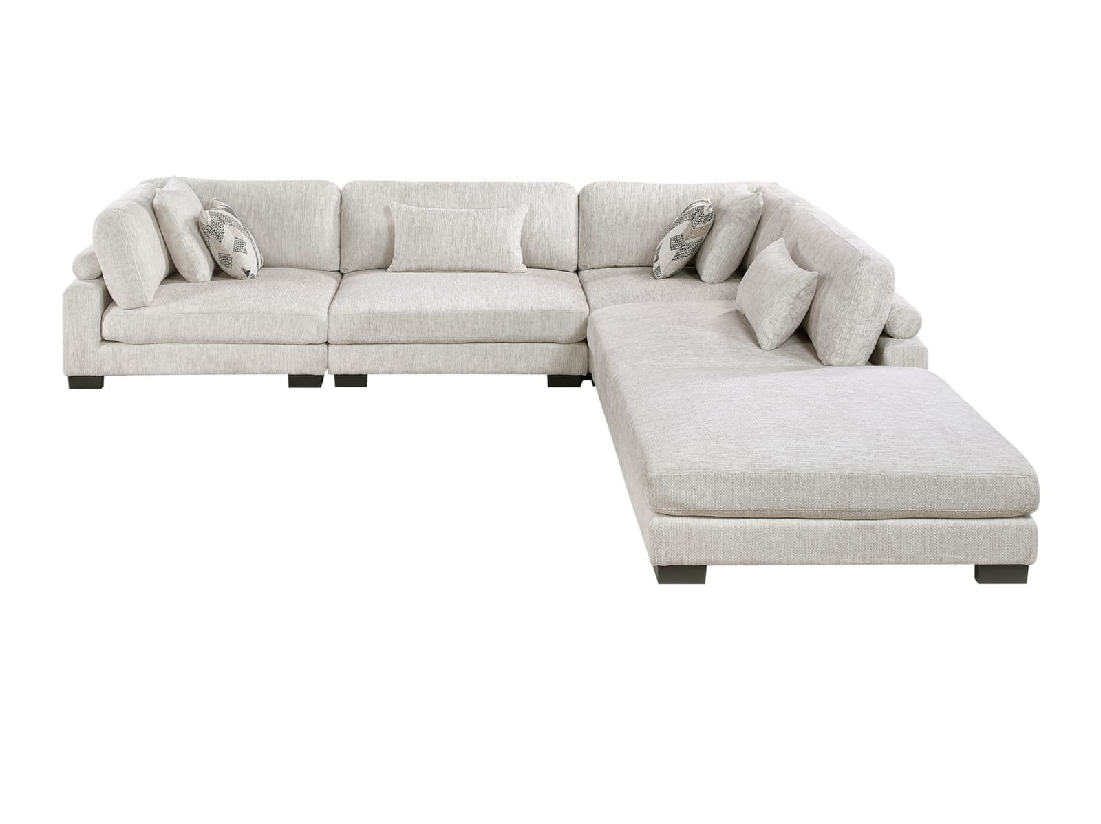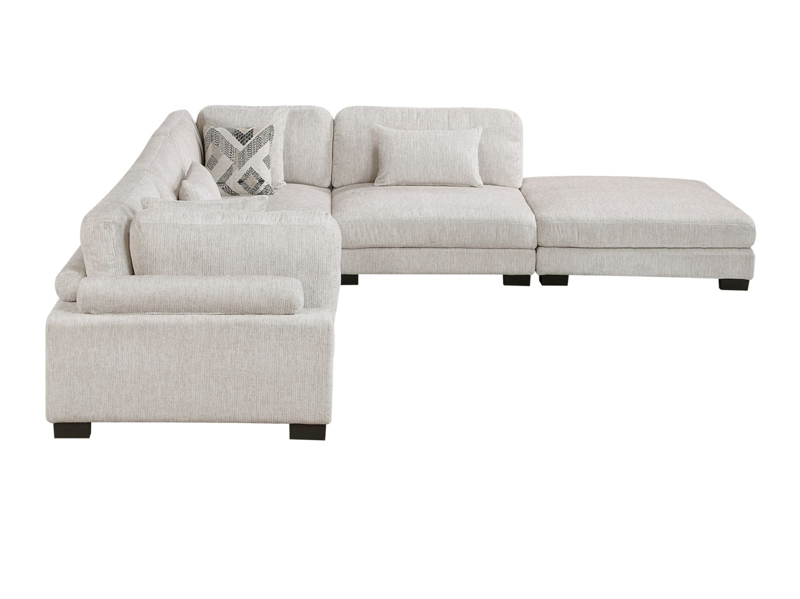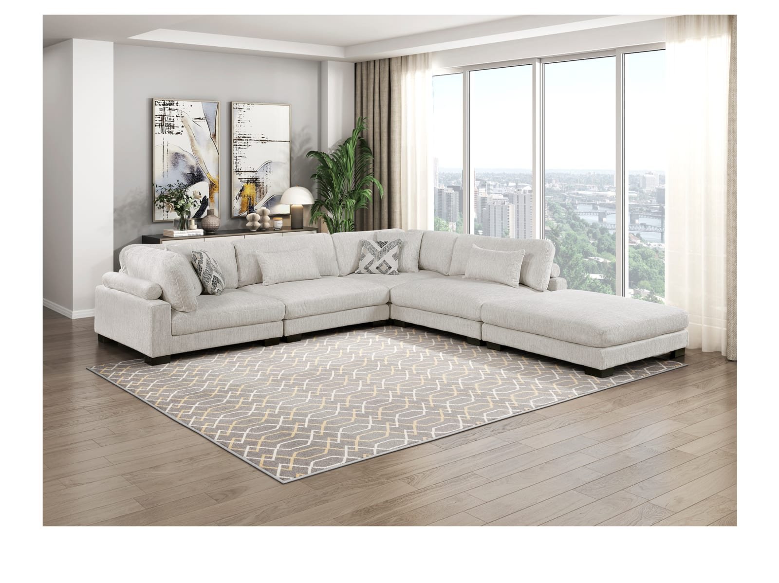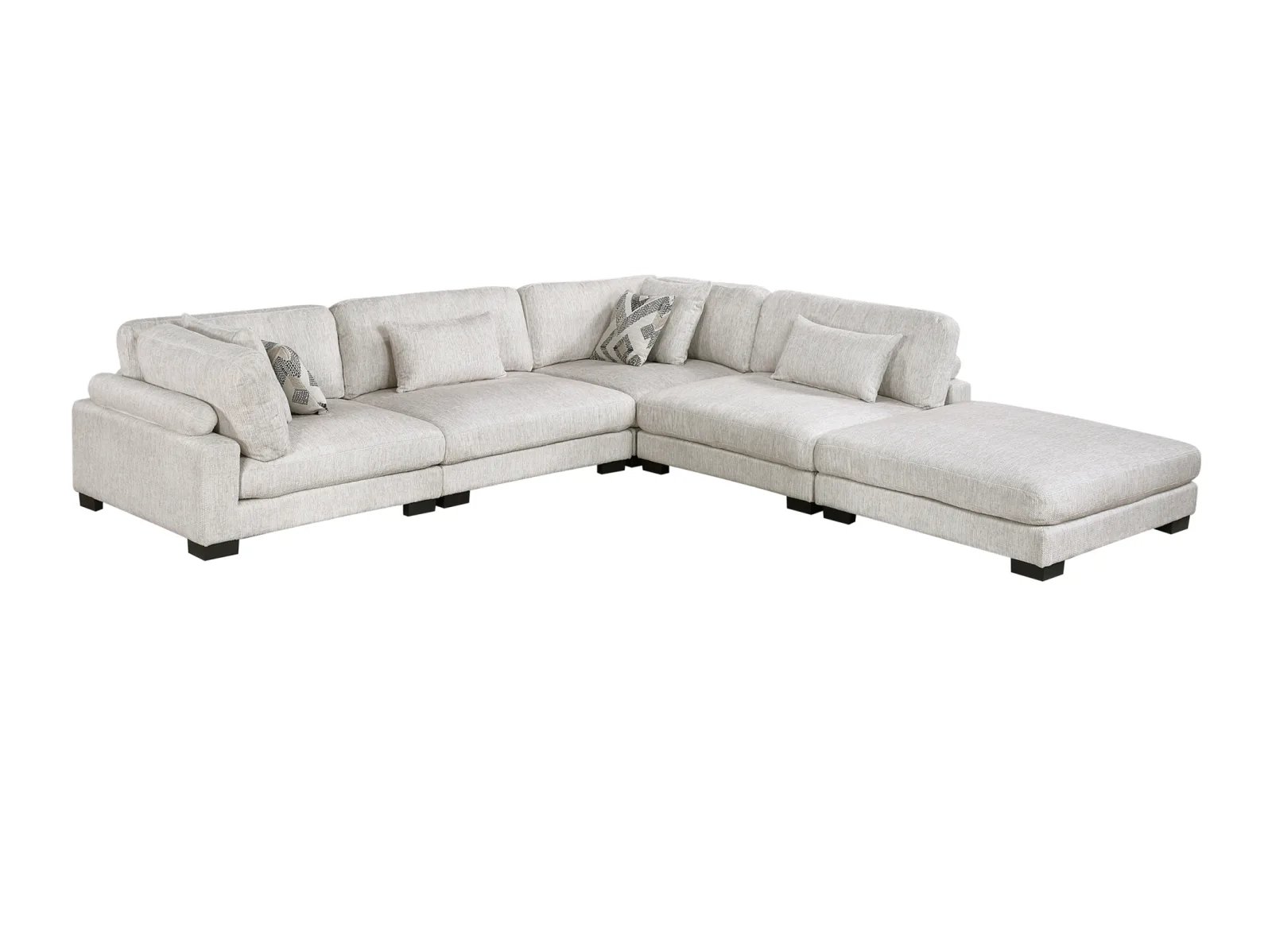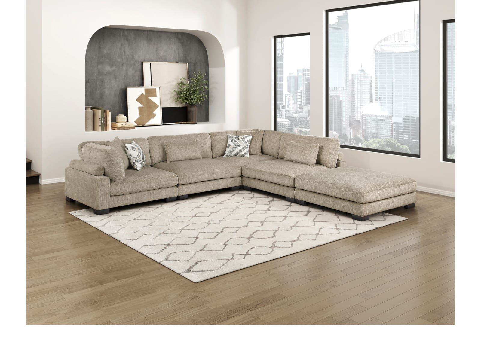 Build your ideal seating arrangement with the Tinsley 5 Pc. Sectional w/ Ottoman, featuring a streamlined modular design in textured microfiber fabric. Available in beige or sand colors, this versatile configuration includes a corner seat, an armless chair with plush cushioning and lumbar pillow, and a multipurpose ottoman that serves as a footrest or extra seating. Reversible cushions provide easy care and extended durability, while two matching toss pillows add contemporary comfort. Add the low-profile Tinsley 5 Pc. Sectional w/ Ottoman to your home today!