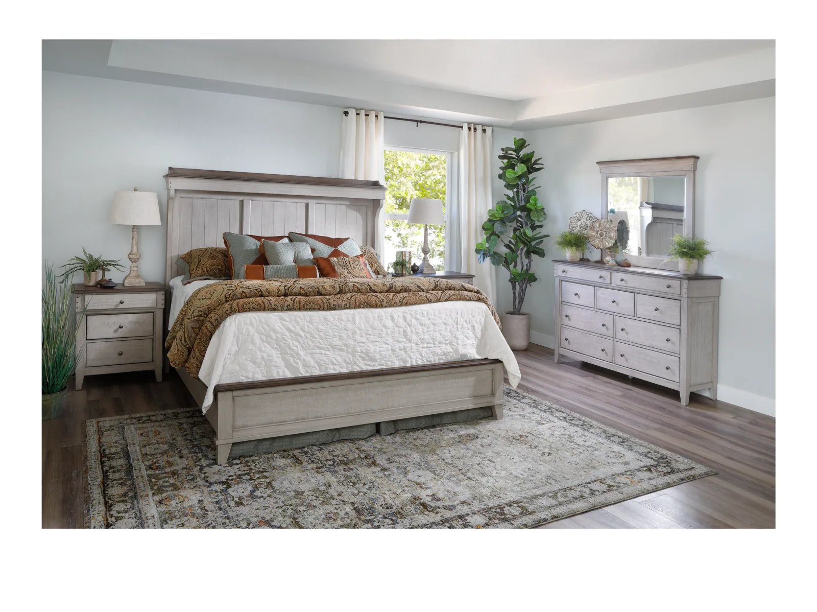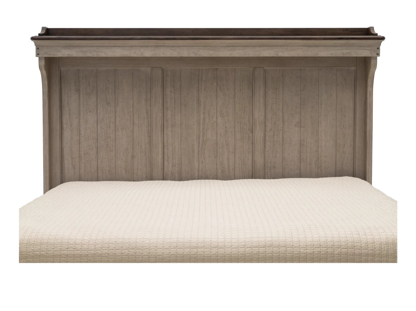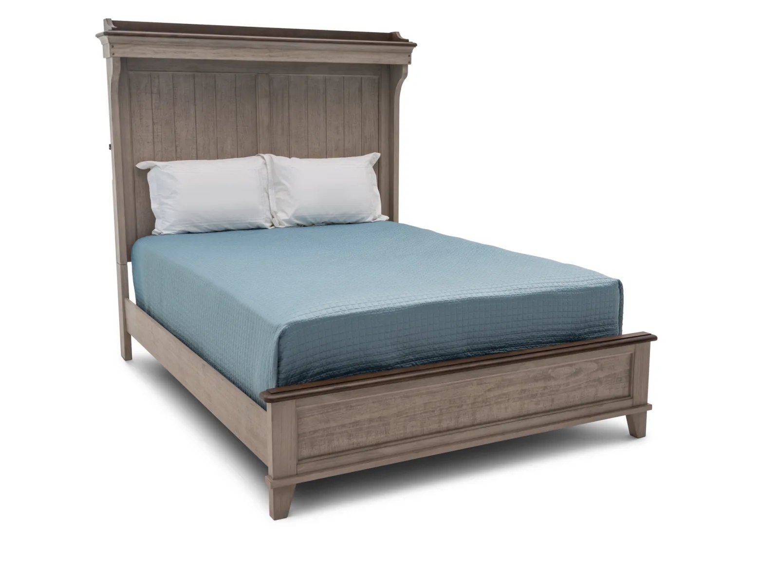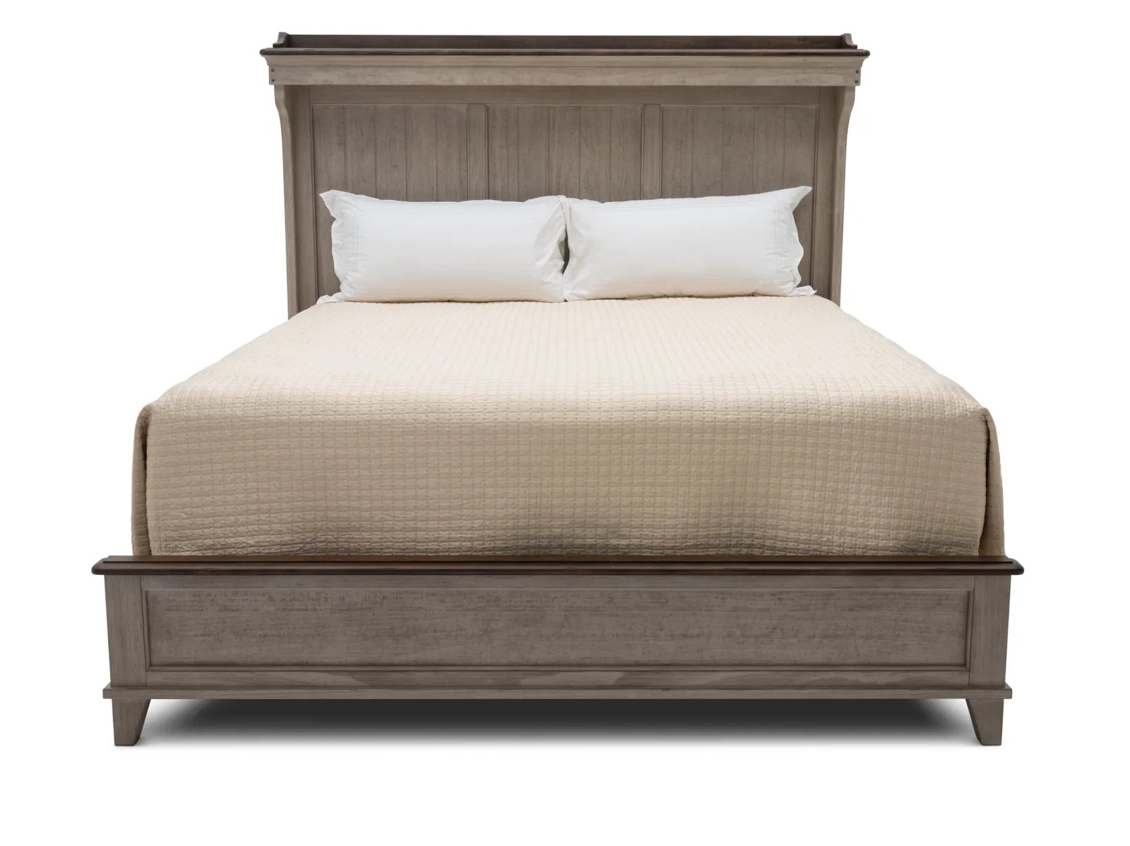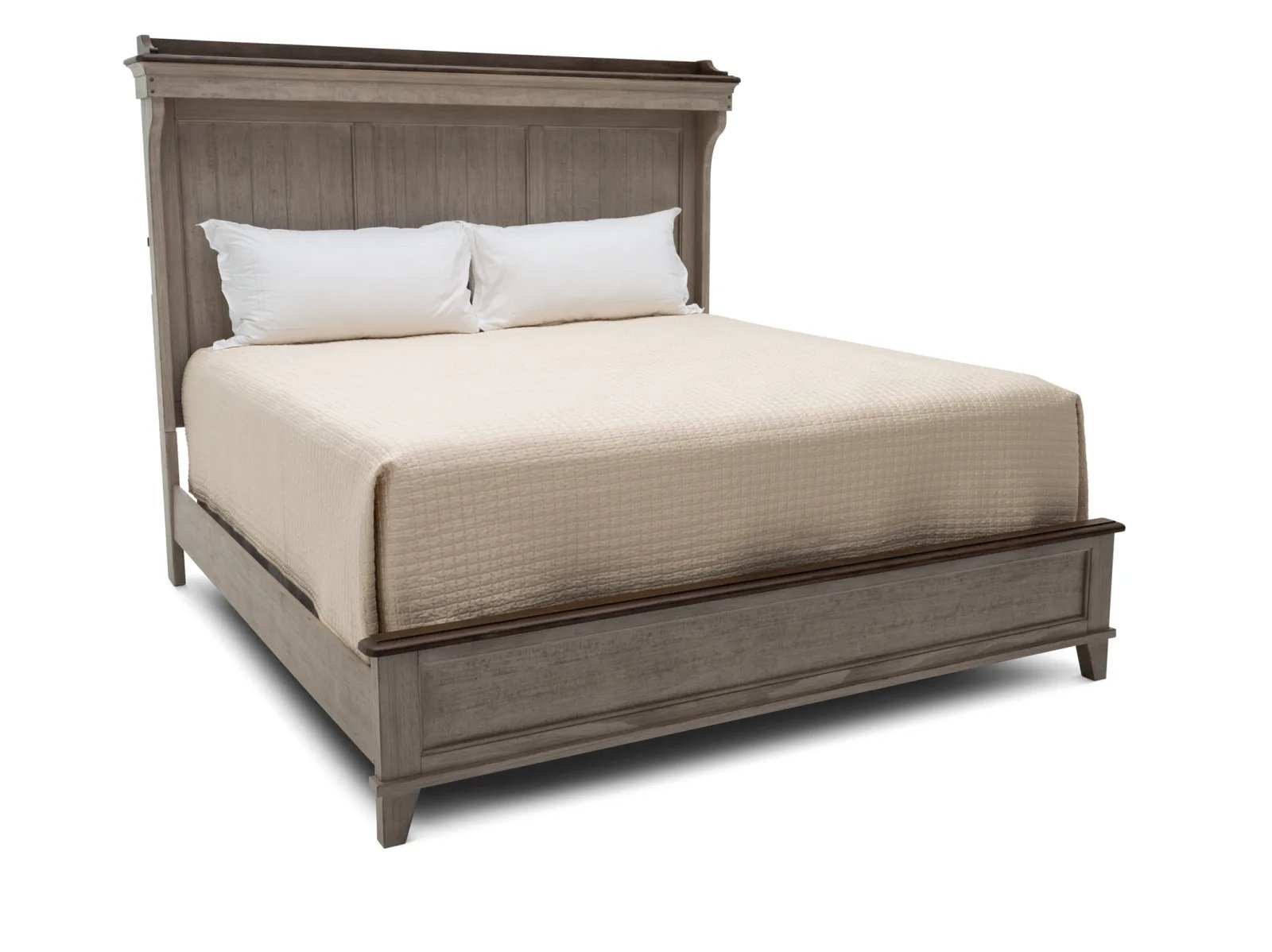 With a stately silhouette and a timeless two-toned color palette, the Tipton Mantle Bed delivers classic farmhouse style in unforgettable fashion. This charming bed is made from poplar solids with heavily distressed pine alder veneers in two attractive finishes: creamy Weathered Linen topped with warm Dusty Taupe. Eyes are quickly drawn to the Tipton’s impressive headboard which offers rustic planked detailing and features a stunning shaped mantle crown complete with LED lighting. Transform your bedroom with the one-of-a-kind Tipton Mantle Bed.