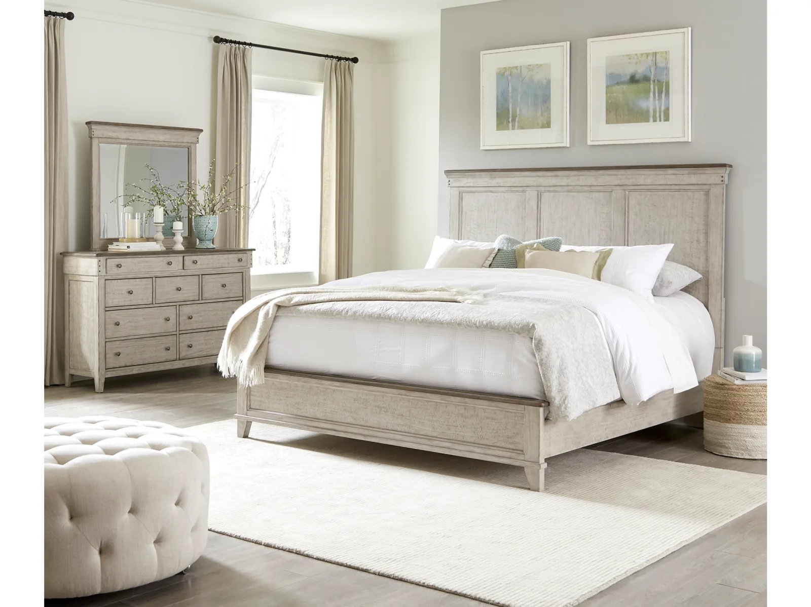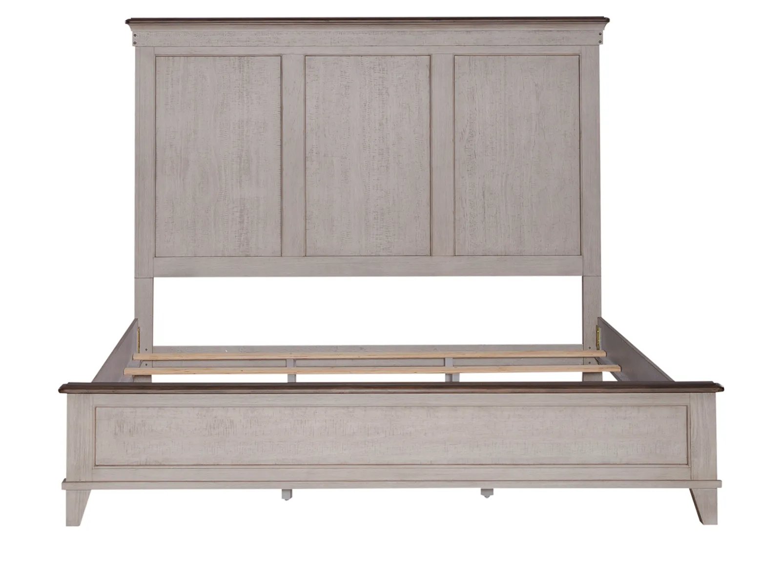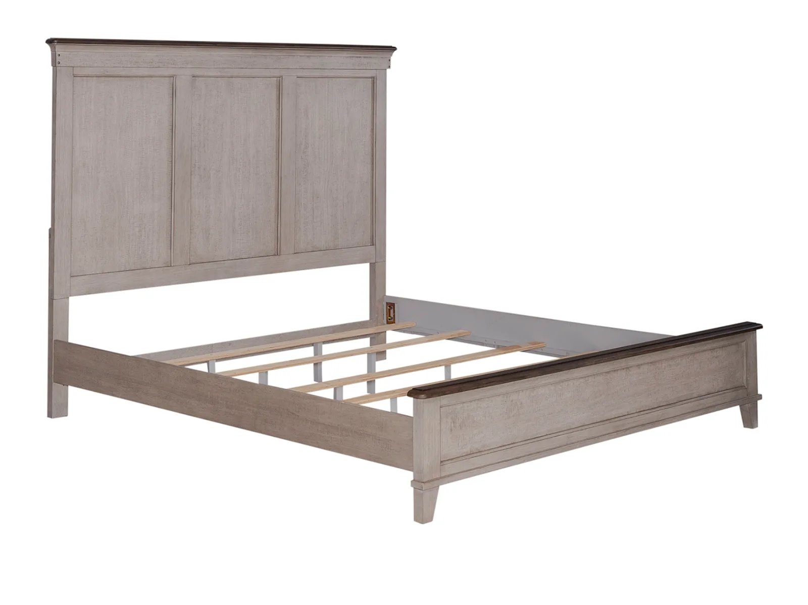 Bringing together a clean-lined silhouette and a timeless two toned palette, the Tipton Panel Bed delivers charming farmhouse style that’s perfect for today’s casual interiors. This inviting bed is made from poplar solids and pine alder veneers in a heavily-distressed “Weathered Linen” finish, and its paneled headboard showcases framed molding accents for a touch of sophistication. Both the head and footboard feature top rails in a “Dusty Taupe” finish, and it rests atop tapered block feet to complete the look.