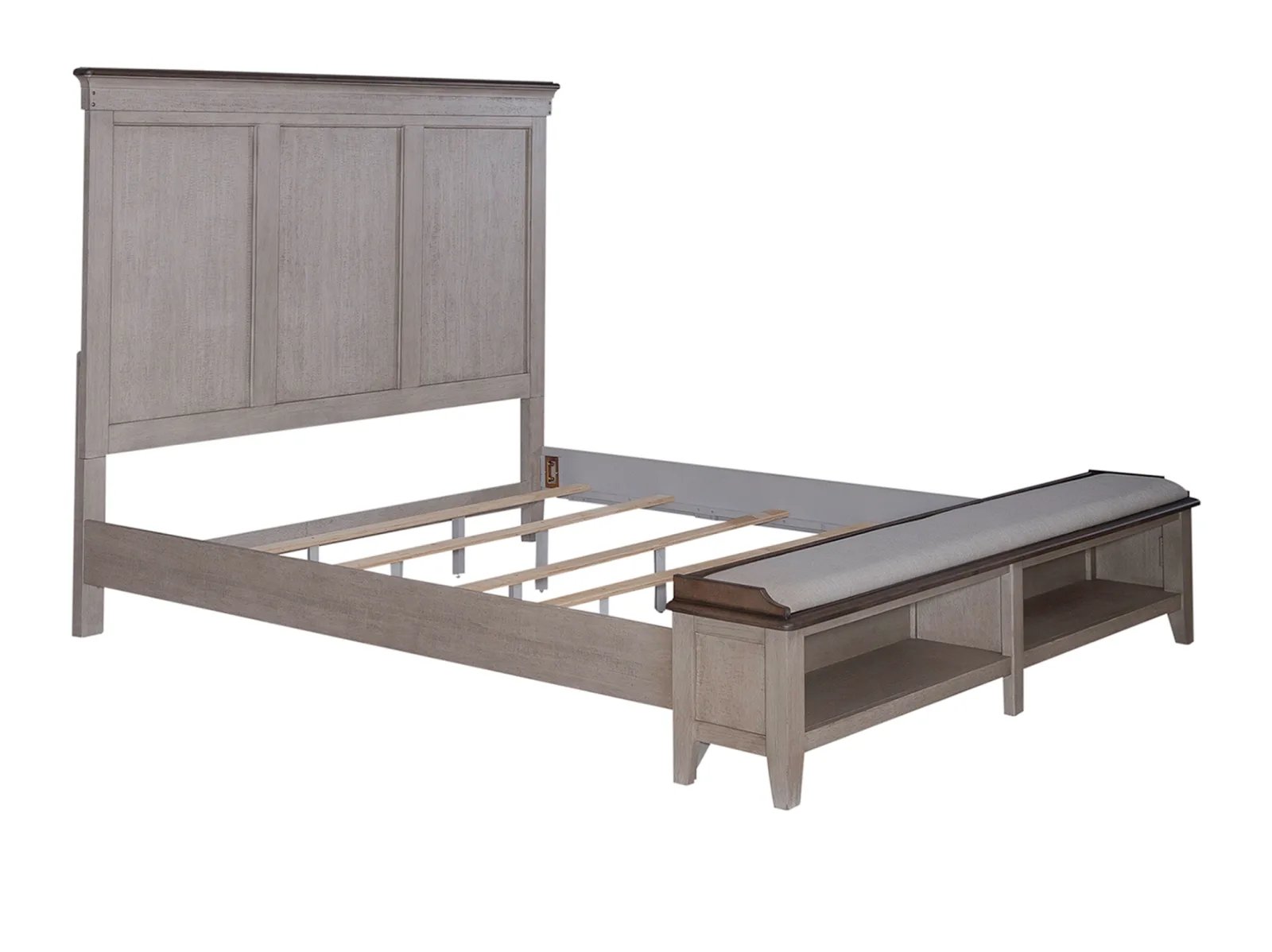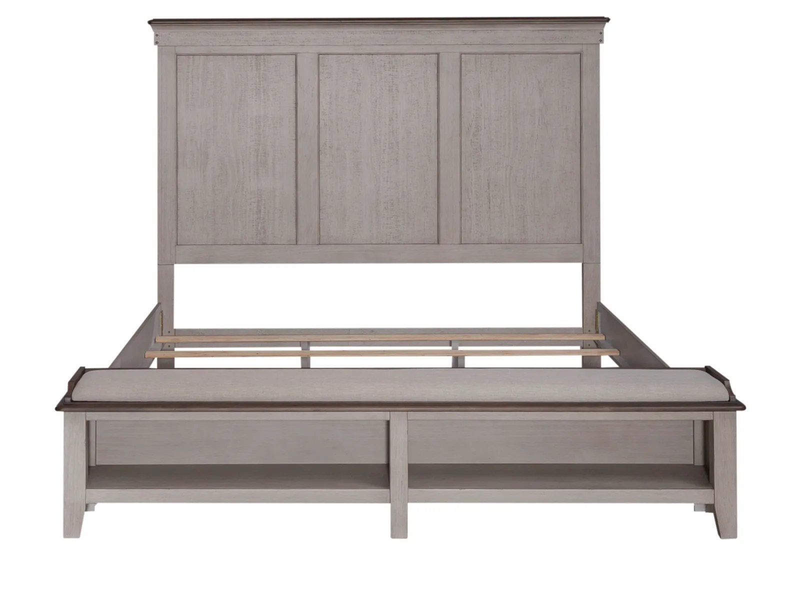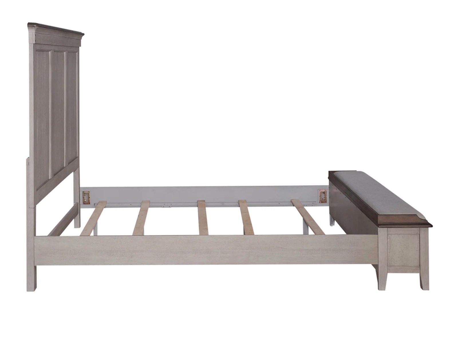 This inviting bed is made from poplar solids and pine alder veneers in a heavily-distressed “Weathered Linen” finish, and its paneled headboard showcases framed molding accents for a touch of sophistication. The Tipton features a convenient upholstered storage bench footboard that’s perfect for getting dressed in the morning and organizing bedroom belongings, and both the head and footboard feature top rails in a “Dusty Taupe” finish to complete the look.