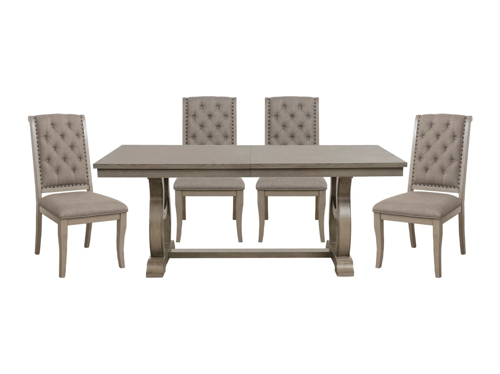 Designed for the modern traditional home, the Toulon Collection is a light and airy take on the themes of classic style and refined elegance. Enhancing the distinct grain of oak veneer is a subtle bisque finish. Neutral–tone button–tufted fabric covers the host and side chairs of the collection, each adorned with nailhead accent and coordinating wood legs. The trestle base of the table provides solid support and unique decorative touch. Storage space comes in the form of the accompanying server that features elegant framing over the antiqued mirror doors.