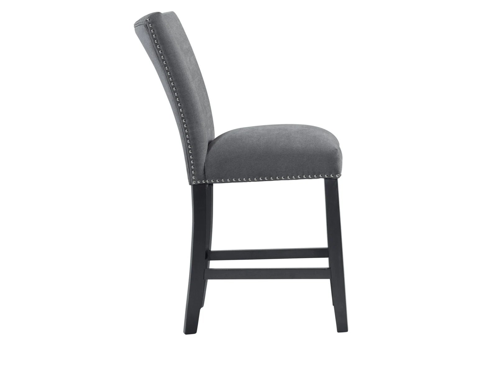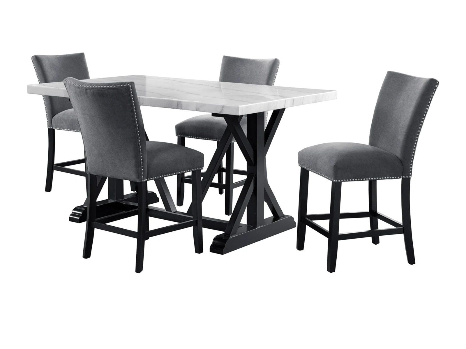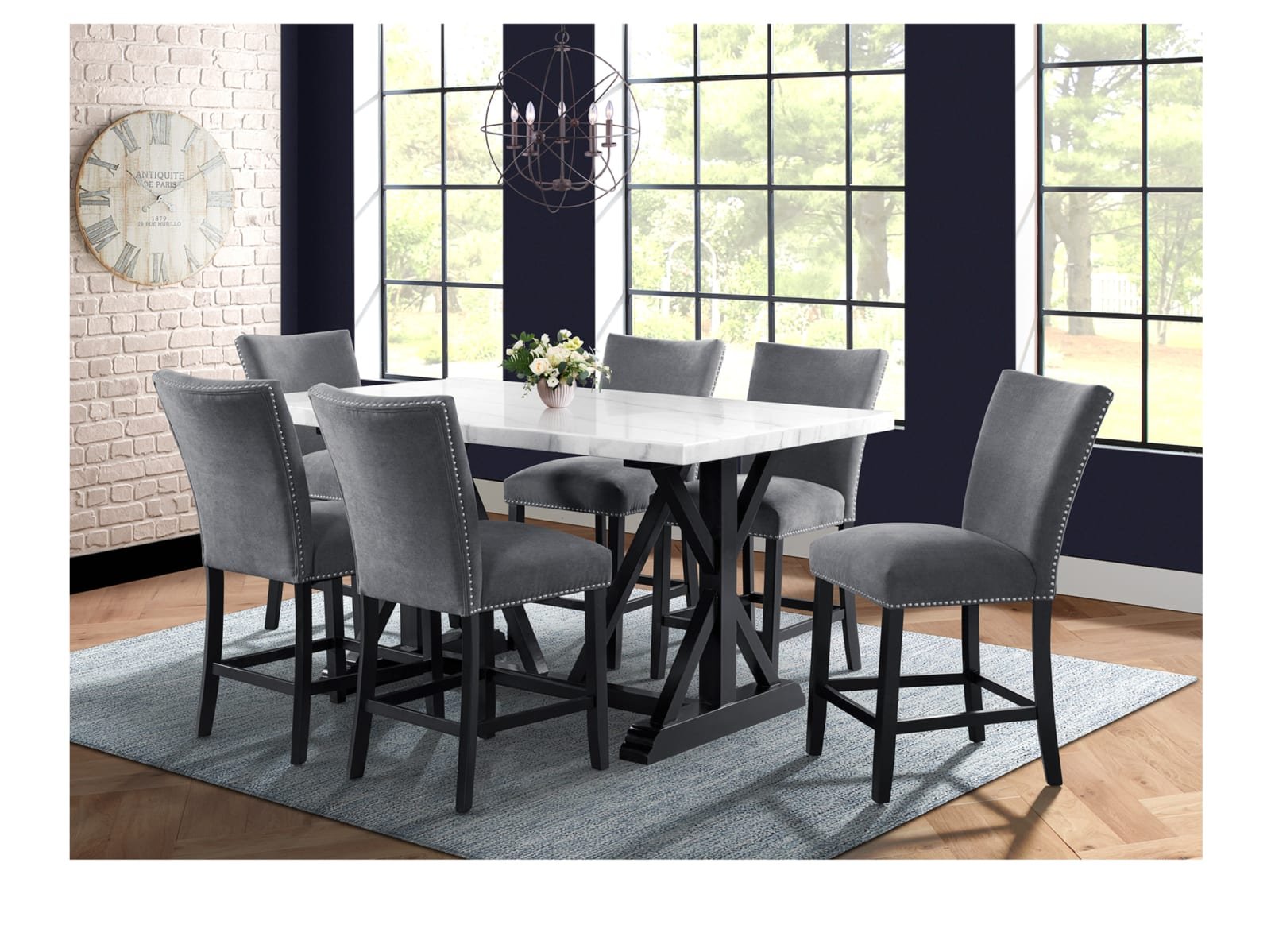 The Traverse 5 Pc. Counter Height Dining Set is going to look gorgeous in your home! This set includes a table and four barstools. This rectangular table features a white, natural marble table top, adding instant style to your dining room. The brown trestle base also has its own flair to offer, that beautifully complements the table top. The barstools, are upholstered in a transitional, charcoal fabric. Chrome nail head trim outlines the edges of the chairs, instantly adding extra flair to these already stylish chairs. The foam cushion seat and back will keep you plenty comfy through even the longest of dinners. Enjoy every meal at the table and add the Traverse Dining Set to your home today!