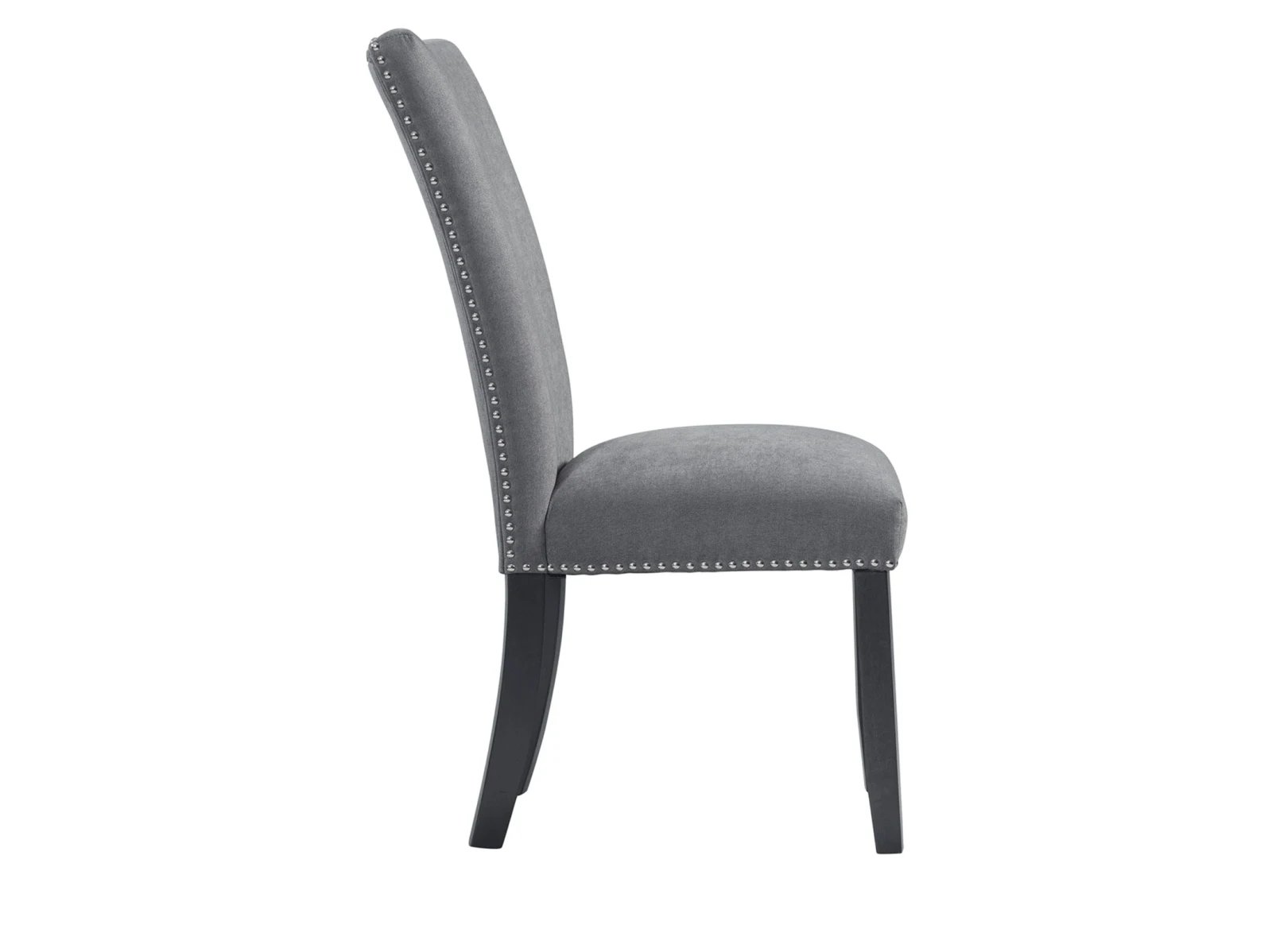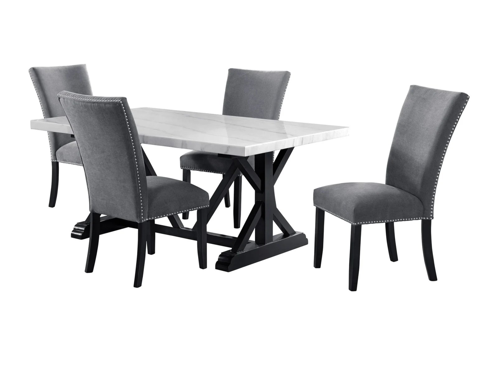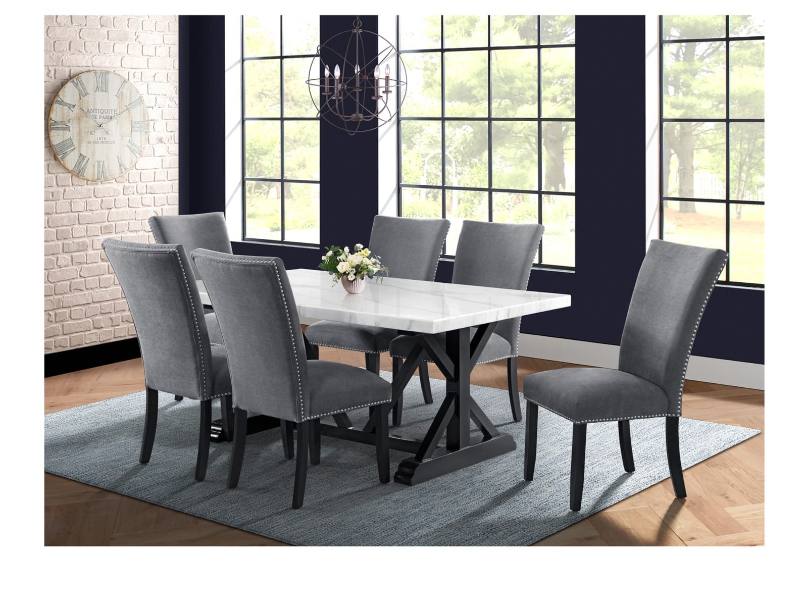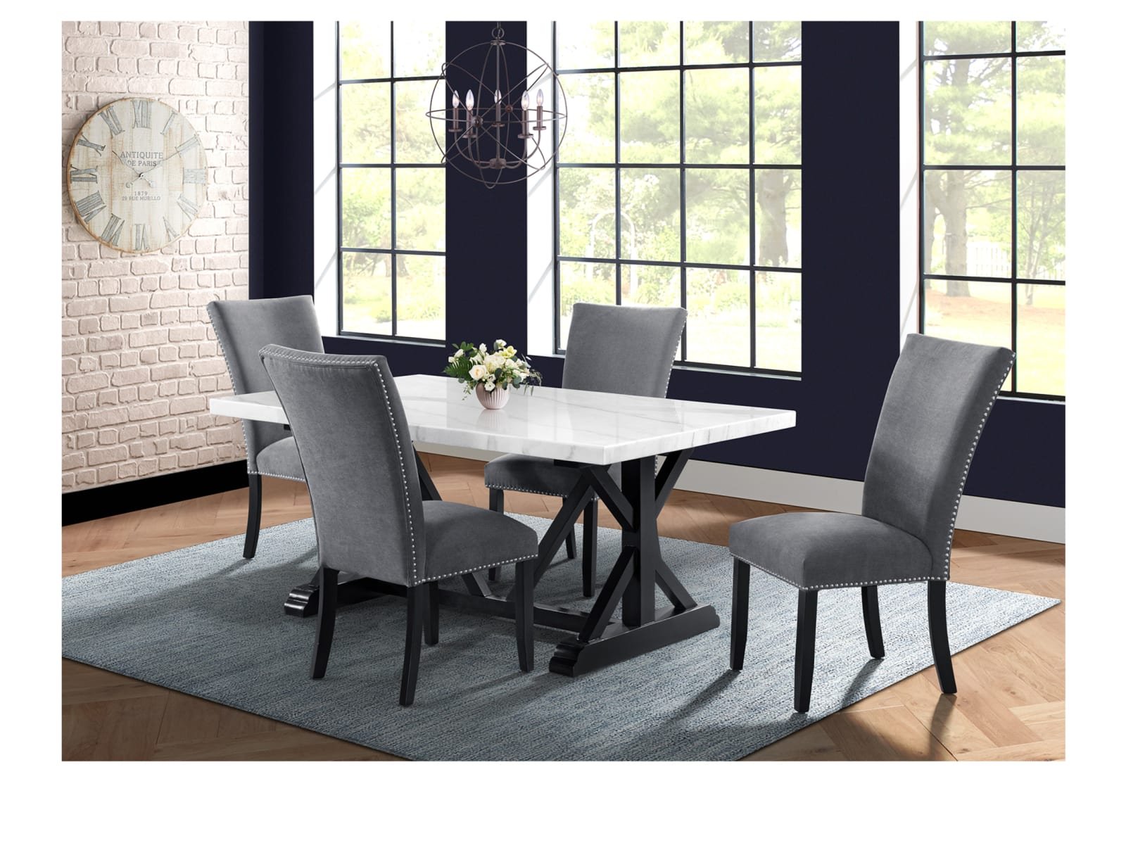 The Traverse 5 Pc. Dining Set is going to look gorgeous in your home! This set includes a table and four side chairs. This rectangular table features a white, natural marble table top, adding instant style to your dining room. The brown trestle base also has its own flair to offer, that beautifully complements the table top. The standard height side chairs, are upholstered in a transitional, charcoal fabric. Chrome nail head trim outlines the edges of the chairs, instantly adding extra flair to these already stylish chairs. The foam cushion seat and back will keep you plenty comfy through even the longest of dinners. Enjoy every meal at the table and add the Traverse Dining Set to your home today!