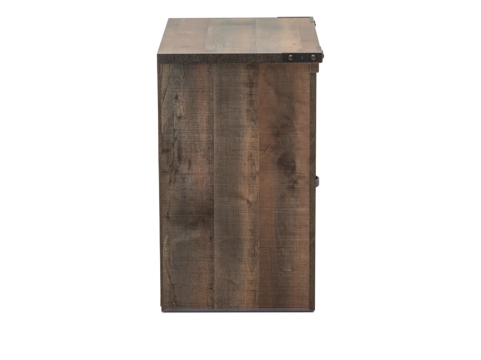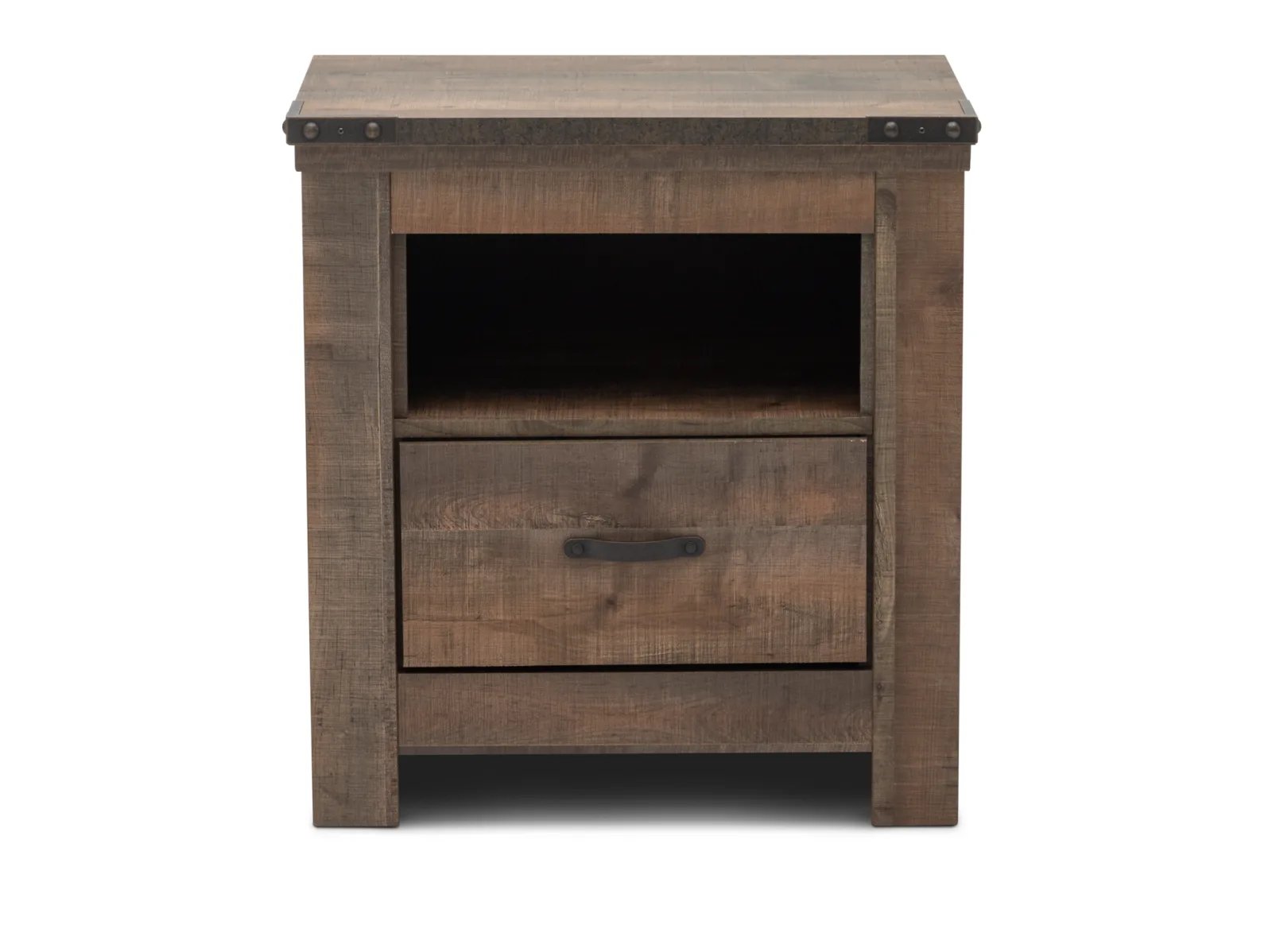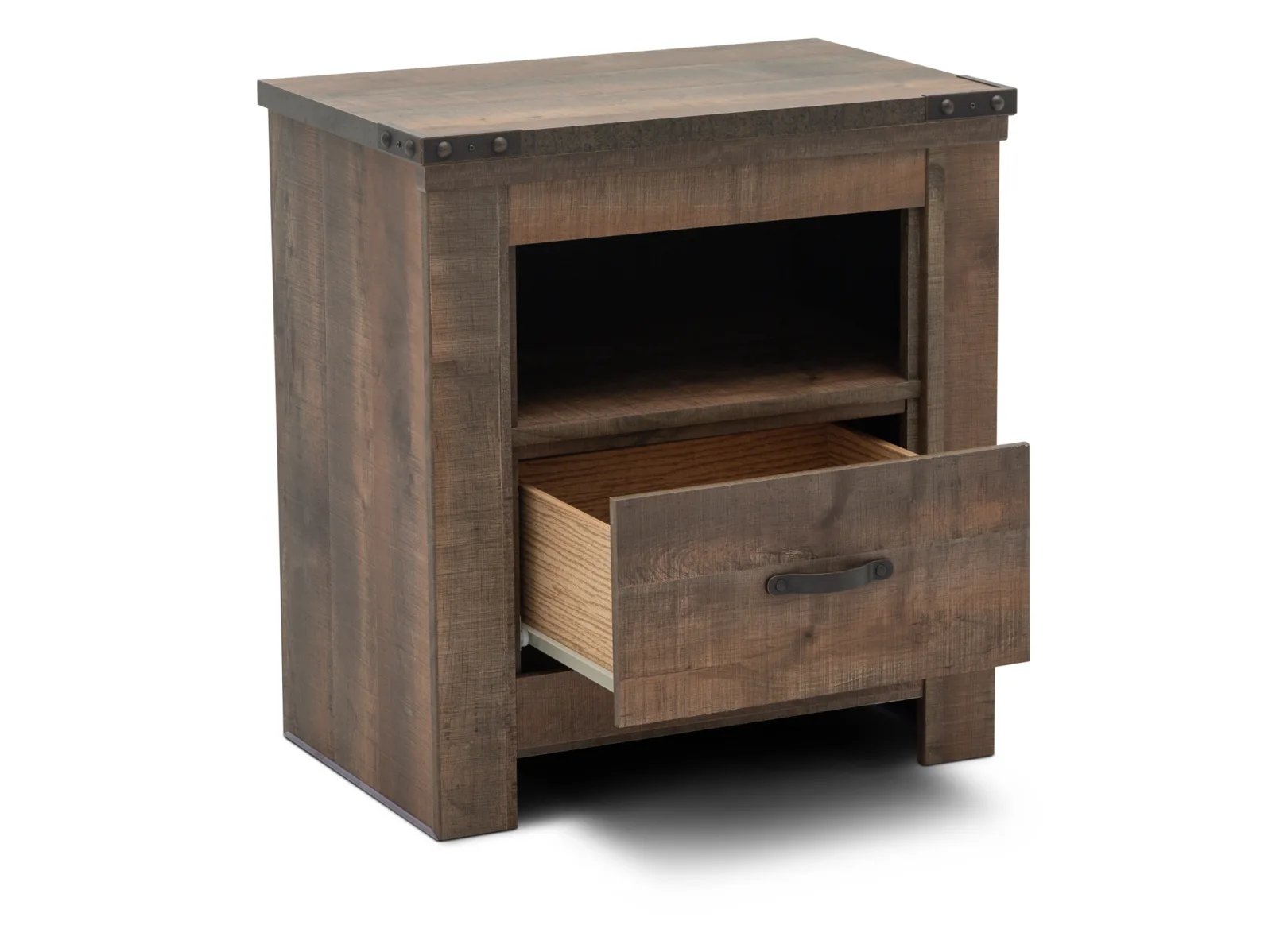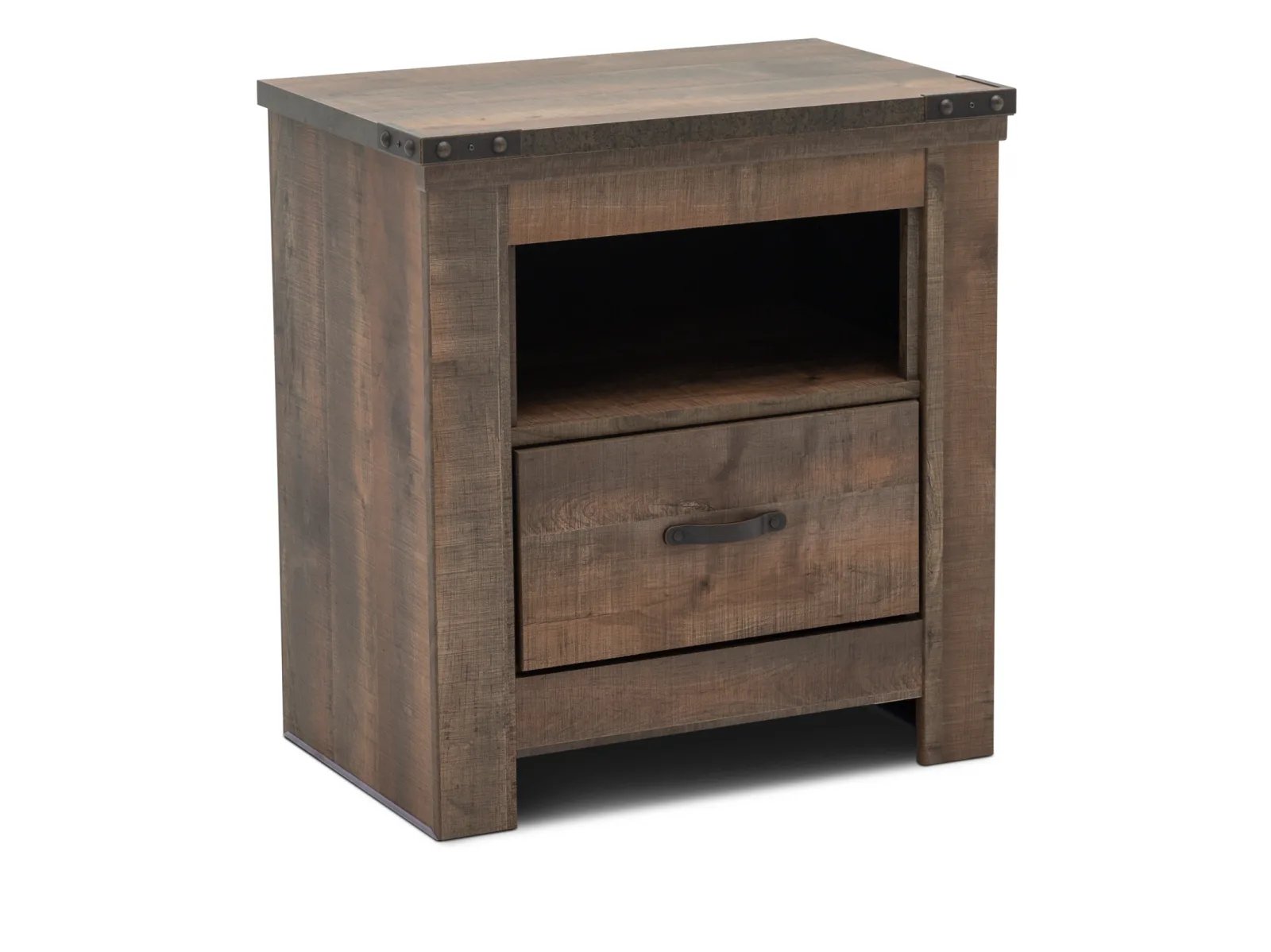 The Trinell Nightstand has a modern design hidden beneath a reclaimed, country aesthetic. The Trinell is crafted from durable engineered wood that will last through childhood, and it achieves its rustic look via a laminate finish which replicates the look, feel, and color of weathered oak. To perfect its country style, the Trinell showcases banded metal accents along its top, and it boasts a uniquely simple shelf space above its bottom drawer. To keep up with the times, the Trinell features a hidden USB charging port to keep those beloved devices charged. Your child will go to sleep dreaming of campfires and cattle drives with the Trinell Nightstand.