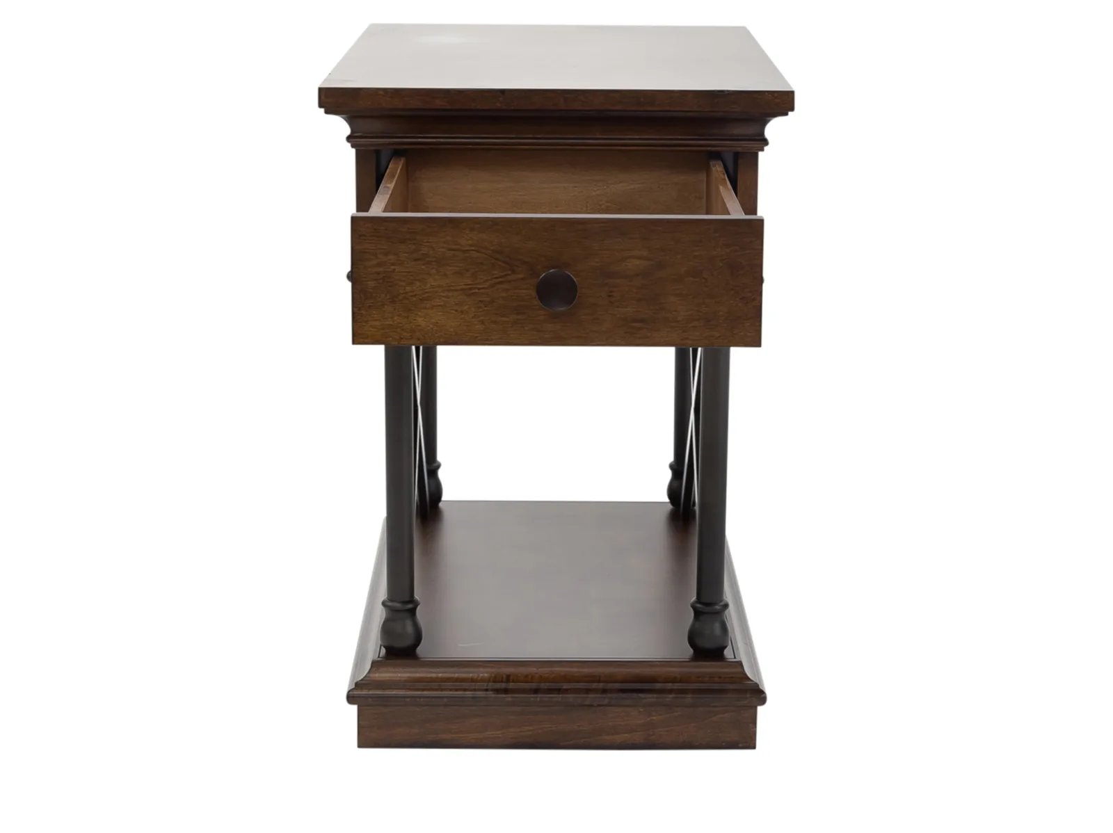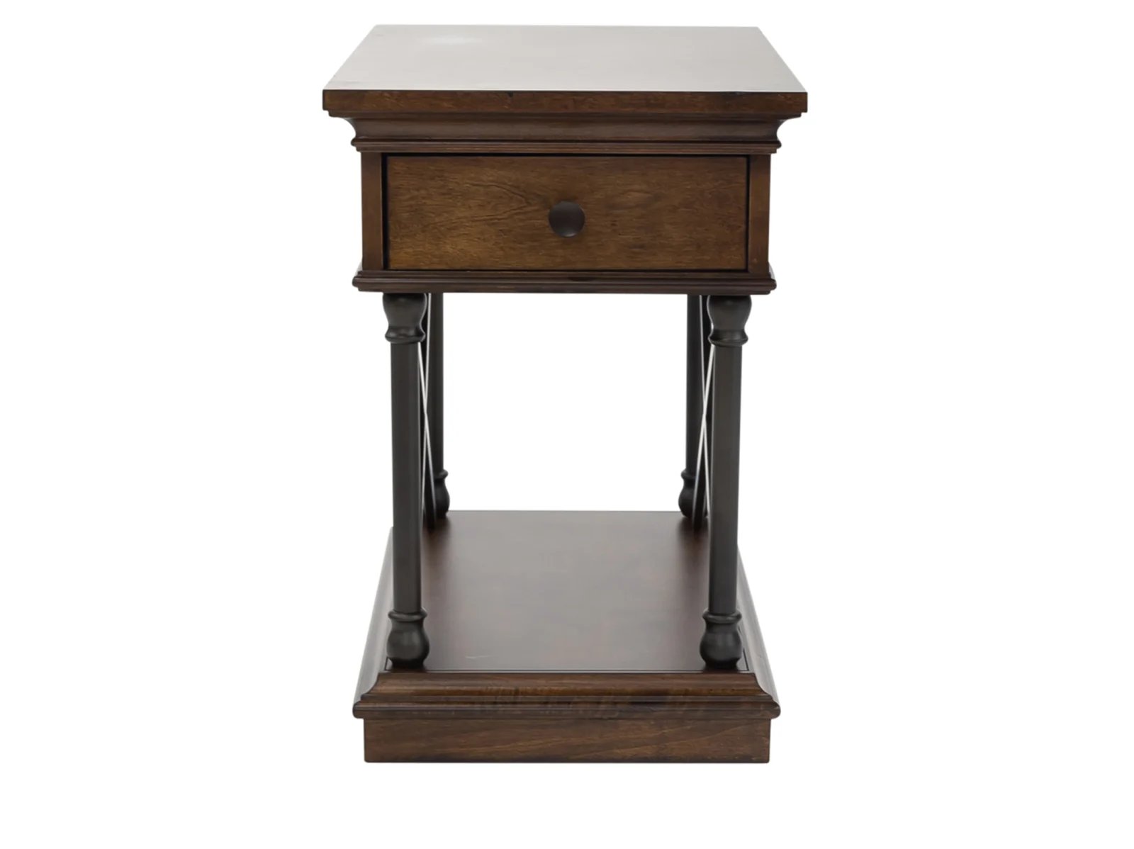 & Free ShippingAccent your space with the classic Trinidad drawer chair side table. Crafted of poplar solids and birch veneers, this piece features a cordovan brown finish, one fully stained full extension drawer, a bottom shelf for storage, X metal accents on the sides, walnut inlay, antique bronze knob hardware, anchored by turned legs with ring accents. A great addition to any traditional style space.