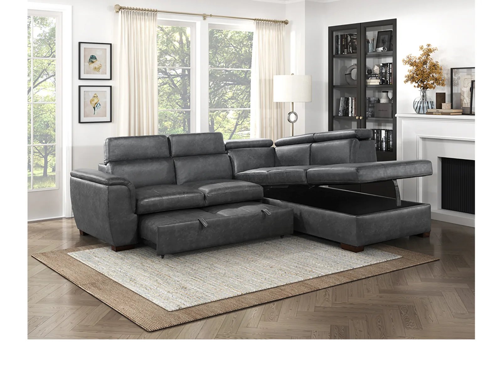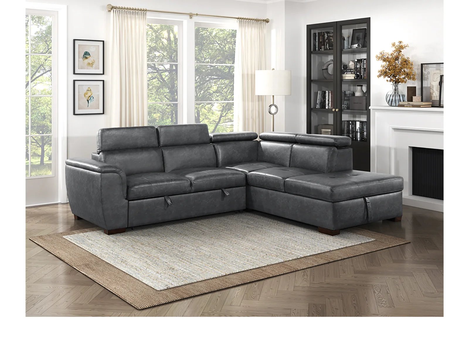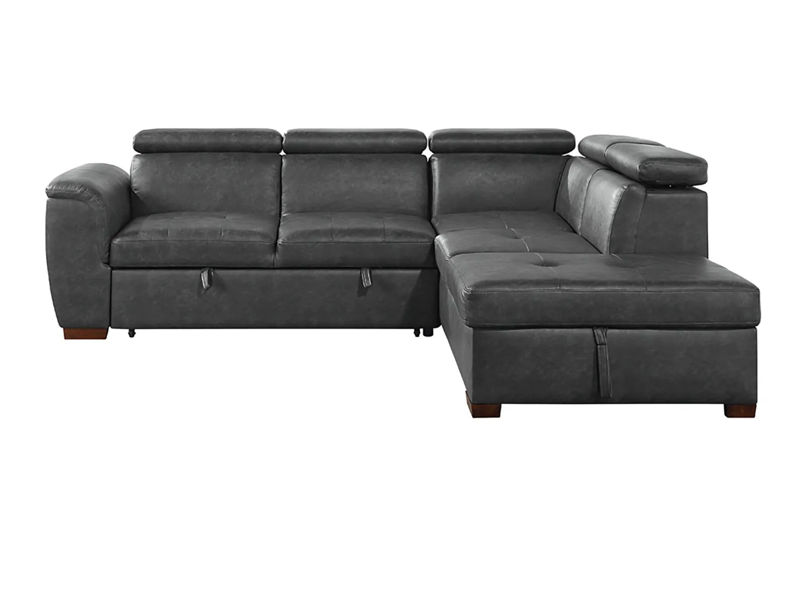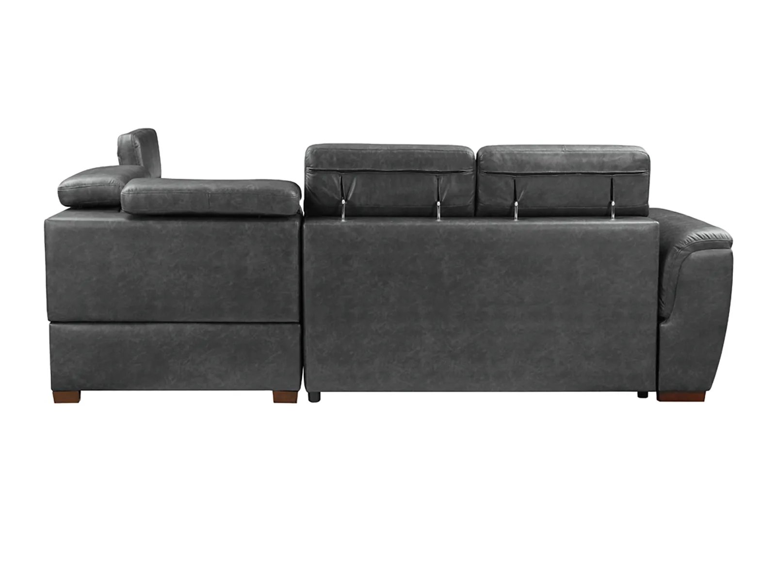 Functional beyond traditional seating arrangements, the Truxton Collection provides seating, sleep space, and storage, all welcome additions to your home. The right-side open-ended chaise provides hidden storage for your blankets and pillows, while the left-side seating unit features a pull-out bed that allows for additional sleep space within your casual living, and the adjustable headrests further your comfort. Complementing your home’s modern décor is the gray breathable faux leather upholstery that covers the sectional.