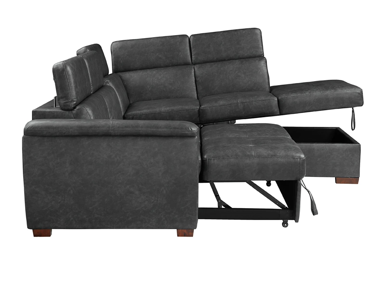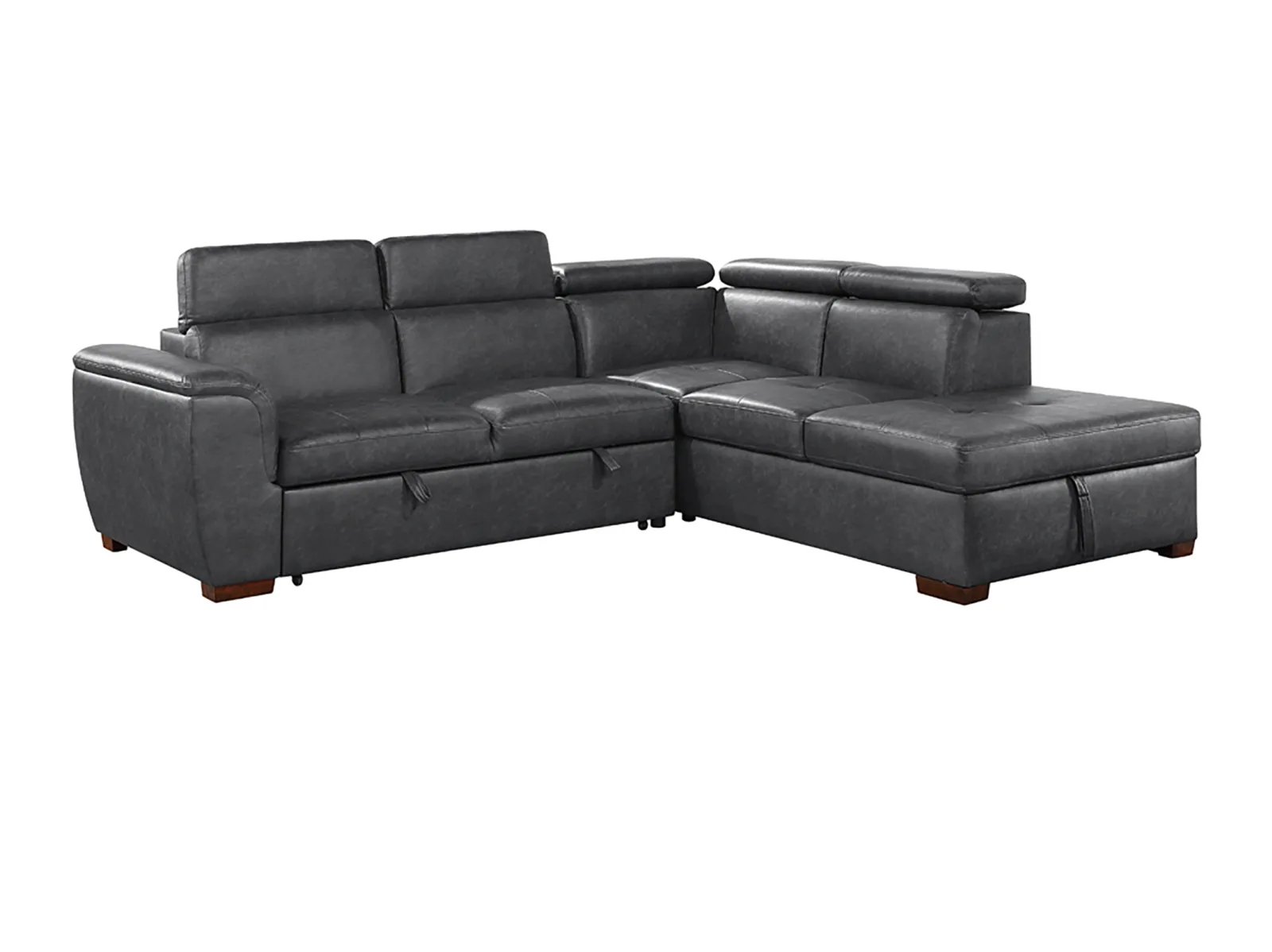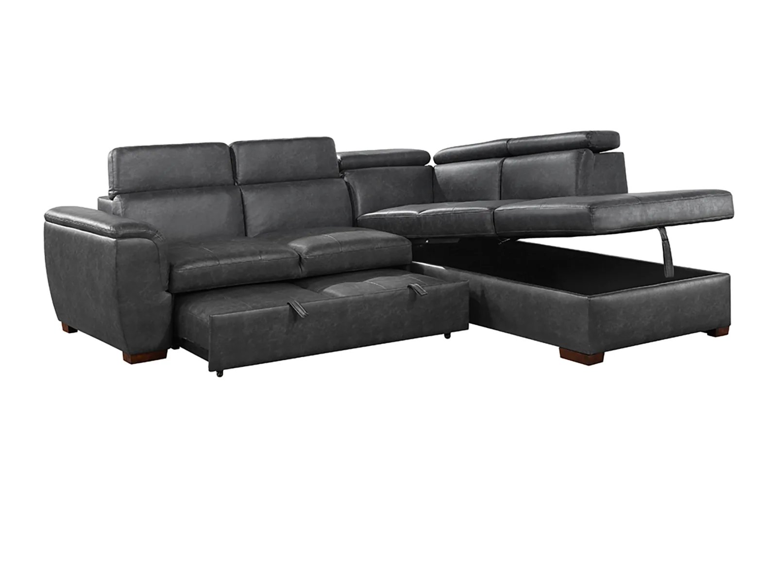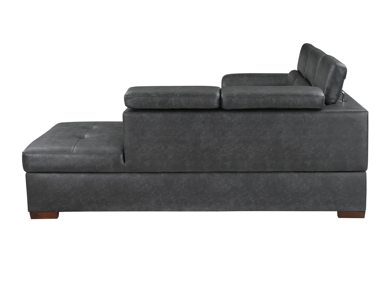 Functional beyond traditional seating arrangements, the Truxton Collection provides seating, sleep space, and storage, all welcome additions to your home. The right-side open-ended chaise provides hidden storage for your blankets and pillows, while the left-side seating unit features a pull-out bed that allows for additional sleep space within your casual living, and the adjustable headrests further your comfort. Complementing your home’s modern décor is the gray breathable faux leather upholstery that covers the sectional.