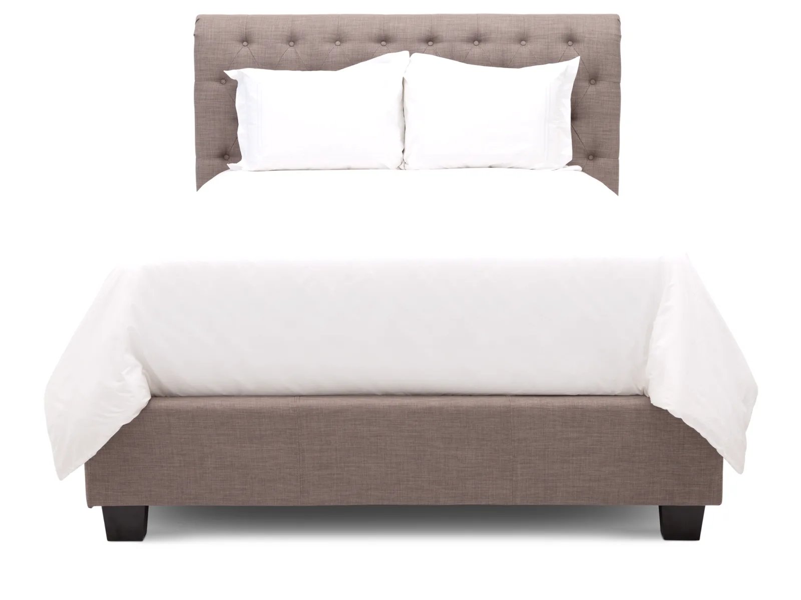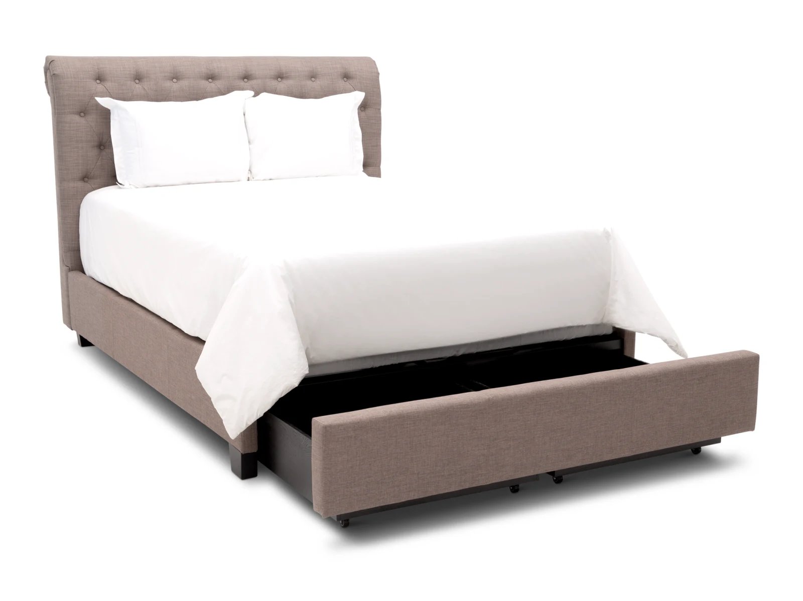 Indulgent, soft, taupe linen surrounds you in warmth with the Tulare Upholstered Bed. This fully upholstered bed is wrapped from top to bottom for a tailored look that will match any bedroom style. With a sturdy MDF frame, the Tulare boasts a button-tufted headboard, royal sleigh design, and optional drawer storage in the footboard. It’s even designed for use without a box spring and features a Euro-style bentwood mattress support system. Add this cozy, sophisticated bed today. The Tulare is available in full, queen, king and cal king sizes.