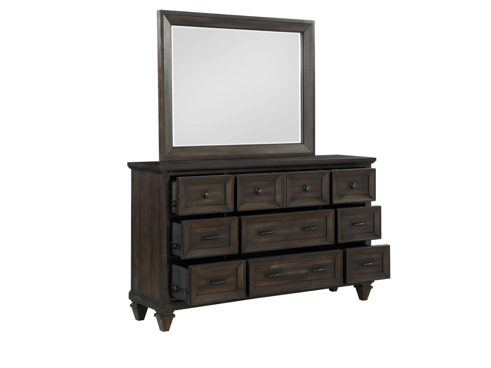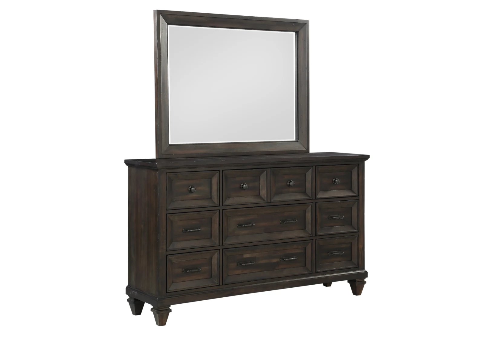 The Tustin Dresser Mirror in brown is a perfect blend of timeless craftsmanship and versatile design, making it an elegant addition to any bedroom. Skillfully crafted from solid Acacia wood and Acacia veneers, this mirror features a rich walnut finish that has been meticulously hand-distressed, giving it a warm, vintage appeal. The mirror’s frame, designed with extra-wide picture frame moldings, beautifully encases crystal-clear, low-distortion beveled glass, providing a flawless reflection and impeccable functionality. Its robust construction and substantial presence command attention, while the rich wood tones enhance a cozy, inviting ambiance. Ideal for classic, rustic, or historically inspired spaces, this mirror is designed to complement the matching dresser, serving as a captivating focal point in any room.