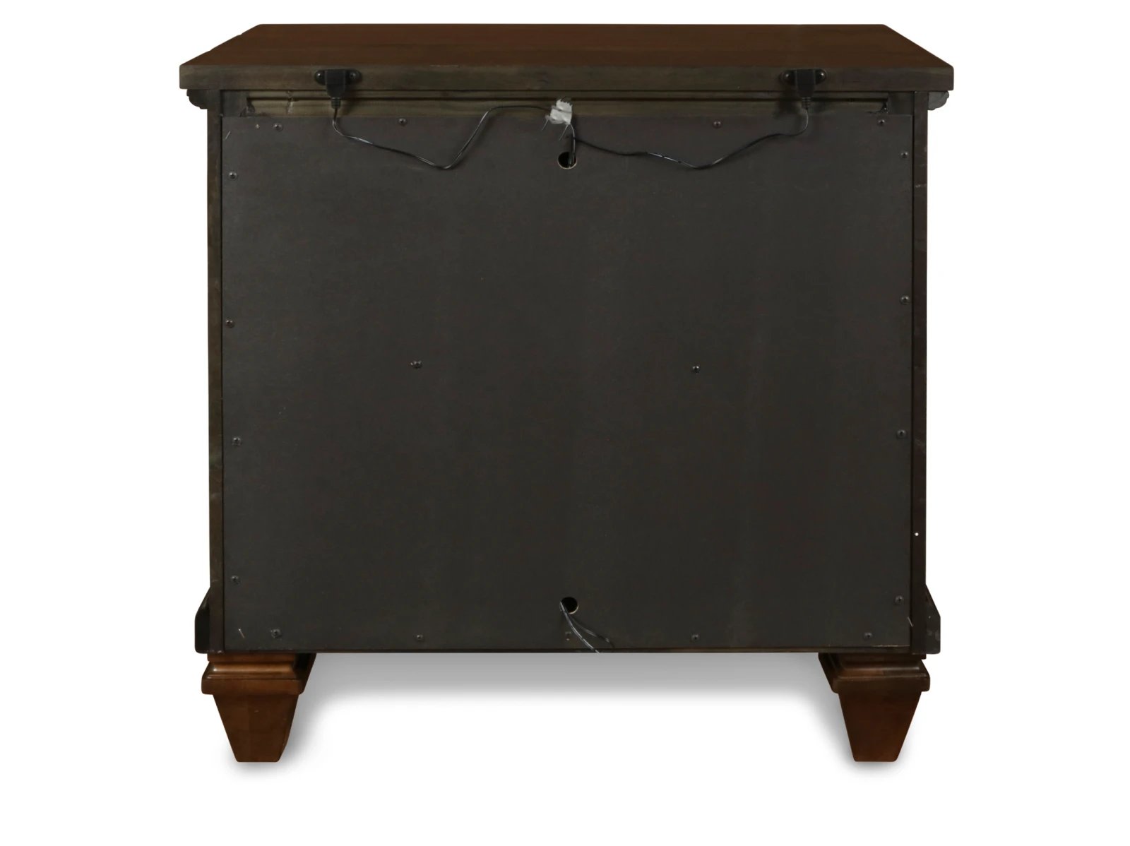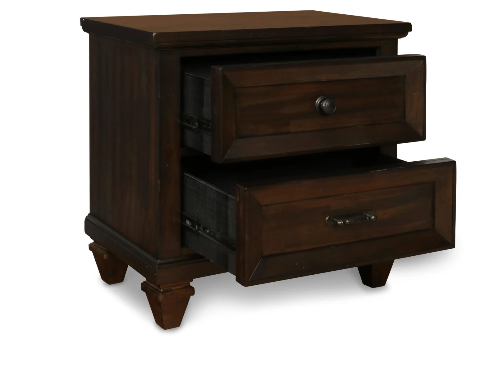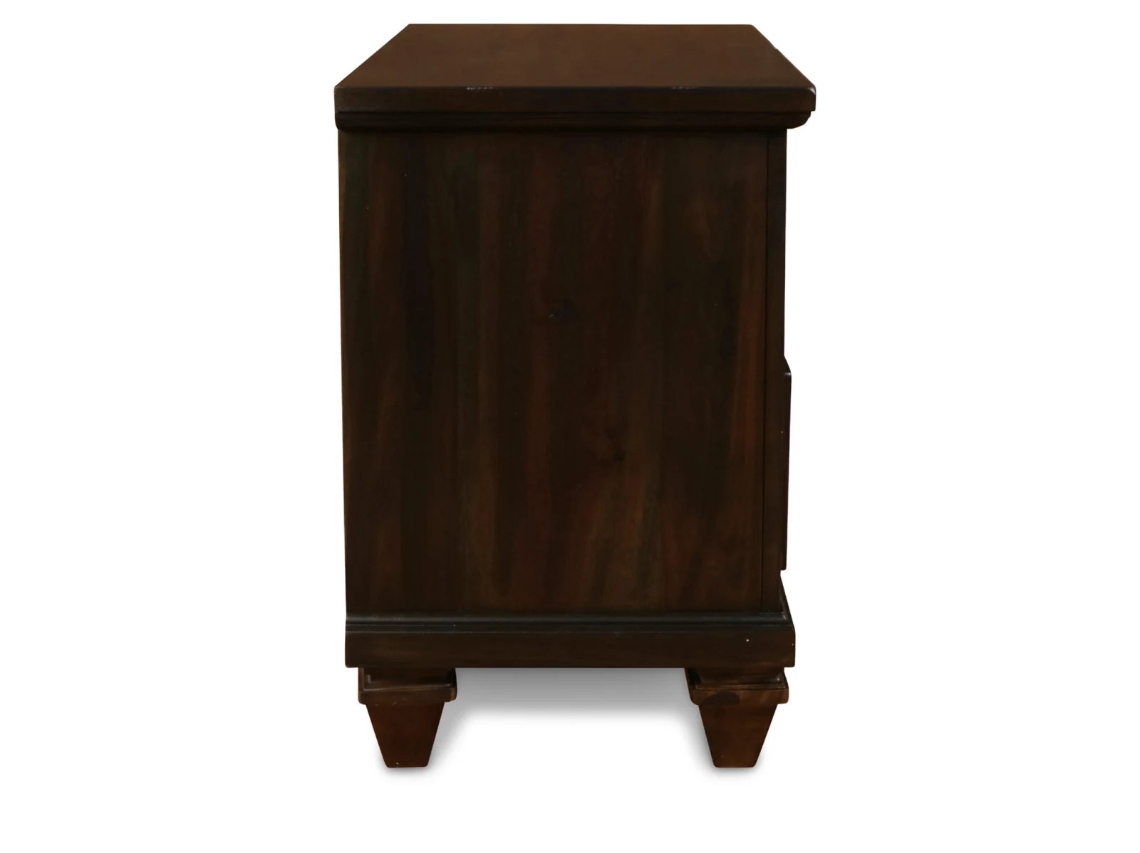 & Free ShippingThe Tustin 2-Drawer Nightstand in walnut is a perfect blend of timeless craftsmanship and functional elegance, making it an ideal addition to any bedroom. Crafted from solid Acacia wood and enhanced with Acacia veneers, this nightstand features a rich, hand-distressed walnut finish that exudes a vintage charm. Its design artfully combines traditional elegance, rustic charm, and colonial craftsmanship, creating a warm and inviting ambiance while commanding attention with its sturdy construction. The spacious drawers, crafted with masterful dovetail joinery and lined with luxurious velvet in the top drawer, offer smooth, snag-free storage, gliding effortlessly on precision-engineered, full-extension drawer glides. A discreet USB charging connection on the back adds a modern convenience, ensuring your devices are always powered and within easy reach. Perfectly balancing style and durability, this nightstand serves as a captivating focal point in any classic, cozy, or historically inspired space.
