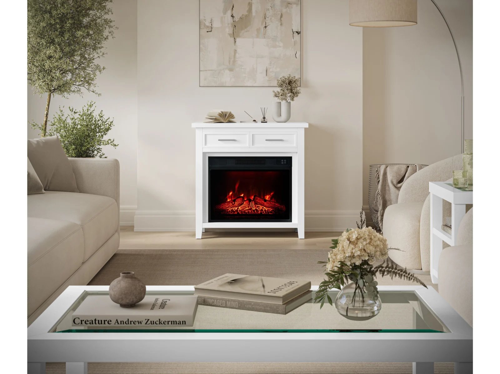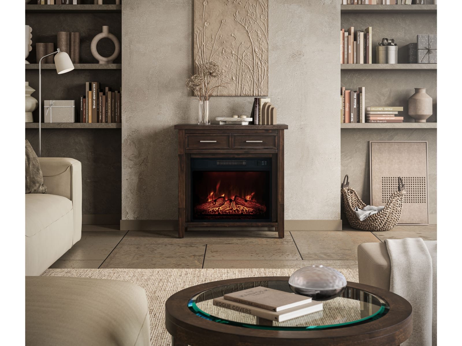 & Free ShippingThe Upland 32″ Electric Fireplace Console TV Stand offers sleek design and modern convenience in a compact form. Crafted from Acacia and engineered wood, it’s available in three stylish finishes to match any interior. The built-in storage drawer features solid metal bar-style hardware, combining function and style while providing space to organize media accessories or other essentials. At its core is a 1500W LED fireplace insert, producing up to 5000 BTUs of heat, perfect for warming up your space. For year-round use, the fireplace can also operate without heat, allowing you to enjoy its cozy ambiance anytime. Built-in cable management holes on the back keep cords organized, making this console ideal for use as a TV stand or for housing electronics. With its blend of contemporary design and practical features, the Upland Fireplace TV Stand adds warmth, style, and functionality to any living room or media space, offering both a modern aesthetic and the comfort of a reliable heating solution.
