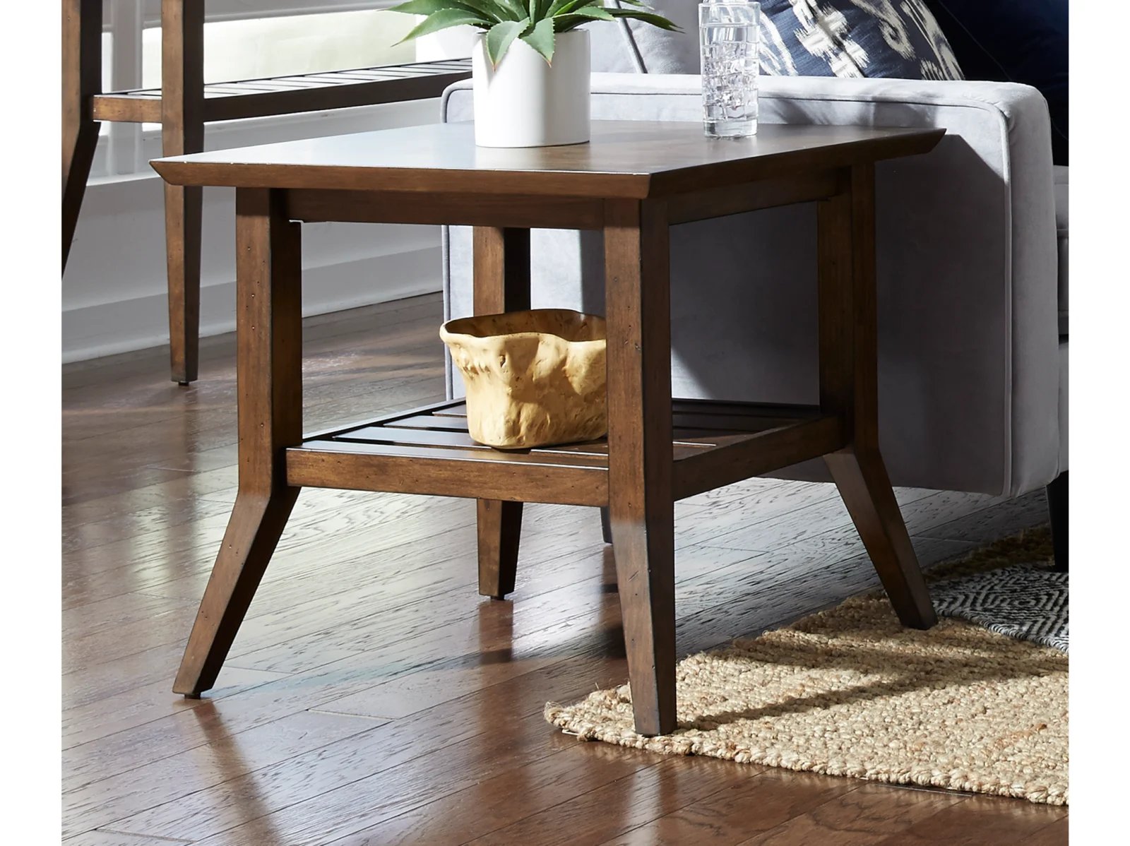 & Free ShippingAccent your space with the Valdosta End Table. Crafted of rubberwood solids and cathedral walnut veneers, this piece features a bronze spice finish, a slat bottom shelf for additional storage, and anchored by tapered splayed legs. This contemporary end table would be a wonderful addition to any space.