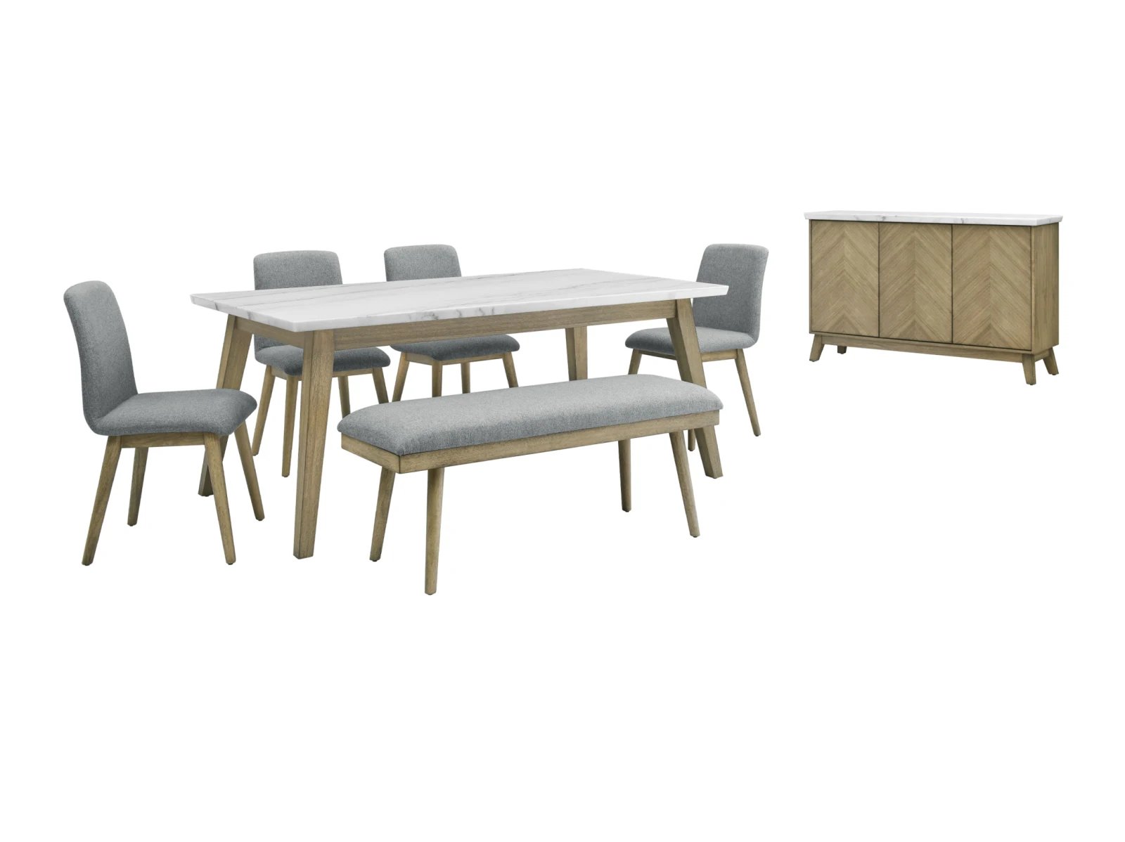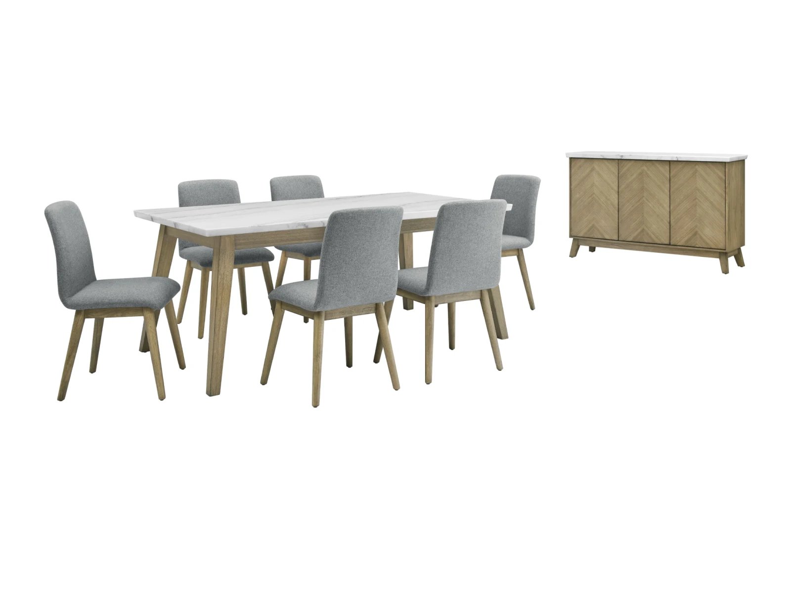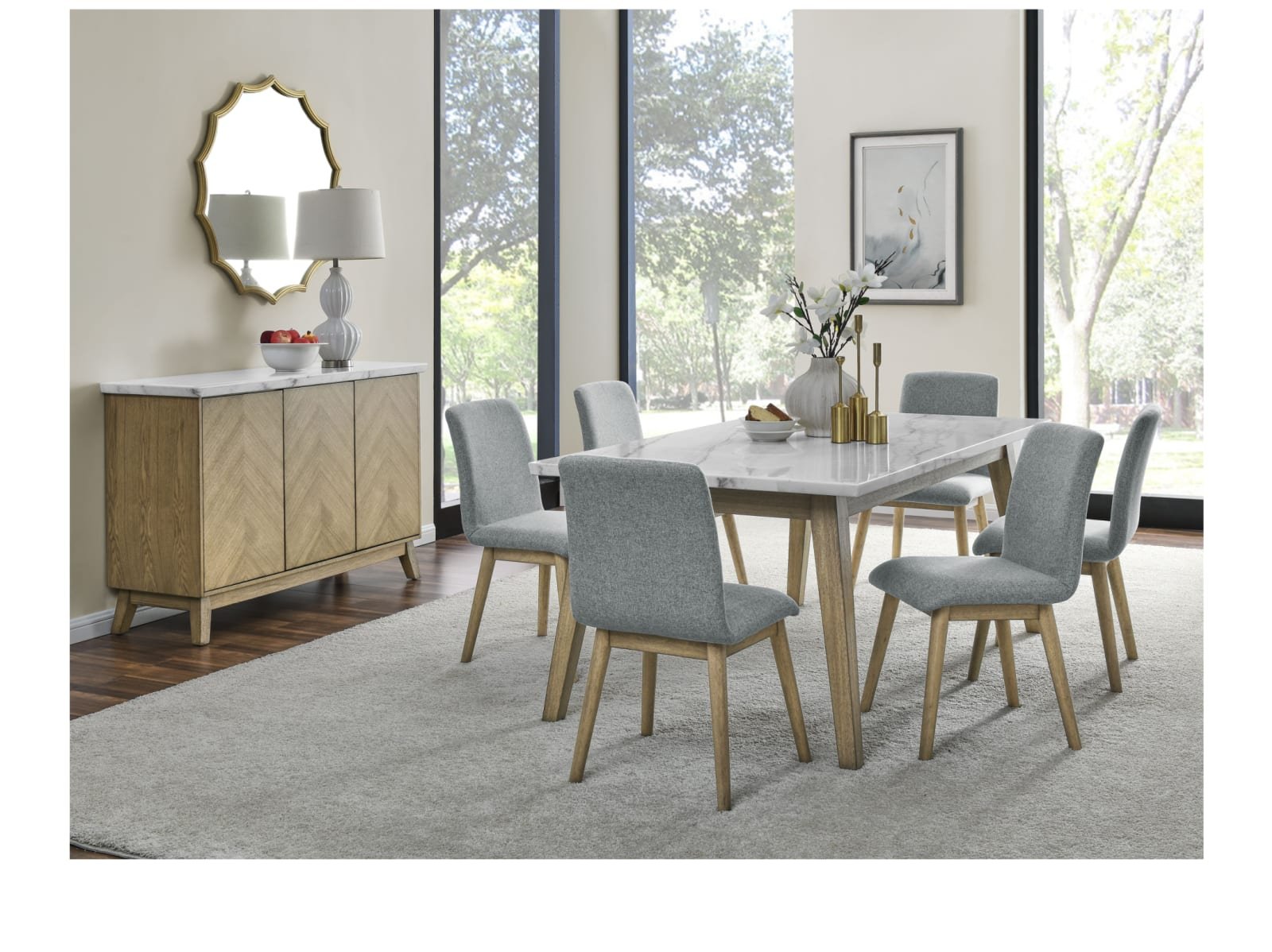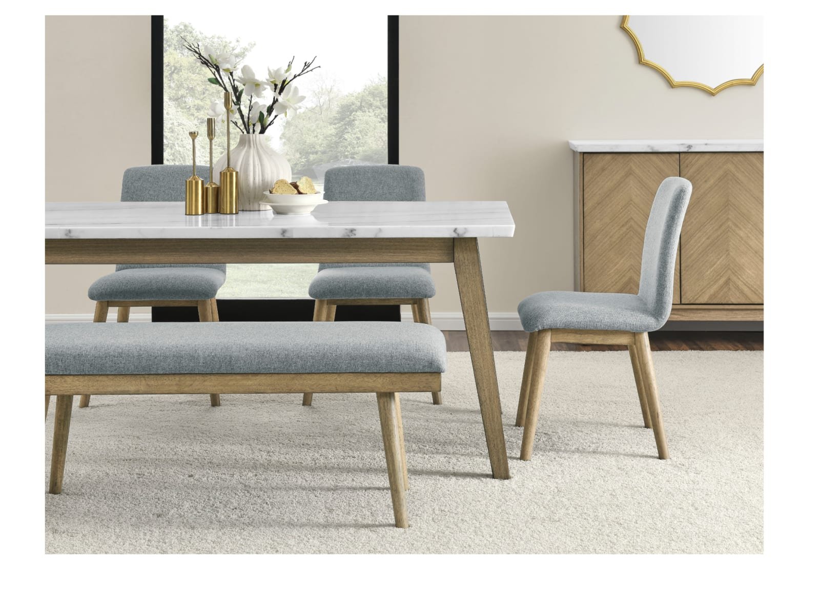 Discover the minimalism, functionality and beauty of mid-century modern design with the Valentine 72-inch marble top dining table. Crafted with utmost care and precision, the Valentine Dining Table presents a stunning marble top with a knife-edge finish that adds an extra layer of refinement to its design. The tabletop sits elegantly on burnished blonde solid hardwood legs that have been meticulously carved into canted legs in a versatile design that seats up to six people. The warm tones of the acacia legs and the coolness of the marble top create an understated and sophisticated look that’s bound to impress.