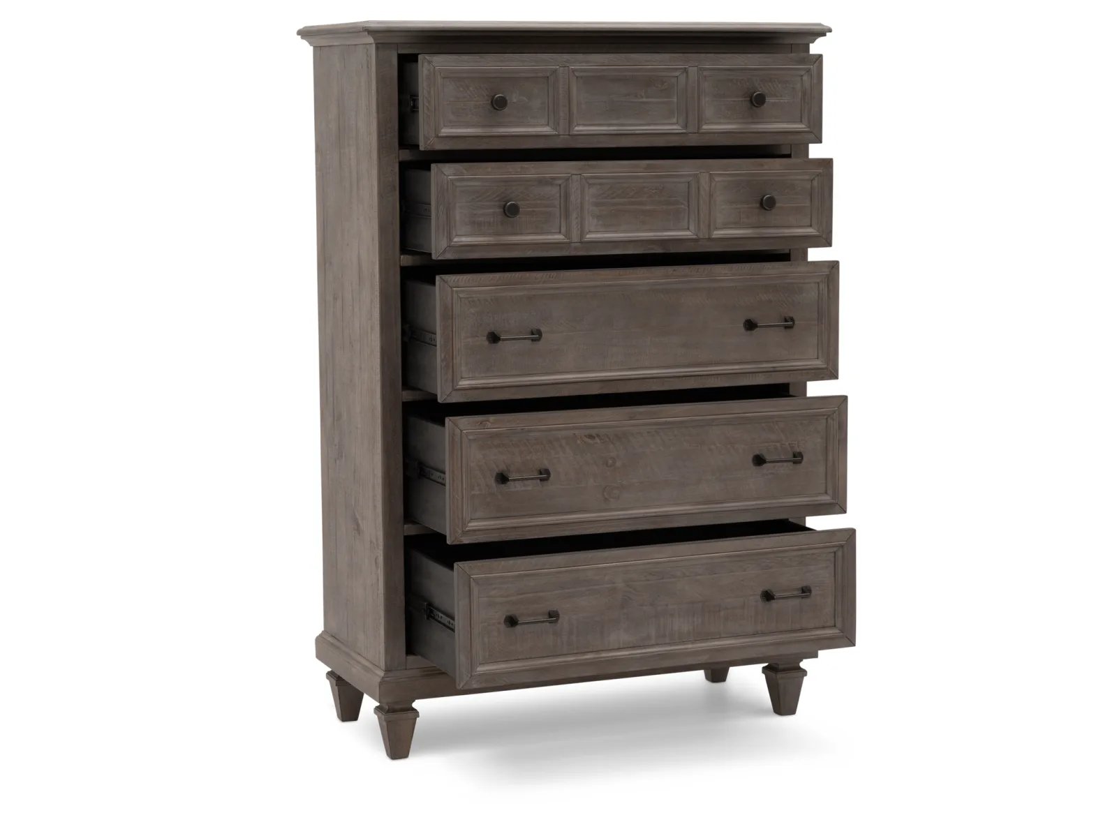 Refined design meets casual and rustic appeal with the Warwick Chest. Pine solids are crafted into a handsome, transitional-style silhouette and are supported by raised turned feet. An updated dovetail gray finish is accented by weathered bronze drawer pulls. This furnishing even has a felt-lined top drawer, an overhung top, bead frame dovetailed drawers, and a shaped base. Crisp and updated, the Warwick promises long-lasting design and sturdy construction for a relaxed bedroom setting.