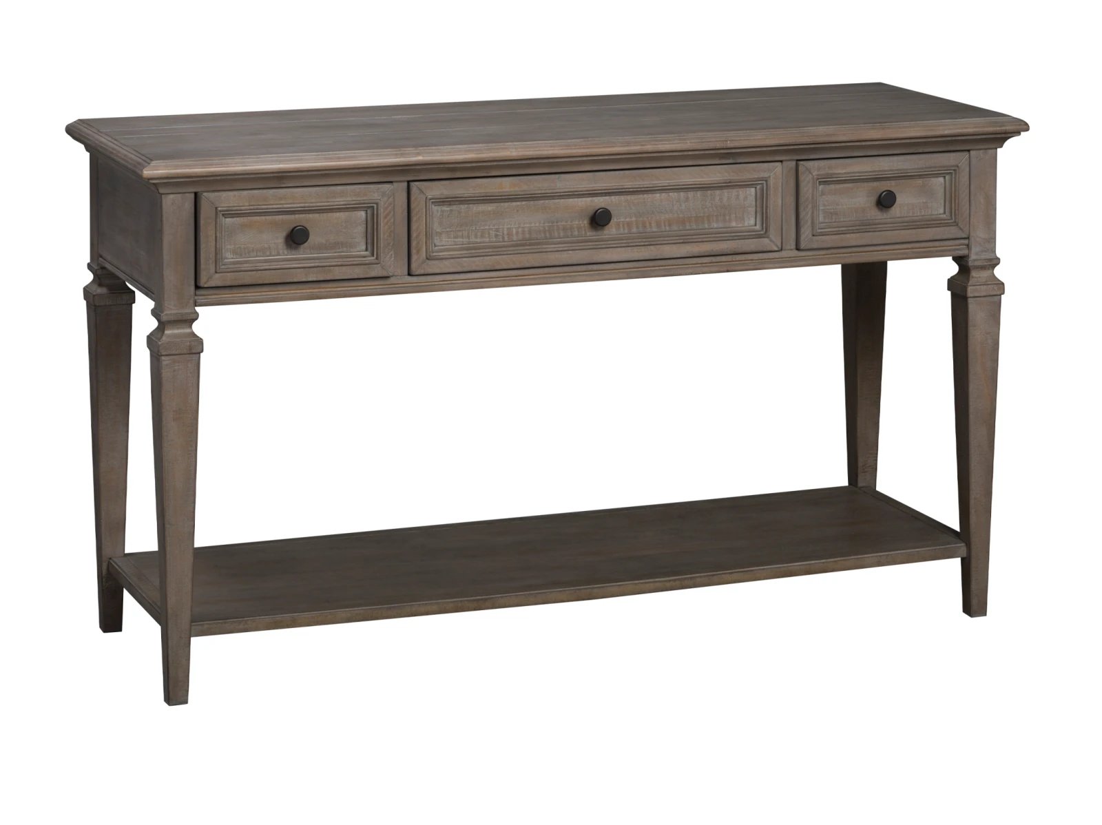 Achieve the perfect blend of casual and rustic appeal with the Warwick Sofa Table. Composed of pine veneers, the Warwick includes three tinted drawers with English dovetail joints as well as an additional shelf for storage. To curate its refined appeal, this sofa table displays a gorgeous gray multi-step finish that highlights the wood’s character. It all comes together with weathered bronze hardware and floor protectors for a long-lasting design that complements any relaxed setting. Make the Warwick Sofa Table your next statement piece!