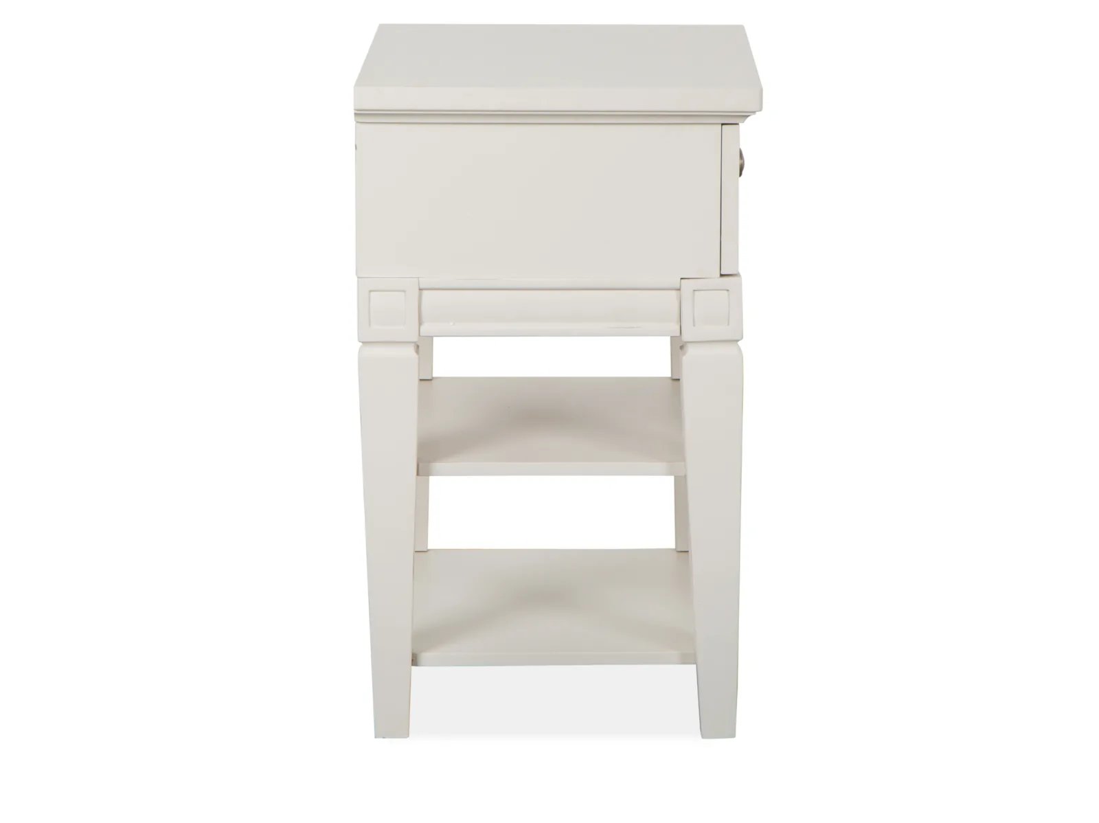 Charming and chic, Watley combines a soft and casual Egg Shell White finish with classic forms to create a soothing atmosphere that relaxes mind and body. Create a serene setting with vintage silhouettes featuring breakfront shaping on the dresser, panel bed headboard and mirror, and tarnished silver hardware including a decorated knob and elegant bail pull. Crafted of Birch Veneer and Hardwood Solids with a subtle gray wash over the creamy finish, Watley is at home in settings from cottage to coastal and from traditional to soft modern. The stunning panel bed has a storage footboard option with two drawers and a wood-framed upholstered headboard. Three nightstand options are offered including a two-drawer nightstand, one-drawer nightstand with two shelves, and a door bachelor’s chest. The functional door chest has a sliding wood door with wood shelves behind, five left drawers with felt-lined top drawers and one bottom drawer. From beaches to the countryside, and from mountain valleys to suburban trails, Watley is a relaxing destination for the end of each day’s journey.